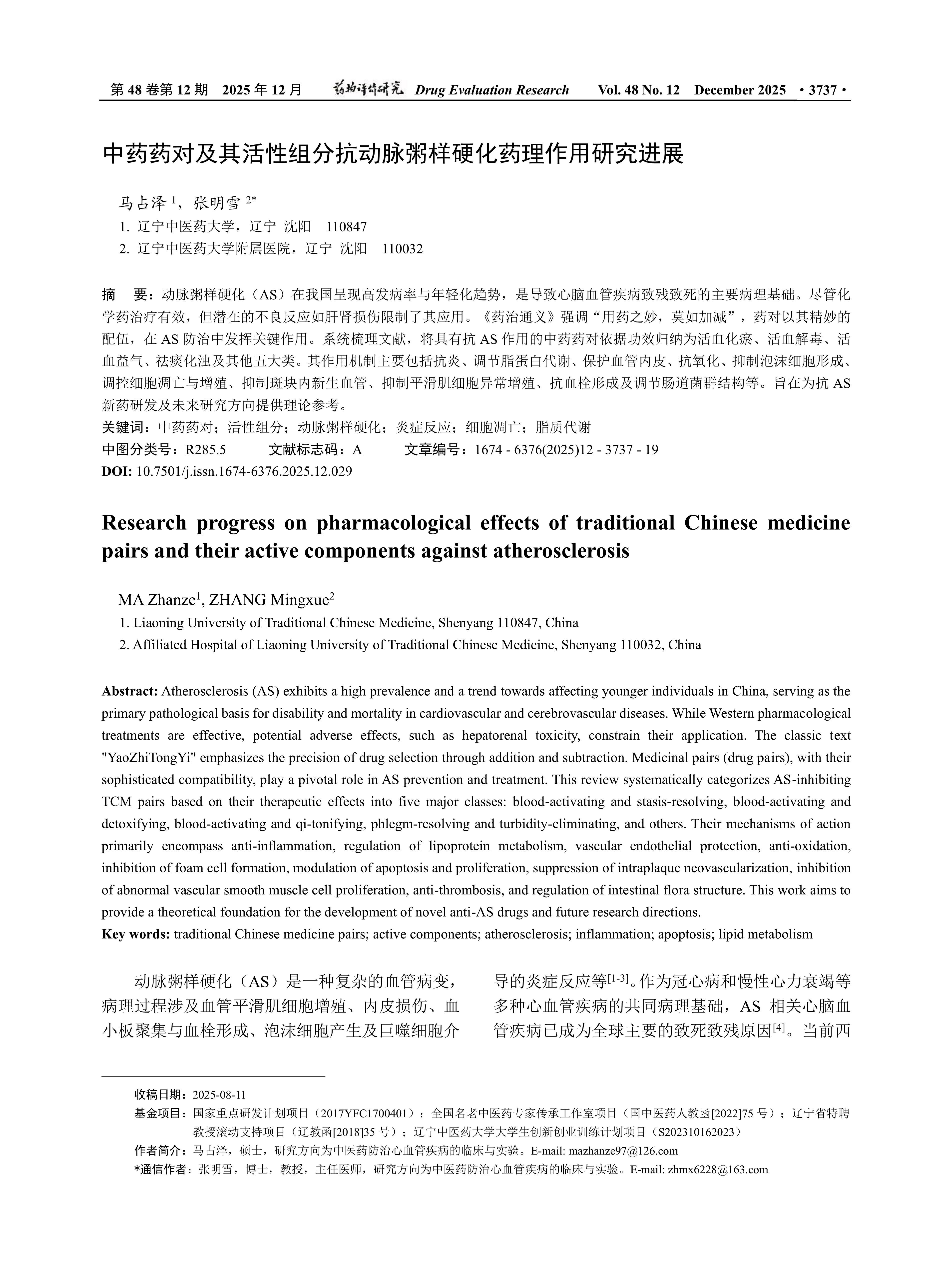 动脉粥样硬化(AS)在我国呈现高发病率与年轻化趋势,是导致心脑血管疾病致残致死的主要病理基础。尽管化学药治疗有效,但潜在的不良反应如肝肾损伤限制了其应用。《药治通义》强调“用药之妙,莫如加减”,药对以其精妙的配伍,在AS防治中发挥关键作用。系统梳理文献,将具有抗AS作用的中药药对依据功效归纳为活血化瘀、活血解毒、活血益气、祛痰化浊及其他五大类。其作用机制主要包括抗炎、调节脂蛋白代谢、保护血管内皮、抗氧化、抑制泡沫细胞形成、调控细胞凋亡与增殖、抑制斑块内新生血管、抑制平滑肌细胞异常增殖、抗血栓形成及调节肠道菌群结构等。旨在为抗AS新药研发及未来研究方向提供理论参考。