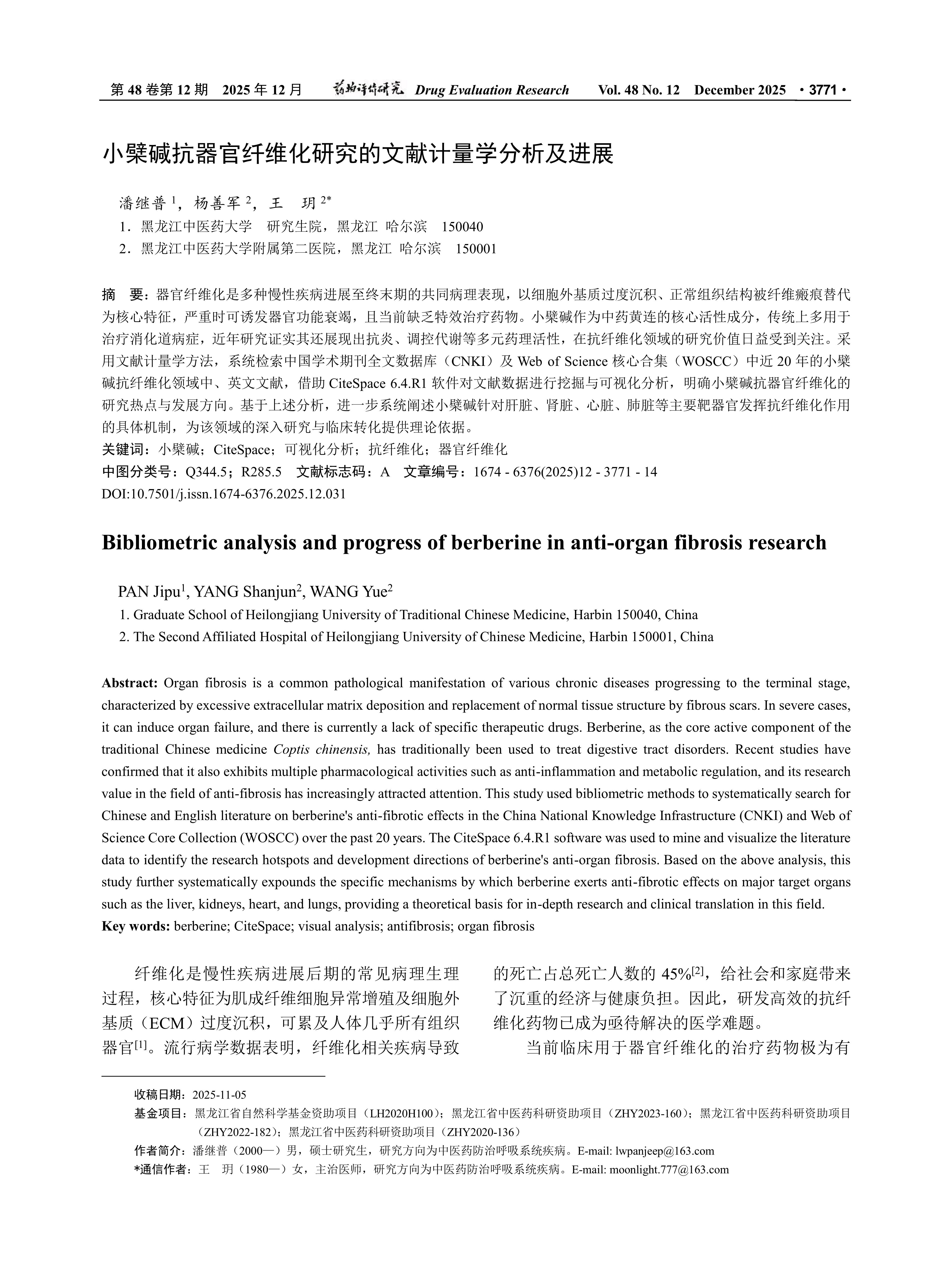 器官纤维化是多种慢性疾病进展至终末期的共同病理表现,以细胞外基质过度沉积、正常组织结构被纤维瘢痕替代为核心特征,严重时可诱发器官功能衰竭,且当前缺乏特效治疗药物。小檗碱作为中药黄连的核心活性成分,传统上多用于治疗消化道病症,近年研究证实其还展现出抗炎、调控代谢等多元药理活性,在抗纤维化领域的研究价值日益受到关注。采用文献计量学方法,系统检索中国学术期刊全文数据库( CNKI)及Web of Science核心合集( WOSCC)中近20年的小檗碱抗纤维化领域中、英文文献,借助CiteSpace 6.4.R1软件对文献数据进行挖掘与可视化分析,明确小檗碱抗器官纤维化的研究热点与发展方向。基于上述分析,进一步系统阐述小檗碱针对肝脏、肾脏、心脏、肺脏等主要靶器官发挥抗纤维化作用的具体机制,为该领域的深入研究与临床转化提供理论依据。