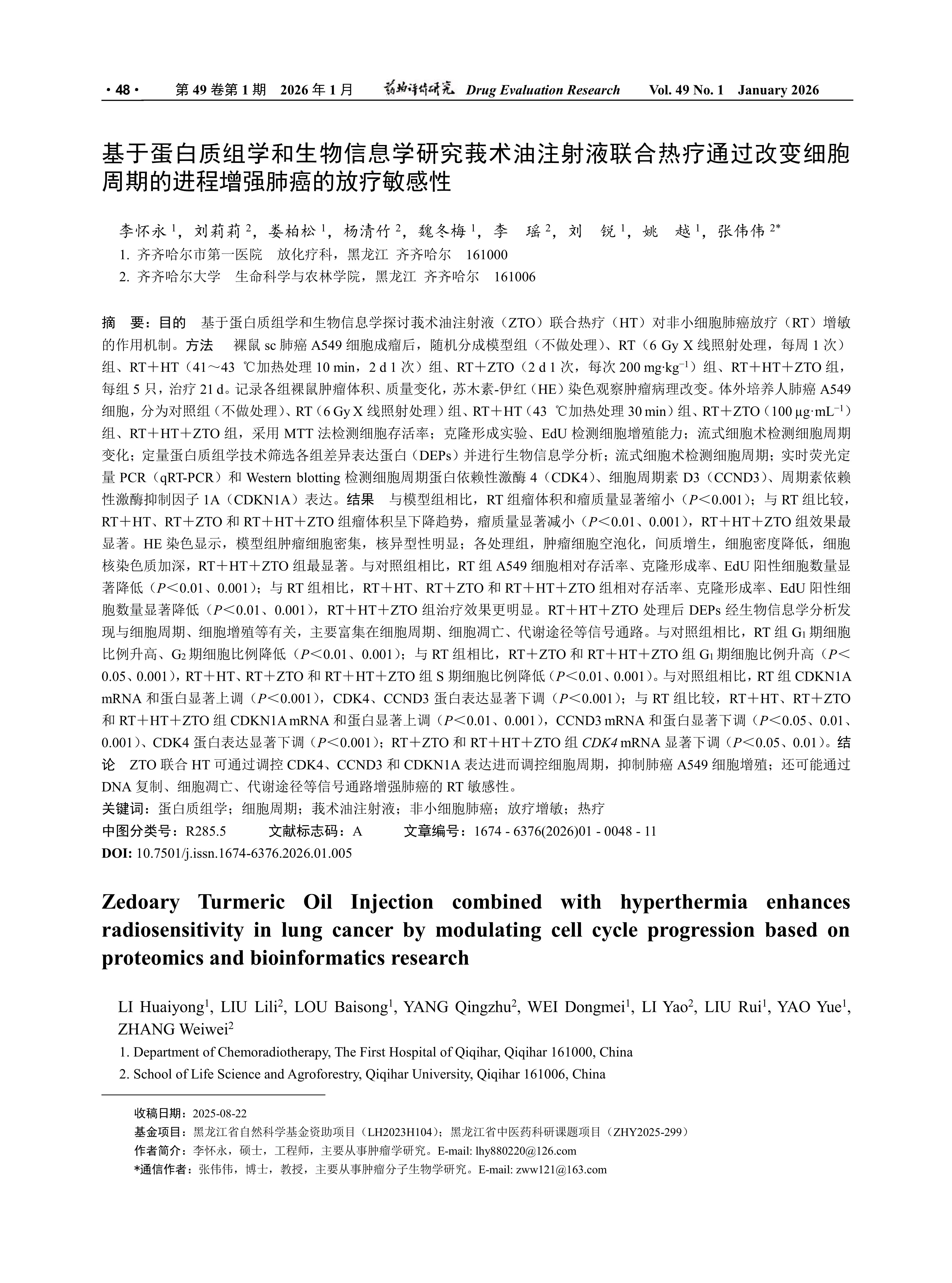 目的 基于蛋白质组学和生物信息学探讨莪术油注射液(ZTO)联合热疗(HT)对非小细胞肺癌放疗(RT)增敏的作用机制。方法 裸鼠sc肺癌A549细胞成瘤后,随机分成模型组(不做处理)、RT(6 Gy X线照射处理,每周1次)组、RT+HT(41~43℃加热处理10 min,2 d 1次)组、RT+ZTO(2 d 1次,每次200 mg·kg-1)组、RT+HT+ZTO组,每组5只,治疗21 d。记录各组裸鼠肿瘤体积、质量变化,苏木素-伊红(HE)染色观察肿瘤病理改变。体外培养人肺癌A549细胞,分为对照组(不做处理)、RT(6 Gy X线照射处理)组、RT+HT(43℃加热处理30 min)组、RT+ZTO(100μg·m L-1)组、RT+HT+ZTO组,采用MTT法检测细胞存活率;克隆形成实验、EdU检测细胞增殖能力;流式细胞术检测细胞周期变化;定量蛋白质组学技术筛选各组差异表达蛋白(DEPs)并进行生物信息学分析;流式细胞术检测细胞周期;实时荧光定量PCR(qRT-PCR)和Western blotting检测细胞周期蛋白依赖性激酶4(CDK4)、细胞周期素D3(CCND3)、周期素依赖性激酶抑制因子1A(CDKN1A)表达。结果 与模型组相比,RT组瘤体积和瘤质量显著缩小(P<0.001);与RT组比较,RT+HT、RT+ZTO和RT+HT+ZTO组瘤体积呈下降趋势,瘤质量显著减小(P<0.01、0.001),RT+HT+ZTO组效果最显著。HE染色显示,模型组肿瘤细胞密集,核异型性明显;各处理组,肿瘤细胞空泡化,间质增生,细胞密度降低,细胞核染色质加深,RT+HT+ZTO组最显著。与对照组相比,RT组A549细胞相对存活率、克隆形成率、EdU阳性细胞数量显著降低(P<0.01、0.001);与RT组相比,RT+HT、RT+ZTO和RT+HT+ZTO组相对存活率、克隆形成率、EdU阳性细胞数量显著降低(P<0.01、0.001),RT+HT+ZTO组治疗效果更明显。RT+HT+ZTO处理后DEPs经生物信息学分析发现与细胞周期、细胞增殖等有关,主要富集在细胞周期、细胞凋亡、代谢途径等信号通路。与对照组相比,RT组G1期细胞比例升高、G2期细胞比例降低(P<0.01、0.001);与RT组相比,RT+ZTO和RT+HT+ZTO组G1期细胞比例升高(P<0.05、0.001),RT+HT、RT+ZTO和RT+HT+ZTO组S期细胞比例降低(P<0.01、0.001)。与对照组相比,RT组CDKN1A mRNA和蛋白显著上调(P<0.001),CDK4、CCND3蛋白表达显著下调(P<0.001);与RT组比较,RT+HT、RT+ZTO和RT+HT+ZTO组CDKN1A mRNA和蛋白显著上调(P<0.01、0.001),CCND3 mRNA和蛋白显著下调(P<0.05、0.01、0.001)、CDK4蛋白表达显著下调(P<0.001);RT+ZTO和RT+HT+ZTO组CDK4 mRNA显著下调(P<0.05、0.01)。结论 ZTO联合HT可通过调控CDK4、CCND3和CDKN1A表达进而调控细胞周期,抑制肺癌A549细胞增殖;还可能通过DNA复制、细胞凋亡、代谢途径等信号通路增强肺癌的RT敏感性。