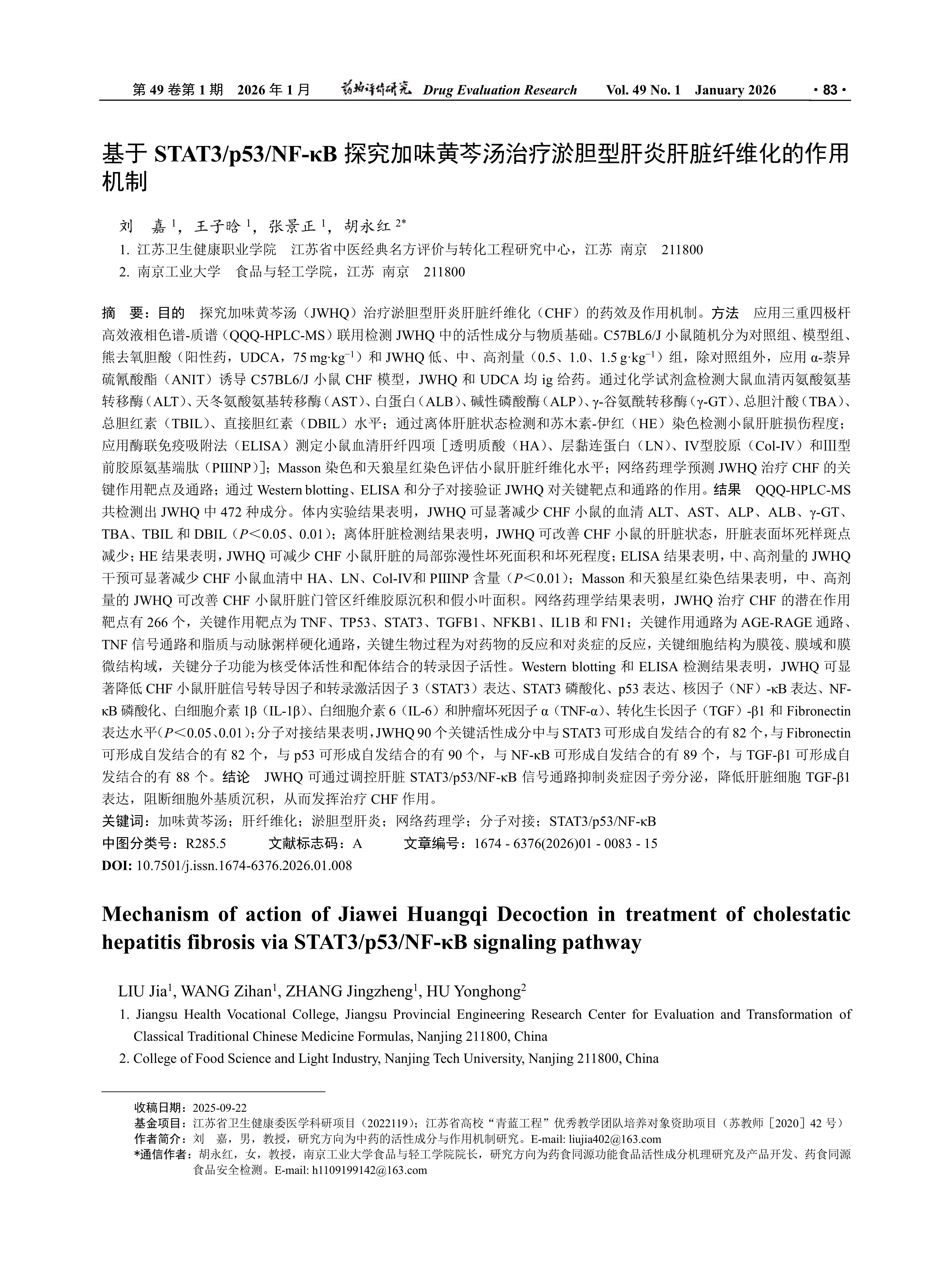 Objective To explore the efficacy and mechanism of action of JWHQ(JWHQ) in the treatment of cholestatic hepatitis fibrosis(CHF). Methods The active components and material basis of JWHQ were detected by triple quadrupole ultra-performance liquid chromatography-mass spectrometry(QQQ-HPLC-MS). C57 BL6/J mice were randomly divided into the control group, model group, ursodeoxycholic acid(positive drug, UDCA, 75 mg·kg-1) group and JWHQ low, medium and high dose(0.5, 1.0, 1.5 g·kg-1) groups. Except for the control group, the CHF model of C57 BL6/J mice was induced by α-naphthyl isothiocyanate(ANIT). JWHQ and UDCA were ig administered. The levels of alanine aminotransferase(ALT), aspartate aminotransferase(AST), albumin(ALB), alkaline phosphatase(ALP), γ-glutamyl transferase(γ-GT), total bile acid(TBA), total bilirubin(TBIL), and direct bilirubin(DBIL) in rat serum were detected by chemical reagent kits. The degree of liver injury in mice was detected by in vitro liver state detection and hematoxylin-eosin(HE) staining. The levels of liver fibrosis four items [hyaluronic acid(HA), laminin(LN), type IV collagen(Col-Ⅳ), and type III procollagen amino-terminal peptide(PⅢNP)] in mouse serum were determined by enzyme-linked immunosorbent assay(ELISA). The levels of liver fibrosis in mice were evaluated by Masson staining and Sirius red staining. Network pharmacology was used to predict the key targets and pathways of JWHQ in the treatment of CHF. The effects of JWHQ on key targets and pathways were verified by Western blotting, ELISA and molecular docking. Results A total of 472 components were detected in JWHQ by QQQ-HPLC-MS. The in vivo experimental results showed that JWHQ could significantly reduce the levels of serum ALT, AST, ALP, ALB, γ-GT, TBA, TBIL and DBIL in CHF mice(P <0.05, 0.01). The in vitro liver test results indicated that JWHQ could improve the liver condition of CHF mice, with a reduction in the number of necrotic-like spots on the liver surface. The HE results demonstrated that JWHQ could reduce the area and degree of local diffuse necrosis in the liver of CHF mice. The ELISA results showed that the medium and high doses of JWHQ intervention could significantly reduce the levels of HA, LN, Col-Ⅳ and PⅢNP in the serum of CHF mice(P <0.01). The Masson and Sirius Red staining results indicated that the medium and high doses of JWHQ could improve the fibrous collagen deposition in the portal area and the area of pseudolobules in the liver of CHF mice. The network pharmacology results suggested that there were 266 potential targets for JWHQ in the treatment of CHF, with the key targets being TNF, TP53, STAT3, TGFB1, NFKB1, IL1B and FN1. The key pathways were the AGE-RAGE pathway, TNF signaling pathway and lipid and atherosclerosis pathway. The key biological processes were the response to drugs and the response to inflammation. The key cellular structures were lipid rafts, membrane domains and membrane microdomains. The key molecular functions were nuclear receptor activity and ligand-binding transcription factor activity. The Western blotting and ELISA results indicated that JWHQ could significantly reduce the expression of signal transducer and activator of transcription 3(STAT3), phosphorylated STAT3, p53, nuclear factor(NF)-κB, phosphorylated NF-κB, interleukin 1β(IL-1β), interleukin 6(IL-6), tumor necrosis factor α(TNF-α), transforming growth factor(TGF)-β1 and Fibronectin in the liver of CHF mice(P <0.05, 0.01). The molecular docking results showed that among the 90 key active components of JWHQ, 82 could spontaneously bind to STAT3, 82 could spontaneously bind to Fibronectin, 90 could spontaneously bind to p53, 89 could spontaneously bind to NF-κB, and 88 could spontaneously bind to TGF-β1. Conclusion JWHQ can inhibit inflammatory factors by regulating the STAT3/p53/NF-κB in the liver, reduce the expression of TGF-β1 in liver cells, and block the deposition of extracellular matrix to treat CHF.