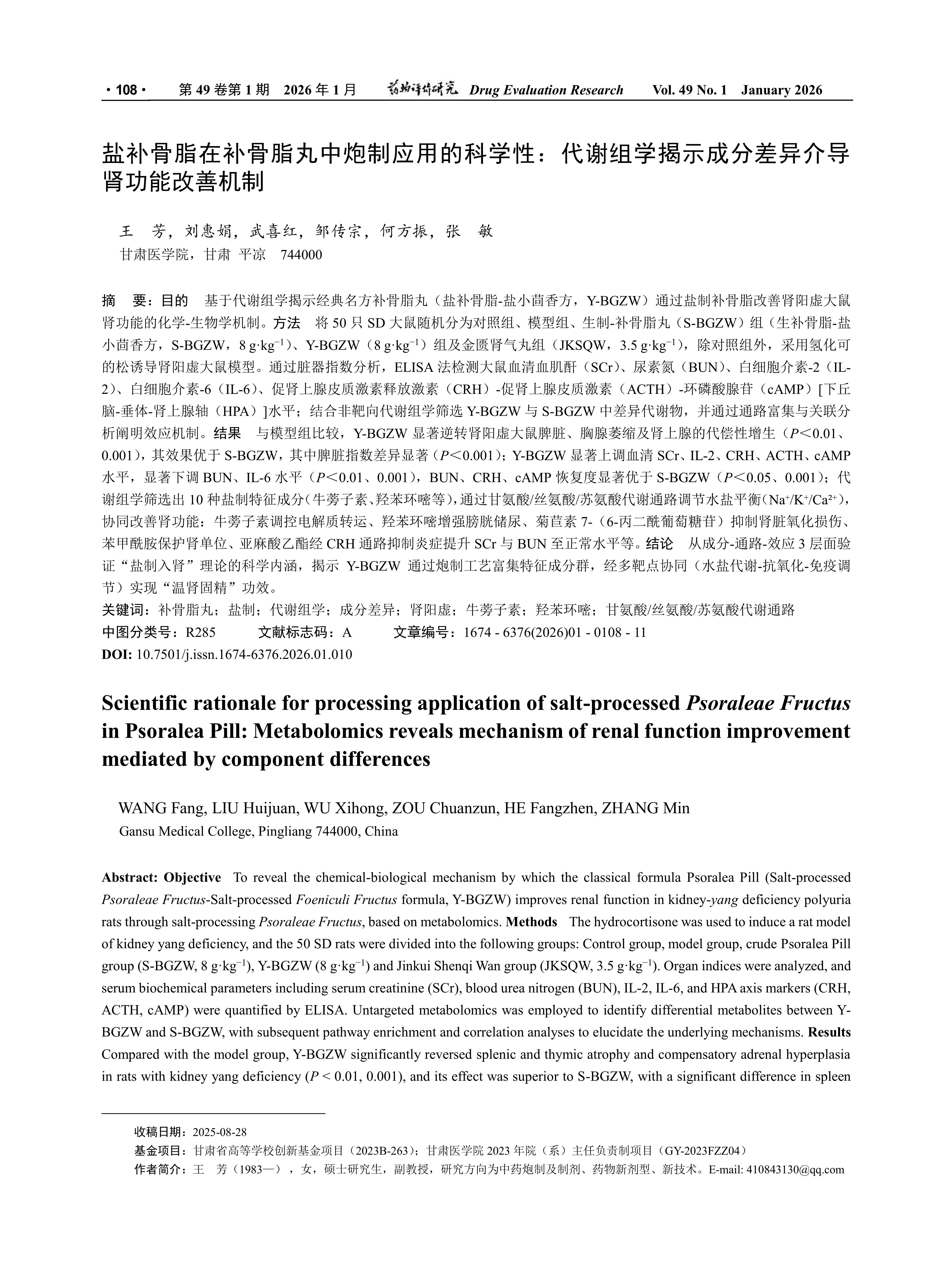 Objective To reveal the chemical-biological mechanism by which the classical formula Psoralea Pill(Salt-processed Psoraleae Fructus-Salt-processed Foeniculi Fructus formula, Y-BGZW) improves renal function in kidney-yang deficiency polyuria rats through salt-processing Psoraleae Fructus, based on metabolomics. Methods The hydrocortisone was used to induce a rat model of kidney yang deficiency, and the 50 SD rats were divided into the following groups: Control group, model group, crude Psoralea Pill group(S-BGZW, 8 g·kg-1), Y-BGZW(8 g·kg-1) and Jinkui Shenqi Wan group(JKSQW, 3.5 g·kg-1). Organ indices were analyzed, and serum biochemical parameters including serum creatinine(SCr), blood urea nitrogen(BUN), IL-2, IL-6, and HPA axis markers(CRH, ACTH, cAMP) were quantified by ELISA. Untargeted metabolomics was employed to identify differential metabolites between YBGZW and S-BGZW, with subsequent pathway enrichment and correlation analyses to elucidate the underlying mechanisms. Results Compared with the model group, Y-BGZW significantly reversed splenic and thymic atrophy and compensatory adrenal hyperplasia in rats with kidney yang deficiency(P <0.01, 0.001), and its effect was superior to S-BGZW, with a significant difference in spleen index(P <0.001); Y-BGZW significantly upregulated serum levels of SCr, IL-2, CRH, ACTH, and c AMP, and significantly downregulated levels of BUN and IL-6(P <0.01, 0.001). The recovery of BUN, CRH, and cAMP was significantly better than that of S-BGZW(P <0.05, 0.001). Metabolomics screening identified ten characteristic components of salt-processed Psoralea corylifolia(e.g., arctigenin, hydroxyphenylcyclamide), which regulated water-salt balance(Na+/K+/Ca2+) via the glycine/serine/threonine metabolic pathway and synergistically improved renal function:① Arctigenin regulates electrolyte transport.② Hydroxyphenylcyclamide enhances bladder urine storage.③ cichoriin 7-(6-malonylglucoside) inhibits renal oxidative damage.④ Benzamide protects nephrons, ethyl linolenate inhibits inflammation via the CRH pathway, and SCr/BUN levels are restored to normal. Conclusion This study validates the scientific foundation of the “salt-processing guiding to the kidney(Yanzhi Rushen)” theory from three dimensions—components, pathways, and effects, revealing that Y-BGZW enriches characteristic component clusters through its processing method. These components synergistically act on multiple targets(e.g., water-salt metabolism, antioxidant activity, and immune regulation) to achieve the traditional efficacy of “warming the kidney and consolidating essence(Wenshen Gujing)”.