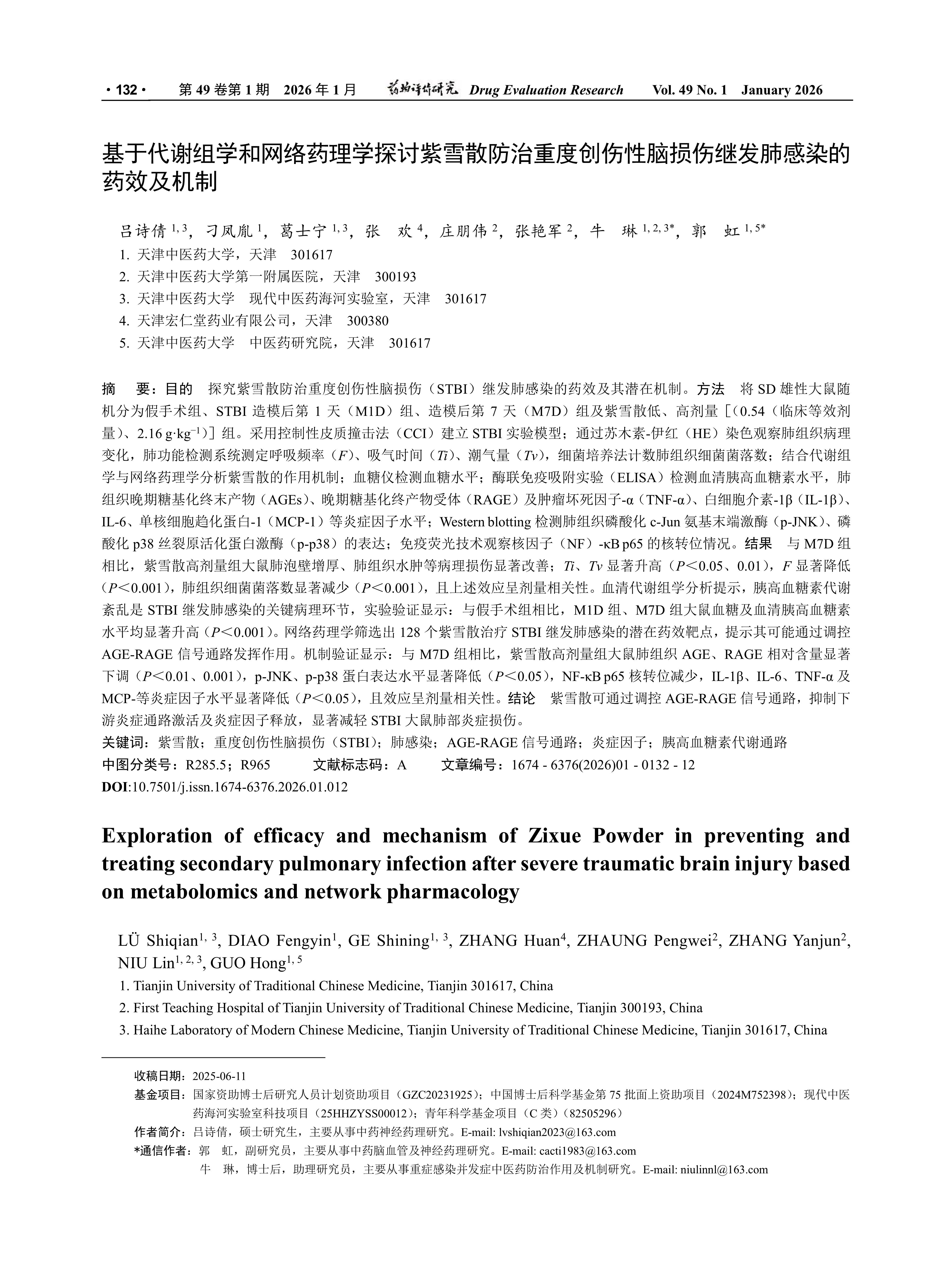 目的 探究紫雪散防治重度创伤性脑损伤(STBI)继发肺感染的药效及其潜在机制。方法 将SD雄性大鼠随机分为假手术组、STBI造模后第1天(M1D)组、造模后第7天(M7D)组及紫雪散低、高剂量[(0.54(临床等效剂量)、2.16 g·kg-1)]组。采用控制性皮质撞击法(CCI)建立STBI实验模型;通过苏木素-伊红(HE)染色观察肺组织病理变化,肺功能检测系统测定呼吸频率(F)、吸气时间(Ti)、潮气量(Tv),细菌培养法计数肺组织细菌菌落数;结合代谢组学与网络药理学分析紫雪散的作用机制;血糖仪检测血糖水平;酶联免疫吸附实验(ELISA)检测血清胰高血糖素水平,肺组织晚期糖基化终末产物(AGEs)、晚期糖基化终产物受体(RAGE)及肿瘤坏死因子-α(TNF-α)、白细胞介素-1β(IL-1β)、IL-6、单核细胞趋化蛋白-1(MCP-1)等炎症因子水平;Western blotting检测肺组织磷酸化c-Jun氨基末端激酶(p-JNK)、磷酸化p38丝裂原活化蛋白激酶(p-p38)的表达;免疫荧光技术观察核因子(NF)-κB p65的核转位情况。结果 与M7D组相比,紫雪散高剂量组大鼠肺泡壁增厚、肺组织水肿等病理损伤显著改善;Ti、Tv显著升高(P<0.05、0.01),F显著降低(P<0.001),肺组织细菌菌落数显著减少(P<0.001),且上述效应呈剂量相关性。血清代谢组学分析提示,胰高血糖素代谢紊乱是STBI继发肺感染的关键病理环节,实验验证显示:与假手术组相比,M1D组、M7D组大鼠血糖及血清胰高血糖素水平均显著升高(P<0.001)。网络药理学筛选出128个紫雪散治疗STBI继发肺感染的潜在药效靶点,提示其可能通过调控AGE-RAGE信号通路发挥作用。机制验证显示:与M7D组相比,紫雪散高剂量组大鼠肺组织AGE、RAGE相对含量显著下调(P<0.01、0.001),p-JNK、p-p38蛋白表达水平显著降低(P<0.05),NF-κB p65核转位减少,IL-1β、IL-6、TNF-α及MCP-等炎症因子水平显著降低(P<0.05),且效应呈剂量相关性。结论 紫雪散可通过调控AGE-RAGE信号通路,抑制下游炎症通路激活及炎症因子释放,显著减轻STBI大鼠肺部炎症损伤。