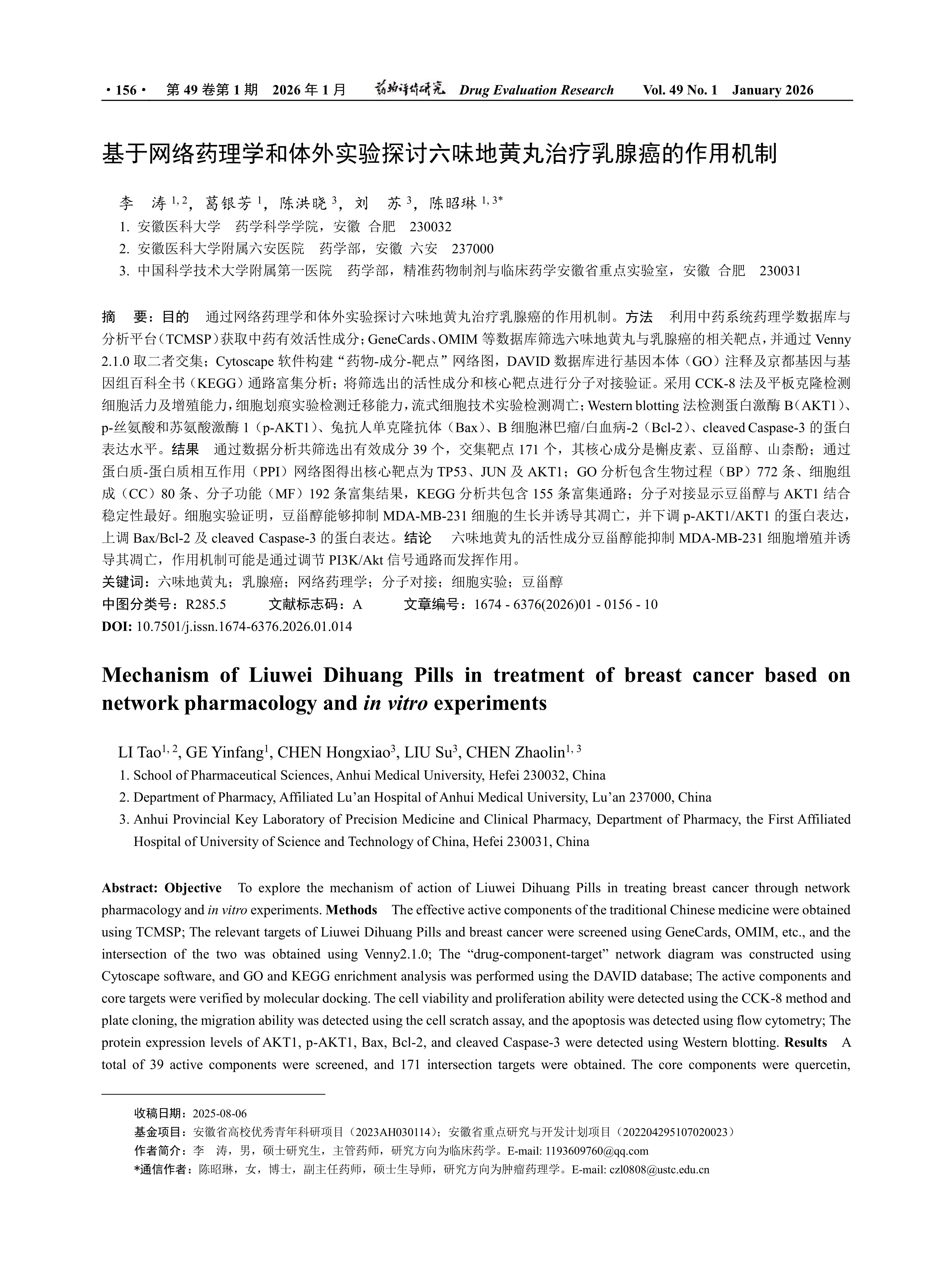 Objective To explore the mechanism of action of Liuwei Dihuang Pills in treating breast cancer through network pharmacology and in vitro experiments. Methods The effective active components of the traditional Chinese medicine were obtained using TCMSP; The relevant targets of Liuwei Dihuang Pills and breast cancer were screened using GeneCards, OMIM, etc., and the intersection of the two was obtained using Venny2.1.0; The “drug-component-target” network diagram was constructed using Cytoscape software, and GO and KEGG enrichment analysis was performed using the DAVID database; The active components and core targets were verified by molecular docking. The cell viability and proliferation ability were detected using the CCK-8 method and plate cloning, the migration ability was detected using the cell scratch assay, and the apoptosis was detected using flow cytometry; The protein expression levels of AKT1, p-AKT1, Bax, Bcl-2, and cleaved Caspase-3 were detected using Western blotting. Results A total of 39 active components were screened, and 171 intersection targets were obtained. The core components were quercetin, stigmasterol, and kaempferol. The core targets were determined to be TP53, JUN, and AKT1 using the protein-protein interaction(PPI) network. GO analysis included 772 biological process(BP), 80 cellular component(CC), and 192 molecular function(MF) enrichment results, and KEGG analysis included 155 enriched pathways. Molecular docking showed that stigmasterol had the best binding stability with AKT1. Cell experiments demonstrated that stigmasterol could inhibit the growth of MDA-MB-231 cells and induce their apoptosis, and down-regulate the protein expression of p-AKT1/AKT1, up-regulate the protein expression of Bax/Bcl-2 and cleaved Caspase-3. Conclusion The active component stigmasterol of Liuwei Dihuang Pills can inhibit the proliferation of MDA-MB-231 cells and induce their apoptosis. The mechanism may be through regulating the PI3K/Akt signaling pathways.