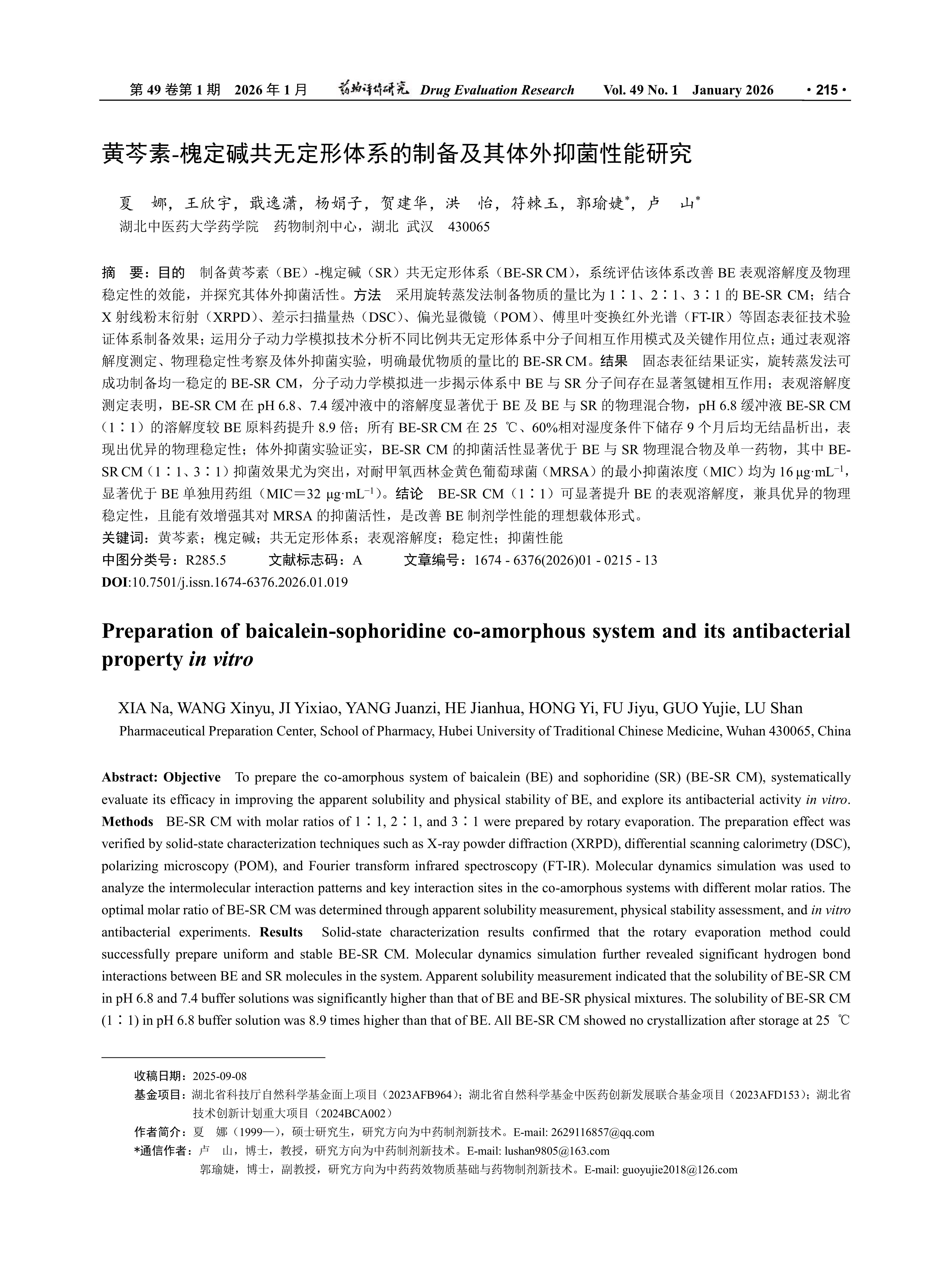 目的 制备黄芩素(BE)-槐定碱(SR)共无定形体系(BE-SR CM),系统评估该体系改善BE表观溶解度及物理稳定性的效能,并探究其体外抑菌活性。方法 采用旋转蒸发法制备物质的量比为1∶1、2∶1、3∶1的BE-SR CM;结合X射线粉末衍射(XRPD)、差示扫描量热(DSC)、偏光显微镜(POM)、傅里叶变换红外光谱(FT-IR)等固态表征技术验证体系制备效果;运用分子动力学模拟技术分析不同比例共无定形体系中分子间相互作用模式及关键作用位点;通过表观溶解度测定、物理稳定性考察及体外抑菌实验,明确最优物质的量比的BE-SR CM。结果 固态表征结果证实,旋转蒸发法可成功制备均一稳定的BE-SR CM,分子动力学模拟进一步揭示体系中BE与SR分子间存在显著氢键相互作用;表观溶解度测定表明,BE-SR CM在pH 6.8、7.4缓冲液中的溶解度显著优于BE及BE与SR的物理混合物,pH 6.8缓冲液BE-SR CM(1∶1)的溶解度较BE原料药提升8.9倍;所有BE-SR CM在25℃、60%相对湿度条件下储存9个月后均无结晶析出,表现出优异的物理稳定性;体外抑菌实验证实,BE-SR CM的抑菌活性显著优于BE与SR物理混合物及单一药物,其中BESR CM(1∶1、3∶1)抑菌效果尤为突出,对耐甲氧西林金黄色葡萄球菌(MRSA)的最小抑菌浓度(MIC)均为16μg·mL-1,显著优于BE单独用药组(MIC=32μg·mL-1)。结论 BE-SR CM(1∶1)可显著提升BE的表观溶解度,兼具优异的物理稳定性,且能有效增强其对MRSA的抑菌活性,是改善BE制剂学性能的理想载体形式。