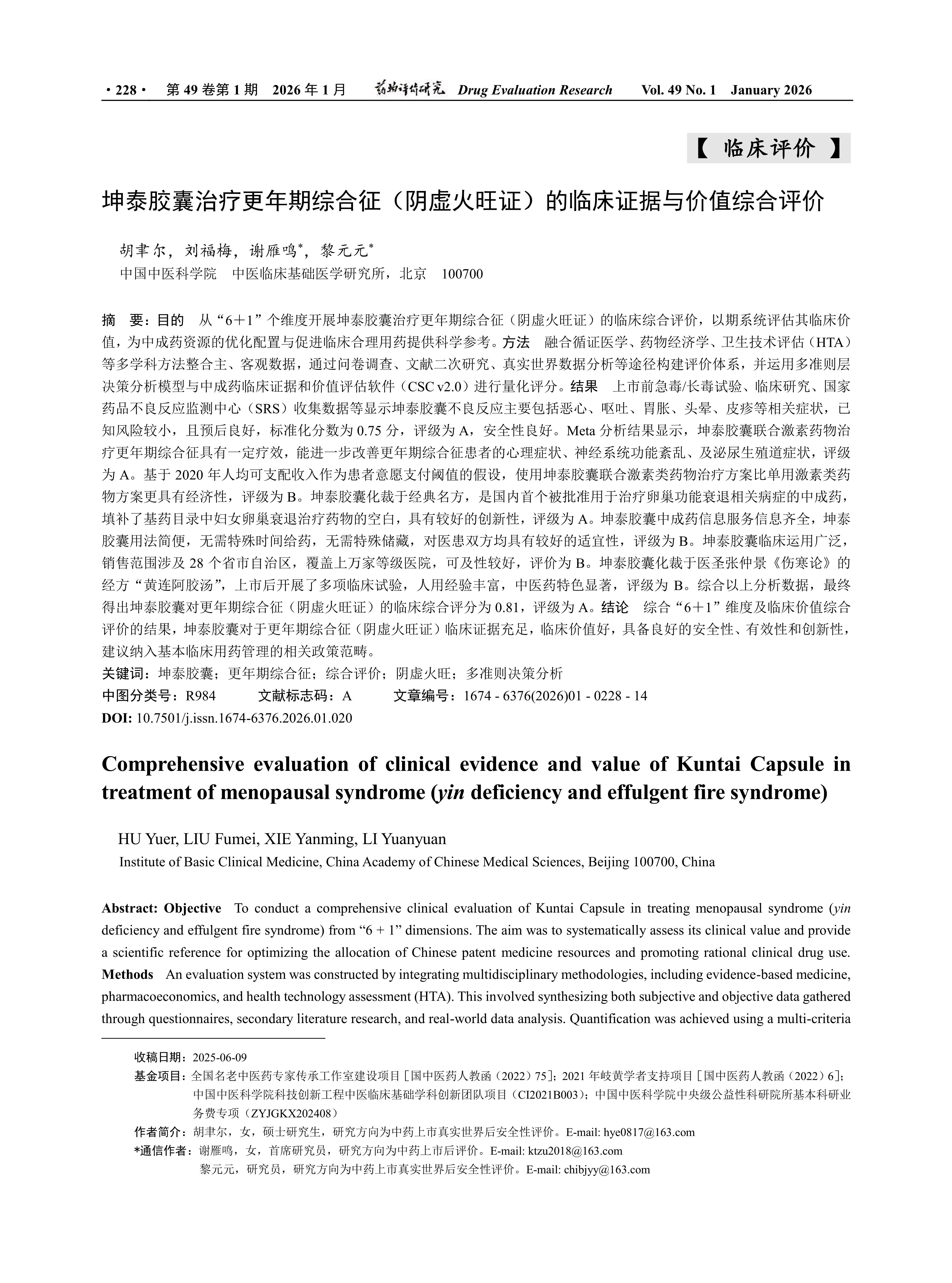 Objective To conduct a comprehensive clinical evaluation of Kuntai Capsule in treating menopausal syndrome(yin deficiency and effulgent fire syndrome) from “6 + 1” dimensions. The aim was to systematically assess its clinical value and provide a scientific reference for optimizing the allocation of Chinese patent medicine resources and promoting rational clinical drug use. Methods An evaluation system was constructed by integrating multidisciplinary methodologies, including evidence-based medicine, pharmacoeconomics, and health technology assessment(HTA). This involved synthesizing both subjective and objective data gathered through questionnaires, secondary literature research, and real-world data analysis. Quantification was achieved using a multi-criteria decision analysis(MCDA) model and CSC(v2.0) software. Results Safety(Grade A): Data from pre-clinical toxicity studies, clinical trials, and the National Center for ADR Monitoring indicate that adverse reactions to Kuntai Capsule are primarily mild(e.g., nausea, vomiting, abdominal distension, dizziness, rash). The known risks are low with a favorable prognosis, yielding a standardized score of 0.75. Effectiveness(Grade A): Meta-analysis results demonstrate that Kuntai Capsule combined with hormone therapy offers significant benefits, further improving vasomotor symptoms, neuropsychological symptoms, and urogenital symptoms in patients with menopausal syndrome. Economy(Grade B): Based on the assumption of using the 2020 per capita disposable income as the patient willingness-to-pay threshold, the combination therapy of Kuntai Capsule and hormones is more cost-effective than hormone therapy alone. Innovativeness(Grade A): Derived from a classic formula, Kuntai Capsule is the first Chinese patent medicine approved in China for conditions related to ovarian function decline, filling a gap in the National Essential Drug List for treating female ovarian. Suitability(Grade B): The drug information for this Chinese patent medicine is complete. Kuntai Capsule is easy to administer, requires no specific timing for intake or special storage conditions, showing good suitability for both clinicians and patients. Accessibility(Grade B): Kuntai Capsule is widely used clinically, with distribution covering 28 provinces/municipalities/autonomous regions and availability in over ten thousand hospitals of various grades, indicating good accessibility. Characteristics of Traditional Chinese Medicine(Grade B): Kuntai Capsule is based on the classical formula “Huanglian Ejiao Tang” from Zhang Zhongjing’s “Treatise on Cold Damage Diseases”. Multiple clinical trials have been conducted post-marketing, affirming its extensive human use experience and significant TCM characteristics. Comprehensive Score: The overall clinical evaluation score for Kuntai Capsule in treating menopausal syndrome(yin deficiency and effulgent fire syndrome) was 0.81, corresponding to a Grade A rating. Conclusion The comprehensive evaluation across the “6 + 1” dimensions indicates that Kuntai Capsule possesses sufficient clinical evidence and demonstrates good clinical value for menopausal syndrome(yin deficiency and effulgent fire syndrome). It exhibits favorable safety, effectiveness, and innovativeness, which is recommended to be included in the scope of relevant policies for basic clinical medication management.
