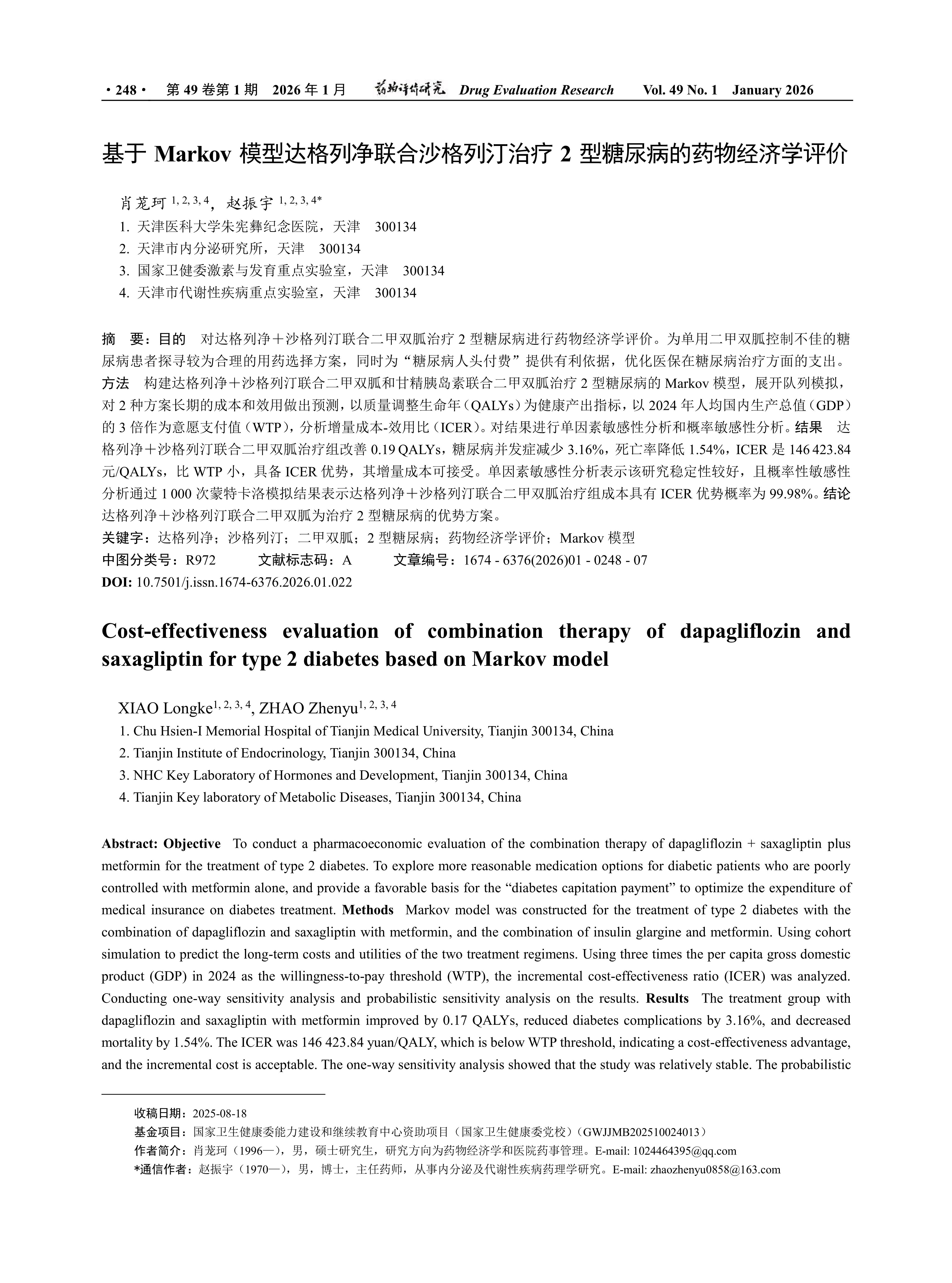 目的 对达格列净+沙格列汀联合二甲双胍治疗2型糖尿病进行药物经济学评价。为单用二甲双胍控制不佳的糖尿病患者探寻较为合理的用药选择方案,同时为“糖尿病人头付费”提供有利依据,优化医保在糖尿病治疗方面的支出。方法 构建达格列净+沙格列汀联合二甲双胍和甘精胰岛素联合二甲双胍治疗2型糖尿病的Markov模型,展开队列模拟,对2种方案长期的成本和效用做出预测,以质量调整生命年(QALYs)为健康产出指标,以2024年人均国内生产总值(GDP)的3倍作为意愿支付值(WTP),分析增量成本-效用比(ICER)。对结果进行单因素敏感性分析和概率敏感性分析。结果 达格列净+沙格列汀联合二甲双胍治疗组改善0.19 QALYs,糖尿病并发症减少3.16%,死亡率降低1.54%,ICER是146 423.84元/QALYs,比WTP小,具备ICER优势,其增量成本可接受。单因素敏感性分析表示该研究稳定性较好,且概率性敏感性分析通过1 000次蒙特卡洛模拟结果表示达格列净+沙格列汀联合二甲双胍治疗组成本具有ICER优势概率为99.98%。结论 达格列净+沙格列汀联合二甲双胍为治疗2型糖尿病的优势方案。