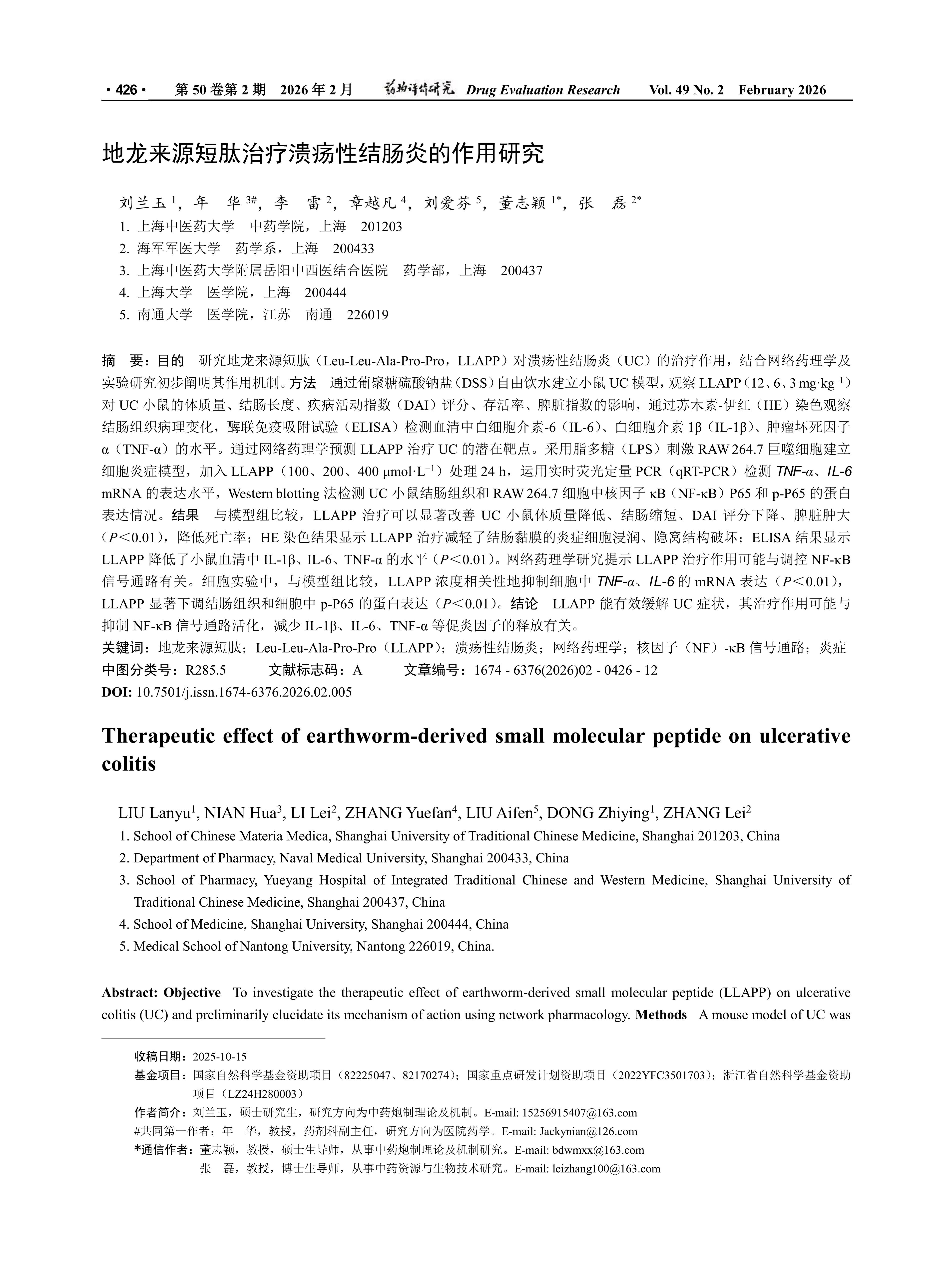 Objective To investigate the therapeutic effect of earthworm-derived small molecular peptide (LLAPP) on ulcerative colitis (UC) and preliminarily elucidate its mechanism of action using network pharmacology. Methods A mouse model of UC was established by administering dextran sulfate sodium (DSS) in drinking water. The effects of LLAPP on colon length, disease activity index (DAI) score, survival rate, and spleen index were evaluated. Pathological changes in colon tissue were observed via hematoxylin and eosin (HE) staining. Serum levels of interleukin-6 (IL-6), interleukin-1β (IL-1β), and tumor necrosis factor-α (TNF-α) were measured using enzyme-linked immunosorbent assay (ELISA). Potential targets of LLAPP in UC treatment were identified through network pharmacology. A cellular inflammation model was established by stimulating RAW 264.7 macrophages with lipopolysaccharide (LPS), and different doses of LLAPP were administered. The mRNA expression of TNF-α and IL-6 was detected using real-time quantitative PCR (qRT-PCR), and the protein expression of P65, and phosphorylated P65 (p-P65) in colon tissues and RAW 264.7 cells was measured via Western blotting. Results LLAPP treatment ameliorated colon shortening (P < 0.01), reduced DAI scores, improved survival rates, and alleviated spleen enlargement (P < 0.01) in UC mice. HE staining showed that LLAPP reduced inflammatory cell infiltration and crypt structural damage in the colonic mucosa. ELISA results indicated that LLAPP decreased serum levels of IL-1β, IL-6, and TNF-α (P < 0.01). Network pharmacology suggested that the therapeutic effect of LLAPP might be associated with the regulation of the nuclear factor kappa B (NF-κB) signaling pathway. LLAPP concentration-dependently inhibited mRNA expression of TNF-α and IL-6 in cells (P < 0.01). Western blotting analysis revealed that LLAPP downregulated p-P65 protein expression in colon tissues and cells (P < 0.01). Conclusion Earthworm-derived small molecular peptide (LLAPP) effectively alleviates symptoms of ulcerative colitis, potentially by inhibiting the activation of the NF-κB signaling pathway and reducing the release of pro-inflammatory cytokines such as IL-1β, IL-6, and TNF-α.