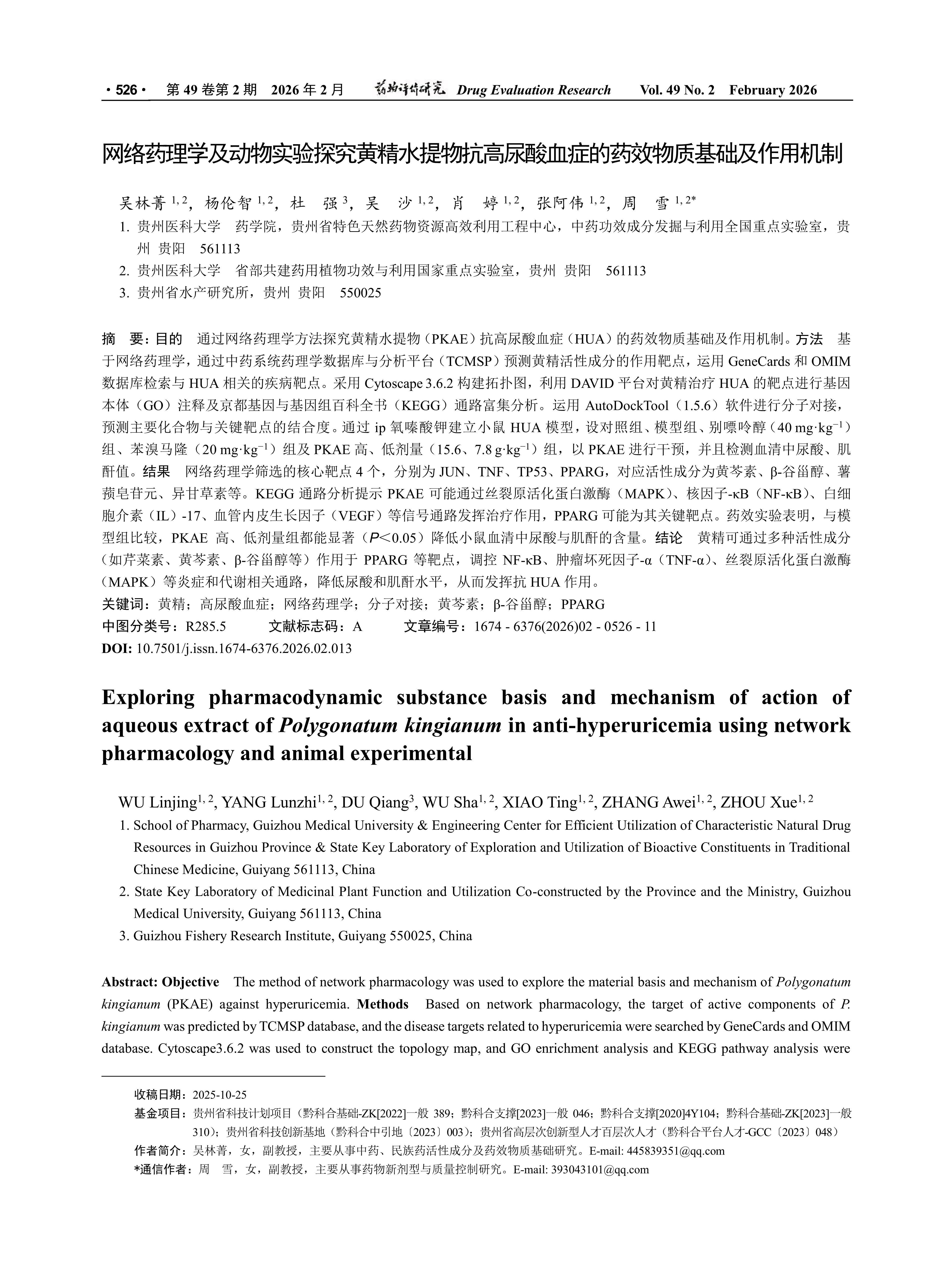 目的 通过网络药理学方法探究黄精水提物(PKAE)抗高尿酸血症(HUA)的药效物质基础及作用机制。方法 基于网络药理学,通过中药系统药理学数据库与分析平台(TCMSP)预测黄精活性成分的作用靶点,运用GeneCards和OMIM数据库检索与HUA相关的疾病靶点。采用Cytoscape 3.6.2构建拓扑图,利用DAVID平台对黄精治疗HUA的靶点进行基因本体(GO)注释及京都基因与基因组百科全书(KEGG)通路富集分析。运用AutoDockTool(1.5.6)软件进行分子对接,预测主要化合物与关键靶点的结合度。通过ip氧嗪酸钾建立小鼠HUA模型,设对照组、模型组、别嘌呤醇(40 mg·kg-1)组、苯溴马隆(20 mg·kg-1)组及PKAE高、低剂量(15.6、7.8 g·kg-1)组,以PKAE进行干预,并且检测血清中尿酸、肌酐值。结果 网络药理学筛选的核心靶点4个,分别为JUN、TNF、TP53、PPARG,对应活性成分为黄芩素、β-谷甾醇、薯蓣皂苷元、异甘草素等。KEGG通路分析提示PKAE可能通过丝裂原活化蛋白激酶(MAPK)、核因子-κB(NF-κB)、白细胞介素(IL)-17、血管内皮生长因子(VEGF)等信号通路发挥治疗作用,PPARG可能为其关键靶点。药效实验表明,与模型组比较,PKAE高、低剂量组都能显著(P<0.05)降低小鼠血清中尿酸与肌酐的含量。结论 黄精可通过多种活性成分(如芹菜素、黄芩素、β-谷甾醇等)作用于PPARG等靶点,调控NF-κB、肿瘤坏死因子-α(TNF-α)、丝裂原活化蛋白激酶(MAPK)等炎症和代谢相关通路,降低尿酸和肌酐水平,从而发挥抗HUA作用。