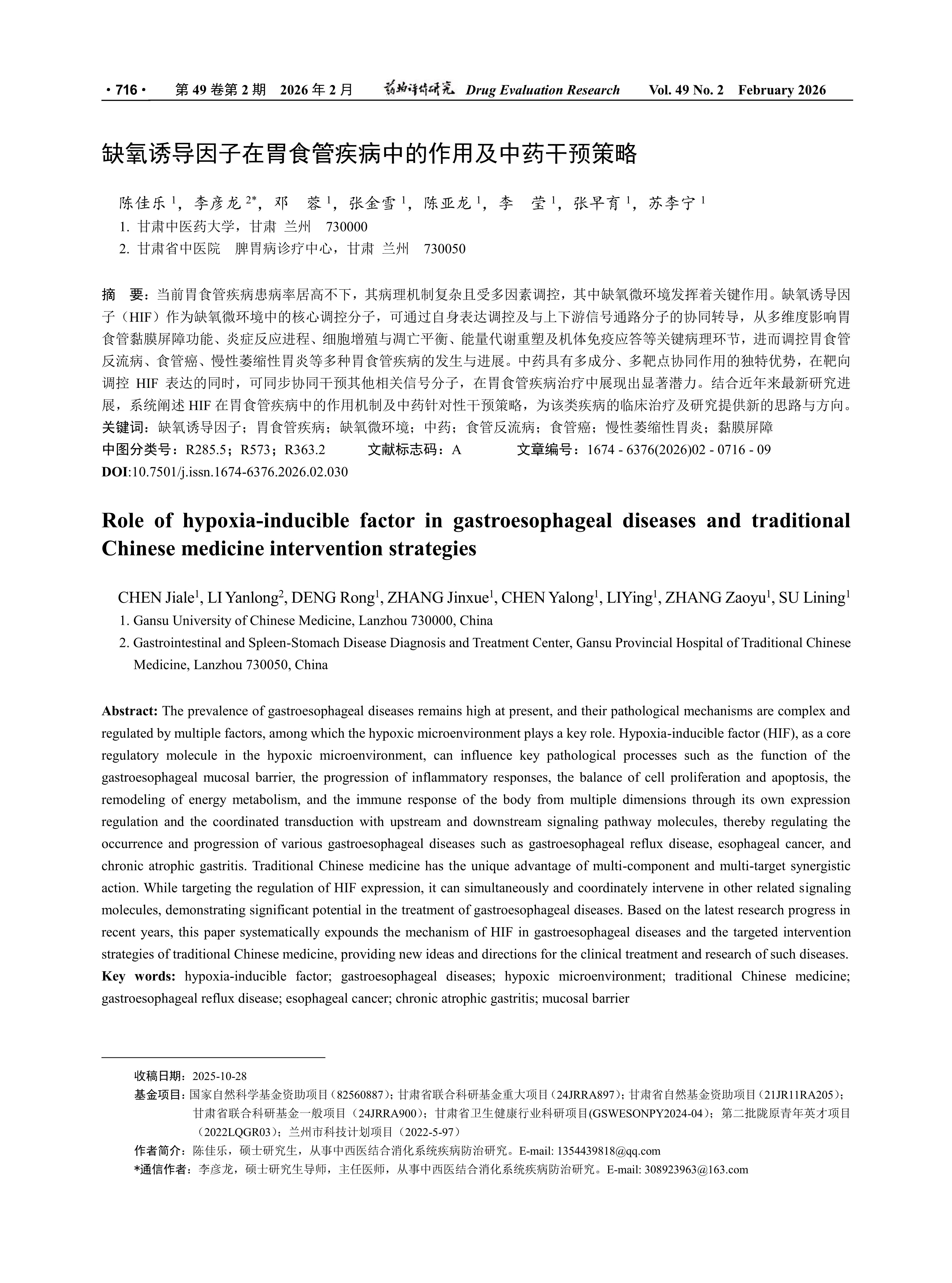 当前胃食管疾病患病率居高不下,其病理机制复杂且受多因素调控,其中缺氧微环境发挥着关键作用。缺氧诱导因子(HIF)作为缺氧微环境中的核心调控分子,可通过自身表达调控及与上下游信号通路分子的协同转导,从多维度影响胃食管黏膜屏障功能、炎症反应进程、细胞增殖与凋亡平衡、能量代谢重塑及机体免疫应答等关键病理环节,进而调控胃食管反流病、食管癌、慢性萎缩性胃炎等多种胃食管疾病的发生与进展。中药具有多成分、多靶点协同作用的独特优势,在靶向调控HIF表达的同时,可同步协同干预其他相关信号分子,在胃食管疾病治疗中展现出显著潜力。结合近年来最新研究进展,系统阐述HIF在胃食管疾病中的作用机制及中药针对性干预策略,为该类疾病的临床治疗及研究提供新的思路与方向。