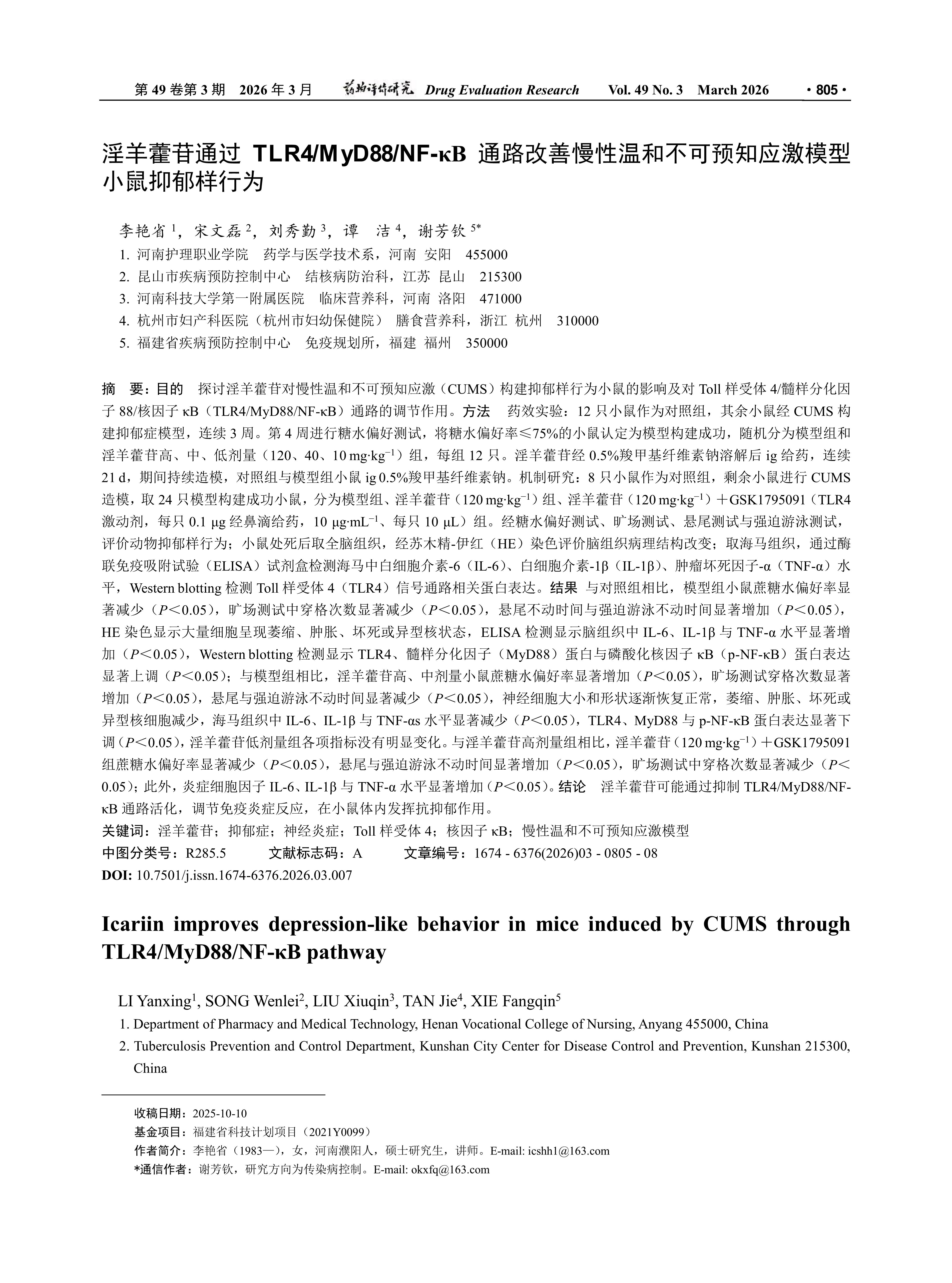目的 探讨淫羊藿苷对慢性温和不可预知应激(CUMS)构建抑郁样行为小鼠的影响及对Toll样受体4/髓样分化因子88/核因子κB(TLR4/MyD88/NF-κB)通路的调节作用。方法 药效实验:12只小鼠作为对照组,其余小鼠经CUMS构建抑郁症模型,连续3周。第4周进行糖水偏好测试,将糖水偏好率≤75%的小鼠认定为模型构建成功,随机分为模型组和淫羊藿苷高、中、低剂量(120、40、10 mg·kg-1)组,每组12只。淫羊藿苷经0.5%羧甲基纤维素钠溶解后ig给药,连续21 d,期间持续造模,对照组与模型组小鼠ig 0.5%羧甲基纤维素钠。机制研究:8只小鼠作为对照组,剩余小鼠进行CUMS造模,取24只模型构建成功小鼠,分为模型组、淫羊藿苷(120 mg·kg-1)组、淫羊藿苷(120 mg·kg-1)+GSK1795091(TLR4激动剂,每只0.1μg经鼻滴给药,10μg·mL-1、每只10μL)组。经糖水偏好测试、旷场测试、悬尾测试与强迫游泳测试,评价动物抑郁样行为;小鼠处死后取全脑组织,经苏木精-伊红(HE)染色评价脑组织病理结构改变;取海马组织,通过酶联免疫吸附试验(ELISA)试剂盒检测海马中白细胞介素-6(IL-6)、白细胞介素-1β(IL-1β)、肿瘤坏死因子-α(TNF-α)水平,Western blotting检测Toll样受体4(TLR4)信号通路相关蛋白表达。结果 与对照组相比,模型组小鼠蔗糖水偏好率显著减少(P<0.05),旷场测试中穿格次数显著减少(P<0.05),悬尾不动时间与强迫游泳不动时间显著增加(P<0.05),HE染色显示大量细胞呈现萎缩、肿胀、坏死或异型核状态,ELISA检测显示脑组织中IL-6、IL-1β与TNF-α水平显著增加(P<0.05),Western blotting检测显示TLR4、髓样分化因子(MyD88)蛋白与磷酸化核因子κB(p-NF-κB)蛋白表达显著上调(P<0.05);与模型组相比,淫羊藿苷高、中剂量小鼠蔗糖水偏好率显著增加(P<0.05),旷场测试穿格次数显著增加(P<0.05),悬尾与强迫游泳不动时间显著减少(P<0.05),神经细胞大小和形状逐渐恢复正常,萎缩、肿胀、坏死或异型核细胞减少,海马组织中IL-6、IL-1β与TNF-αs水平显著减少(P<0.05),TLR4、MyD88与p-NF-κB蛋白表达显著下调(P<0.05),淫羊藿苷低剂量组各项指标没有明显变化。与淫羊藿苷高剂量组相比,淫羊藿苷(120 mg·kg-1)+GSK1795091组蔗糖水偏好率显著减少(P<0.05),悬尾与强迫游泳不动时间显著增加(P<0.05),旷场测试中穿格次数显著减少(P<0.05);此外,炎症细胞因子IL-6、IL-1β与TNF-α水平显著增加(P<0.05)。结论 淫羊藿苷可能通过抑制TLR4/MyD88/NF-κB通路活化,调节免疫炎症反应,在小鼠体内发挥抗抑郁作用。