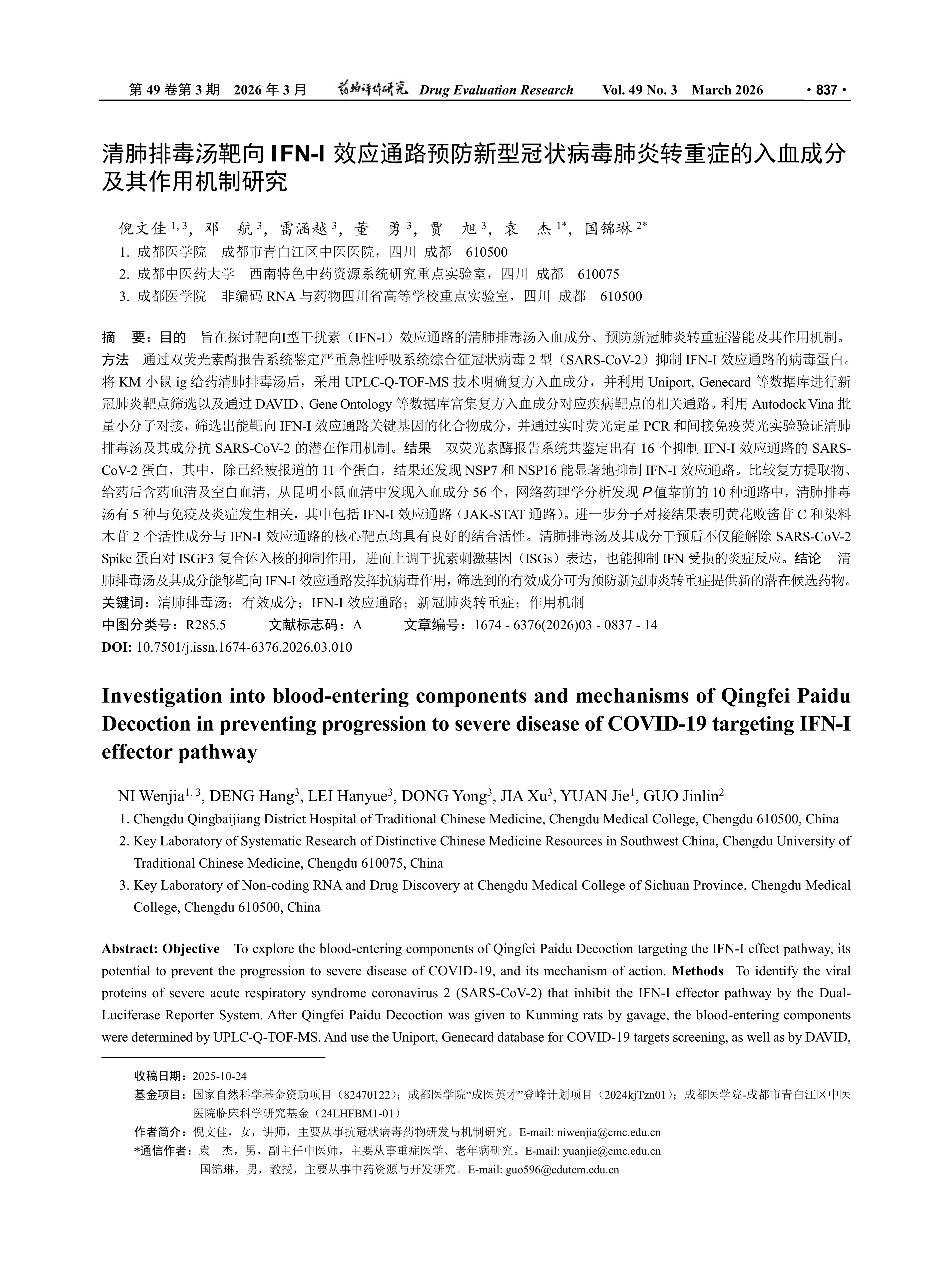目的 旨在探讨靶向Ⅰ型干扰素(IFN-I)效应通路的清肺排毒汤入血成分、预防新冠肺炎转重症潜能及其作用机制。方法 通过双荧光素酶报告系统鉴定严重急性呼吸系统综合征冠状病毒2型(SARS-CoV-2)抑制IFN-I效应通路的病毒蛋白。将KM小鼠ig给药清肺排毒汤后,采用UPLC-Q-TOF-MS技术明确复方入血成分,并利用Uniport, Genecard等数据库进行新冠肺炎靶点筛选以及通过DAVID、Gene Ontology等数据库富集复方入血成分对应疾病靶点的相关通路。利用Autodock Vina批量小分子对接,筛选出能靶向IFN-I效应通路关键基因的化合物成分,并通过实时荧光定量PCR和间接免疫荧光实验验证清肺排毒汤及其成分抗SARS-CoV-2的潜在作用机制。结果 双荧光素酶报告系统共鉴定出有16个抑制IFN-I效应通路的SARSCo V-2蛋白,其中,除已经被报道的11个蛋白,结果还发现NSP7和NSP16能显著地抑制IFN-I效应通路。比较复方提取物、给药后含药血清及空白血清,从昆明小鼠血清中发现入血成分56个,网络药理学分析发现P值靠前的10种通路中,清肺排毒汤有5种与免疫及炎症发生相关,其中包括IFN-I效应通路(JAK-STAT通路)。进一步分子对接结果表明黄花败酱苷C和染料木苷2个活性成分与IFN-I效应通路的核心靶点均具有良好的结合活性。清肺排毒汤及其成分干预后不仅能解除SARS-CoV-2Spike蛋白对ISGF3复合体入核的抑制作用,进而上调干扰素刺激基因(ISGs)表达,也能抑制IFN受损的炎症反应。结论 清肺排毒汤及其成分能够靶向IFN-I效应通路发挥抗病毒作用,筛选到的有效成分可为预防新冠肺炎转重症提供新的潜在候选药物。