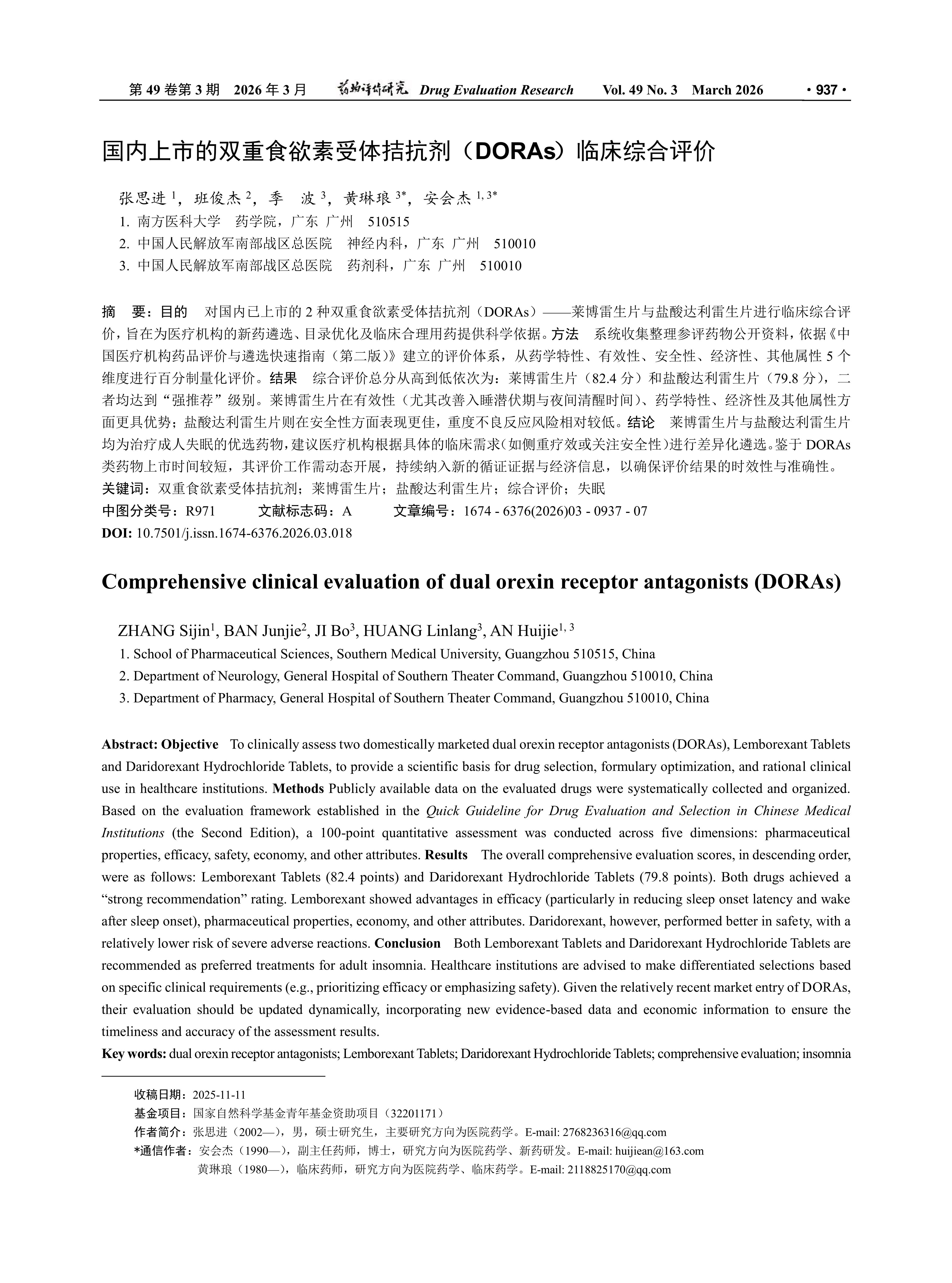 目的 对国内已上市的2种双重食欲素受体拮抗剂(DORAs)——莱博雷生片与盐酸达利雷生片进行临床综合评价,旨在为医疗机构的新药遴选、目录优化及临床合理用药提供科学依据。方法 系统收集整理参评药物公开资料,依据《中国医疗机构药品评价与遴选快速指南(第二版)》建立的评价体系,从药学特性、有效性、安全性、经济性、其他属性5个维度进行百分制量化评价。结果 综合评价总分从高到低依次为:莱博雷生片(82.4分)和盐酸达利雷生片(79.8分),二者均达到“强推荐”级别。莱博雷生片在有效性(尤其改善入睡潜伏期与夜间清醒时间)、药学特性、经济性及其他属性方面更具优势;盐酸达利雷生片则在安全性方面表现更佳,重度不良反应风险相对较低。结论 莱博雷生片与盐酸达利雷生片均为治疗成人失眠的优选药物,建议医疗机构根据具体的临床需求(如侧重疗效或关注安全性)进行差异化遴选。鉴于DORAs类药物上市时间较短,其评价工作需动态开展,持续纳入新的循证证据与经济信息,以确保评价结果的时效性与准确性。