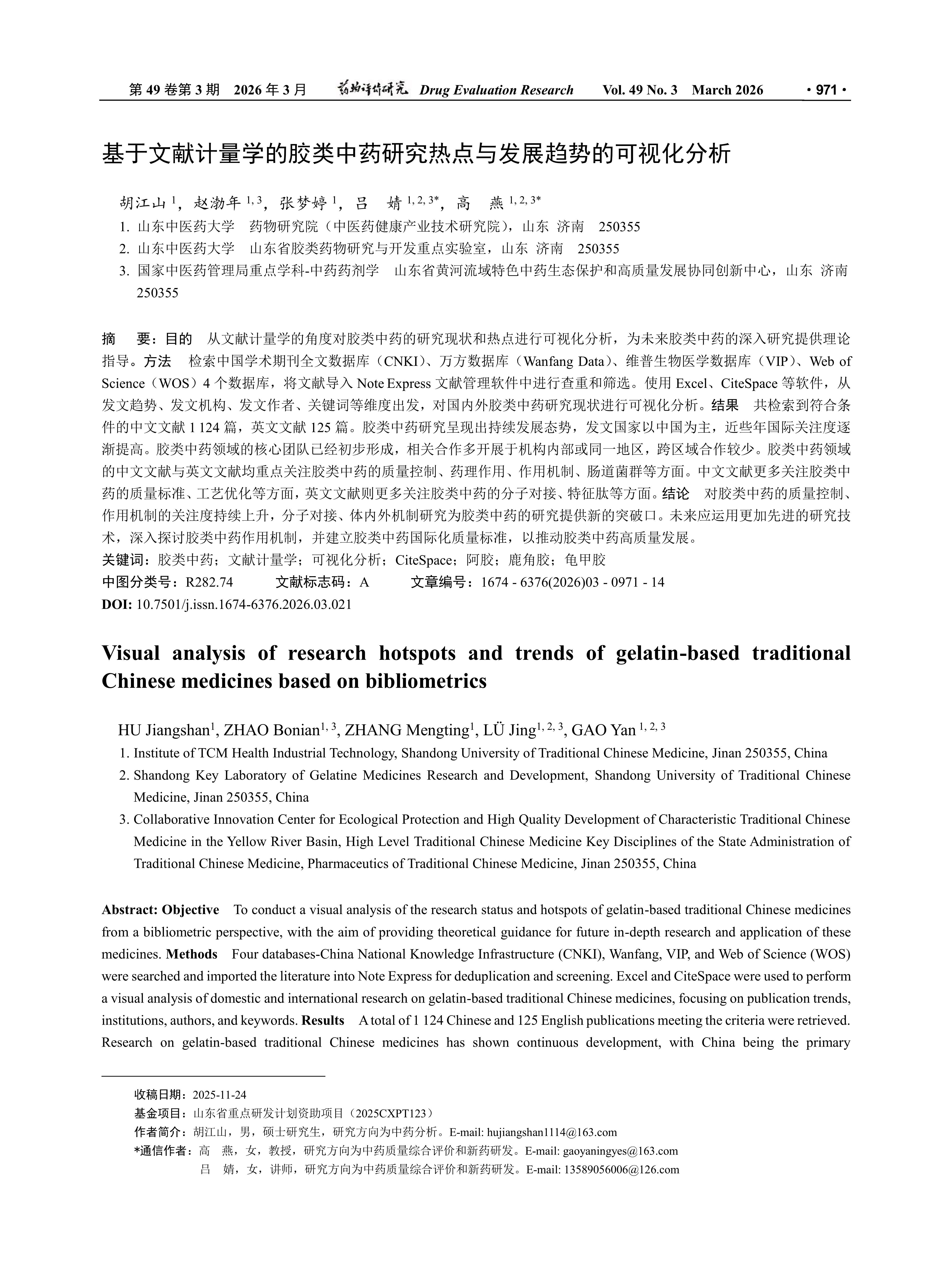 Objective To conduct a visual analysis of the research status and hotspots of gelatin-based traditional Chinese medicines from a bibliometric perspective, with the aim of providing theoretical guidance for future in-depth research and application of these medicines. Methods Four databases-China National Knowledge Infrastructure(CNKI), Wanfang, VIP, and Web of Science(WOS) were searched and imported the literature into Note Express for deduplication and screening. Excel and CiteSpace were used to perform a visual analysis of domestic and international research on gelatin-based traditional Chinese medicines, focusing on publication trends, institutions, authors, and keywords. Results A total of 1 124 Chinese and 125 English publications meeting the criteria were retrieved. Research on gelatin-based traditional Chinese medicines has shown continuous development, with China being the primary contributing country, though international attention has gradually increased in recent years. Core research teams in this field have begun to form, with collaborations mostly occurring within institutions or the same region, and cross-regional cooperation being relatively limited. Both Chinese and English literature in this field focus on quality control, pharmacological effects, mechanisms of action, and gut microbiota related to gelatin-based traditional Chinese medicines. Chinese literature places more emphasis on quality standards and process optimization, while English literature tends to focus more on molecular docking and characteristic peptides. Conclusion Interest in the quality control and mechanisms of action of gelatin-based traditional Chinese medicines continues to rise. Molecular docking and in vivo and in vitro mechanism studies have provided new breakthroughs for research in this field. In the future, more advanced research technologies should be applied to further explore the mechanisms of action of gelatin-based traditional Chinese medicines and establish international standards to promote their high-quality development.