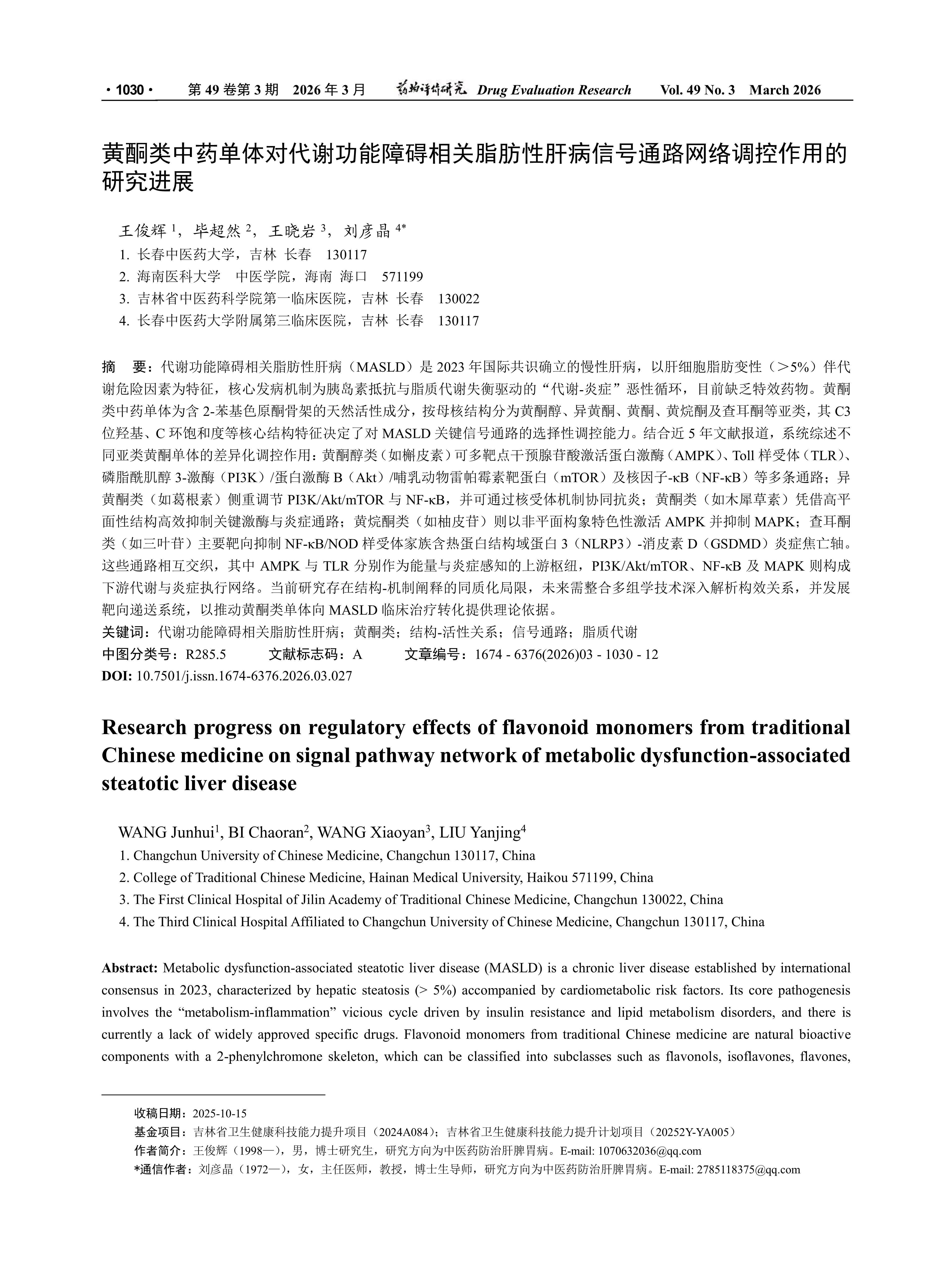 Metabolic dysfunction-associated steatotic liver disease(MASLD) is a chronic liver disease established by international consensus in 2023, characterized by hepatic steatosis(> 5%) accompanied by cardiometabolic risk factors. Its core pathogenesis involves the “metabolism-inflammation” vicious cycle driven by insulin resistance and lipid metabolism disorders, and there is currently a lack of widely approved specific drugs. Flavonoid monomers from traditional Chinese medicine are natural bioactive components with a 2-phenylchromone skeleton, which can be classified into subclasses such as flavonols, isoflavones, flavones, flavanones, and chalcones based on their parent nucleus structures. Their core structural features(e.g., C3 hydroxyl group, C-ring saturation, and B-ring attachment position) directly determine their selective regulatory capacity on key signaling pathways of MASLD. Based on relevant literature published in the past five years, this review systematically summarizes the differential regulatory effects of flavonoid monomers from different subclasses: Flavonols(e.g., quercetin) exert multi-targeted intervention on multiple pathways including AMPK, PI3K/Akt/mTOR, and NF-κB; isoflavones(e.g., puerarin) mainly regulate PI3K/Akt/mTOR and NF-κB pathways, and may synergistically exert anti-inflammatory effects through nuclear receptor mechanisms; Flavones(e.g., luteolin) efficiently inhibit key kinases and inflammatory pathways by virtue of their high planarity; Flavanones(e.g., naringin) characteristically activate AMPK and inhibit MAPK with their non-planar conformation; chalcones(e.g., trilobatin) primarily target and inhibit the NF-κB/NLRP3-GSDMD inflammatory pyroptosis axis. These pathways are interconnected: AMPK and TLR serve as upstream hubs for energy and inflammation sensing, respectively, while PI3K/Akt/mTOR, NF-κB, and MAPK constitute the downstream execution network for metabolism and inflammation. Current studies have limitations such as homogenization in the interpretation of structuremechanism relationships. In the future, it is necessary to integrate multi-omics technologies to deeply analyze the structure-activity relationship and develop targeted delivery systems, so as to provide a theoretical basis for promoting the clinical transformation of flavonoid monomers in the treatment of MASLD.