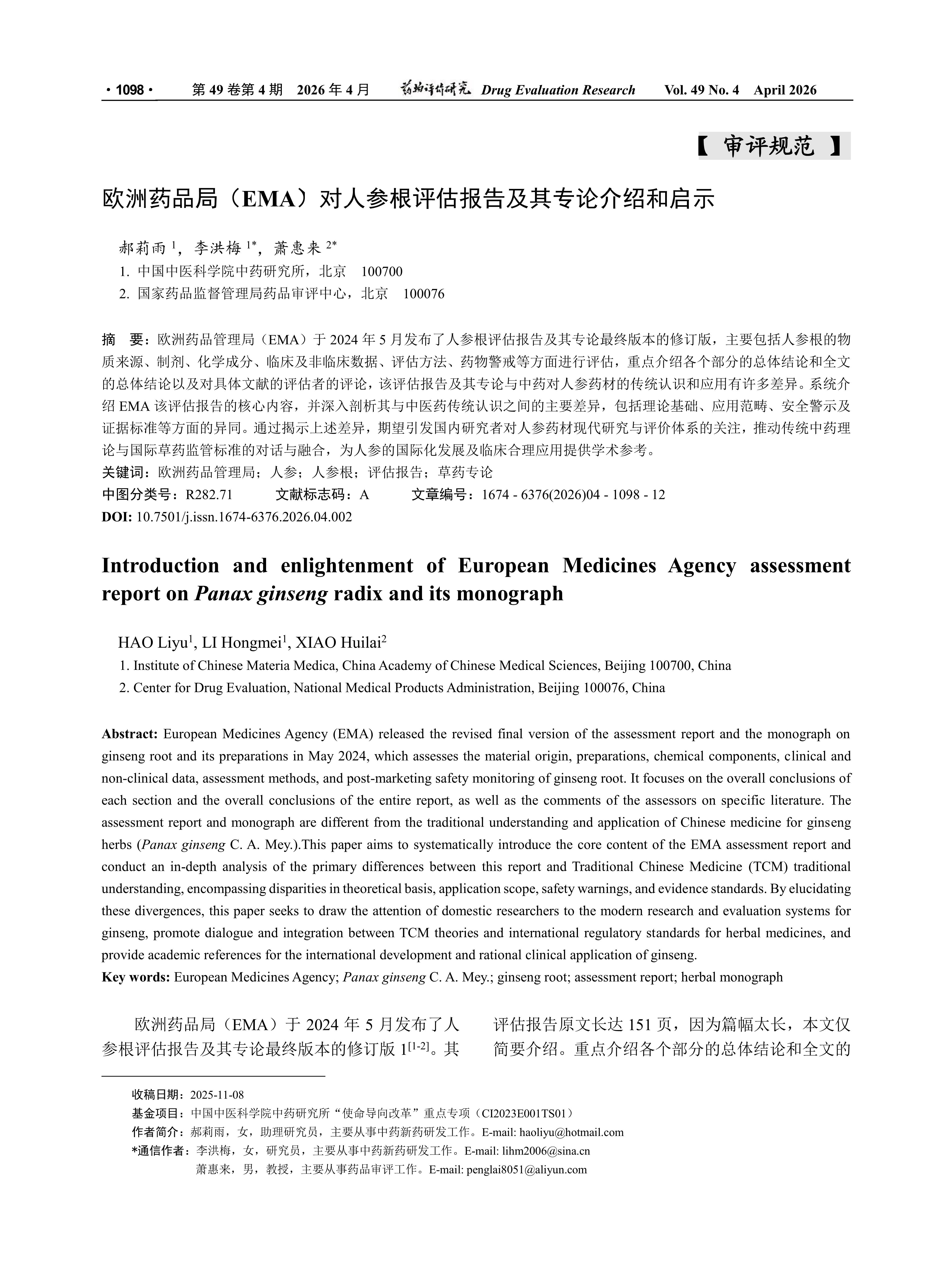 欧洲药品管理局(EMA)于2024年5月发布了人参根评估报告及其专论最终版本的修订版,主要包括人参根的物质来源、制剂、化学成分、临床及非临床数据、评估方法、药物警戒等方面进行评估,重点介绍各个部分的总体结论和全文的总体结论以及对具体文献的评估者的评论,该评估报告及其专论与中药对人参药材的传统认识和应用有许多差异。系统介绍EMA该评估报告的核心内容,并深入剖析其与中医药传统认识之间的主要差异,包括理论基础、应用范畴、安全警示及证据标准等方面的异同。通过揭示上述差异,期望引发国内研究者对人参药材现代研究与评价体系的关注,推动传统中药理论与国际草药监管标准的对话与融合,为人参的国际化发展及临床合理应用提供学术参考。