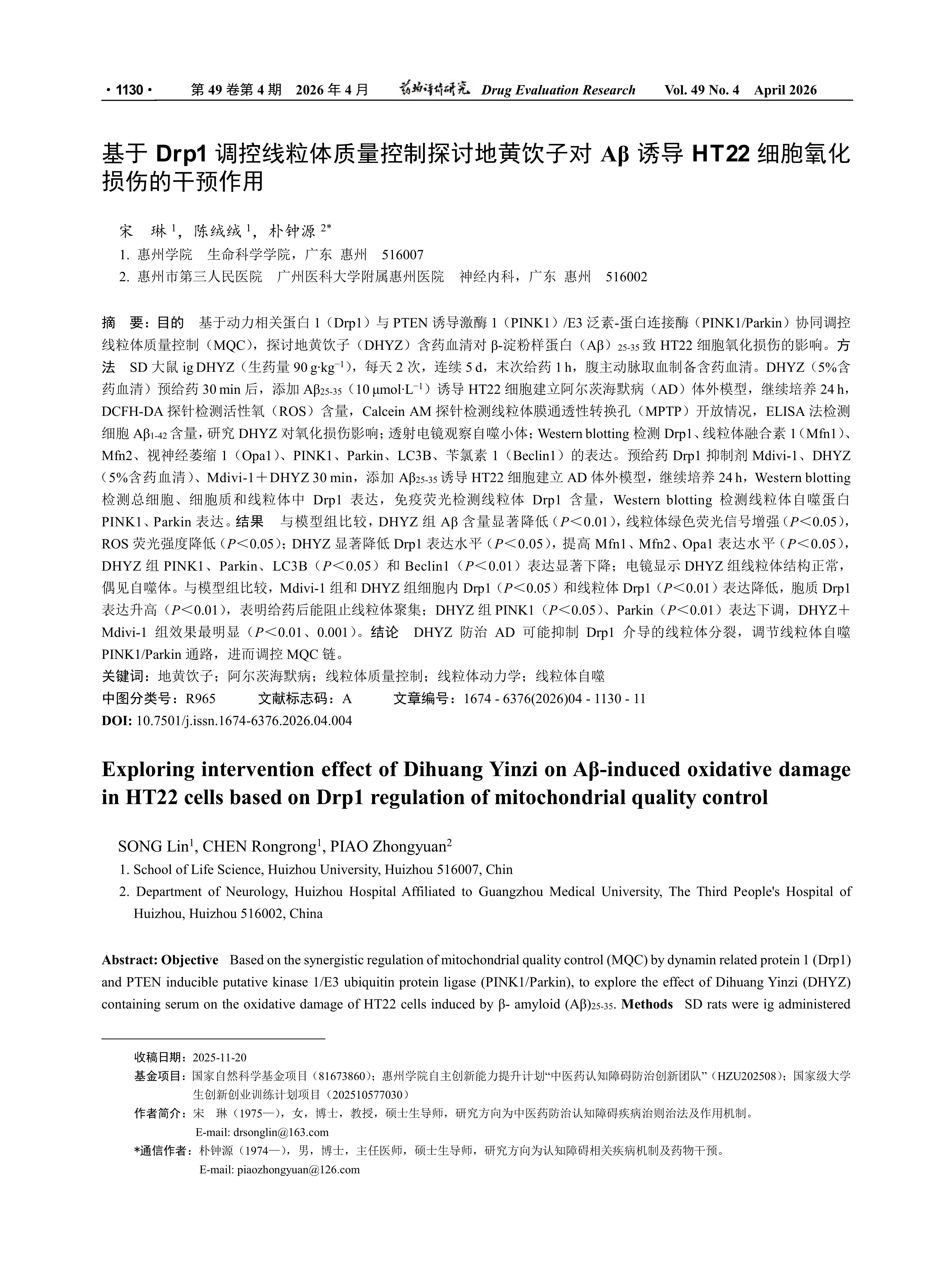 国家自然科学基金项目(81673860);惠州学院自主创新能力提升计划“中医药认知障碍防治创新团队”(HZU202508);国家级大学生创新创业训练计划项目(202510577030)