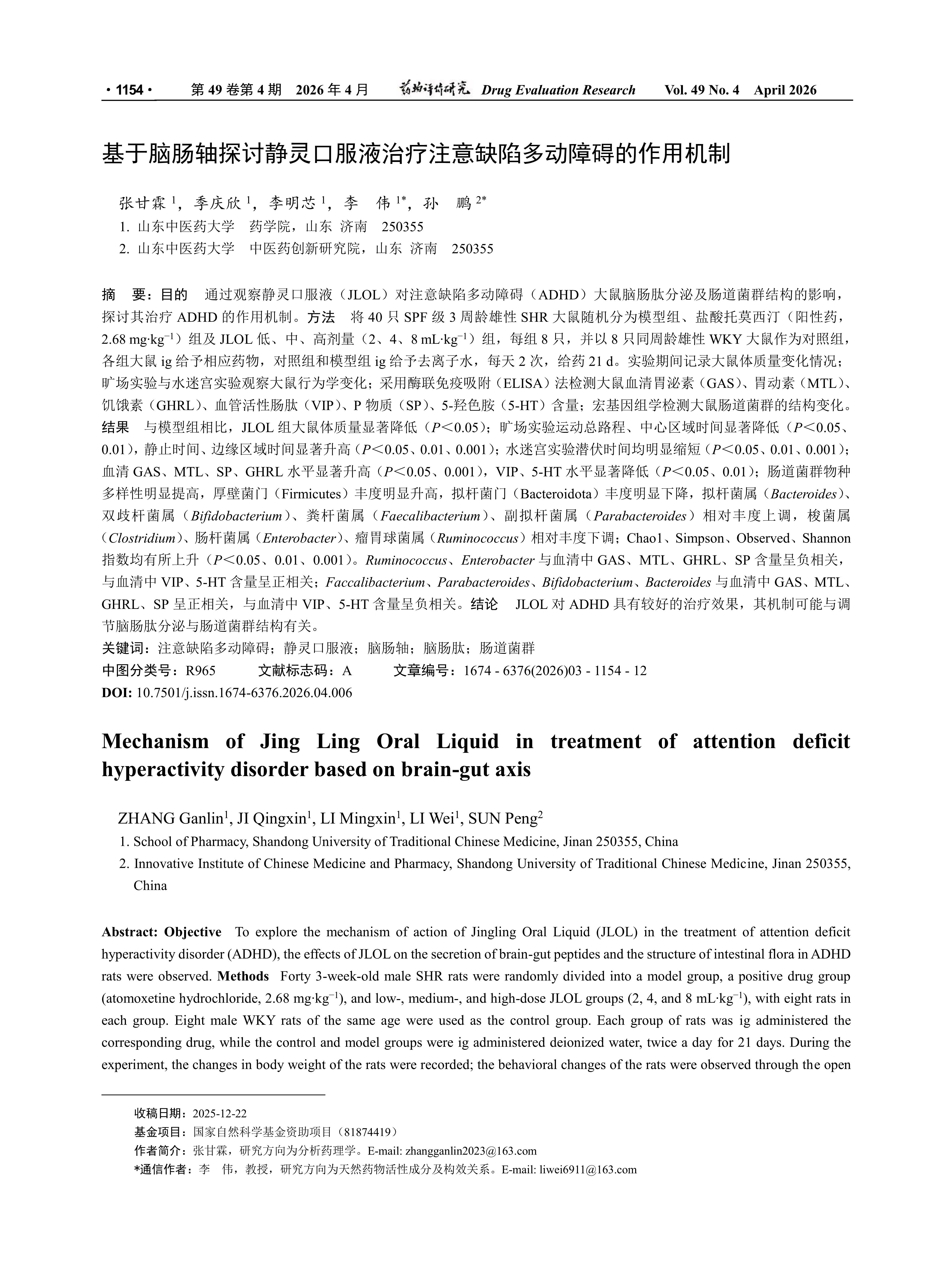 Objective To explore the mechanism of action of Jingling Oral Liquid (JLOL) in the treatment of attention deficit hyperactivity disorder (ADHD), the effects of JLOL on the secretion of brain-gut peptides and the structure of intestinal flora in ADHD rats were observed. Methods Forty 3-week-old male SHR rats were randomly divided into a model group, a positive drug group (atomoxetine hydrochloride, 2.68 mg·kg-1), and low-, medium-, and high-dose JLOL groups (2, 4, and 8 mL·kg-1), with eight rats in each group. Eight male WKY rats of the same age were used as the control group. Each group of rats was ig administered the corresponding drug, while the control and model groups were ig administered deionized water, twice a day for 21 days. During the experiment, the changes in body weight of the rats were recorded; the behavioral changes of the rats were observed through the open field test and water maze test; the contents of gastrin (GAS), motilin (MTL), ghrelin (GHRL), vasoactive intestinal peptide (VIP), substance P (SP), and 5-hydroxytryptamine (5-HT) in the rat serum were detected by enzyme-linked immunosorbent assay (ELISA); and the structural changes of the intestinal flora in the rats were detected by metagenomics. Results Compared with the model group, the body weight of the JLOL group rats was significantly reduced (P<0.05); the total distance traveled and the time spent in the center area in the open field test were significantly reduced (P<0.05, 0.01), while the time spent at rest and in the peripheral area was significantly increased (P<0.05, 0.01, 0.001); the latency time in the water maze test was significantly shortened (P<0.05, 0.01, 0.001); the levels of GAS, MTL, SP, and GHRL in the serum were significantly increased (P<0.05, 0.001), while the levels of VIP and 5-HT were significantly decreased (P<0.05, 0.01); the species diversity of the intestinal flora was significantly improved, the abundance of Firmicutes was significantly increased, the abundance of Bacteroidota was significantly decreased, the relative abundance of Bacteroides, Bifidobacterium, Faecalibacterium, and Parabacteroides was upregulated, and the relative abundance of Clostridium, Enterobacter, and Ruminococcus was downregulated; the Chao1, Simpson, Observed, and Shannon indices all increased (P<0.05, 0.01, 0.001); Ruminococcus and Enterobacter were negatively correlated with the levels of GAS, MTL, GHRL, and SP in the serum, and positively correlated with the levels of VIP and 5-HT; Faecalibacterium, Parabacteroides, Bifidobacterium, and Bacteroides were positively correlated with the levels of GAS, MTL, GHRL, and SP in the serum, and negatively correlated with the levels of VIP and 5-HT. Conclusion JLOL has a good therapeutic effect on ADHD, and its mechanism may be related to the regulation of brain-gut peptide secretion and the structure of intestinal flora.