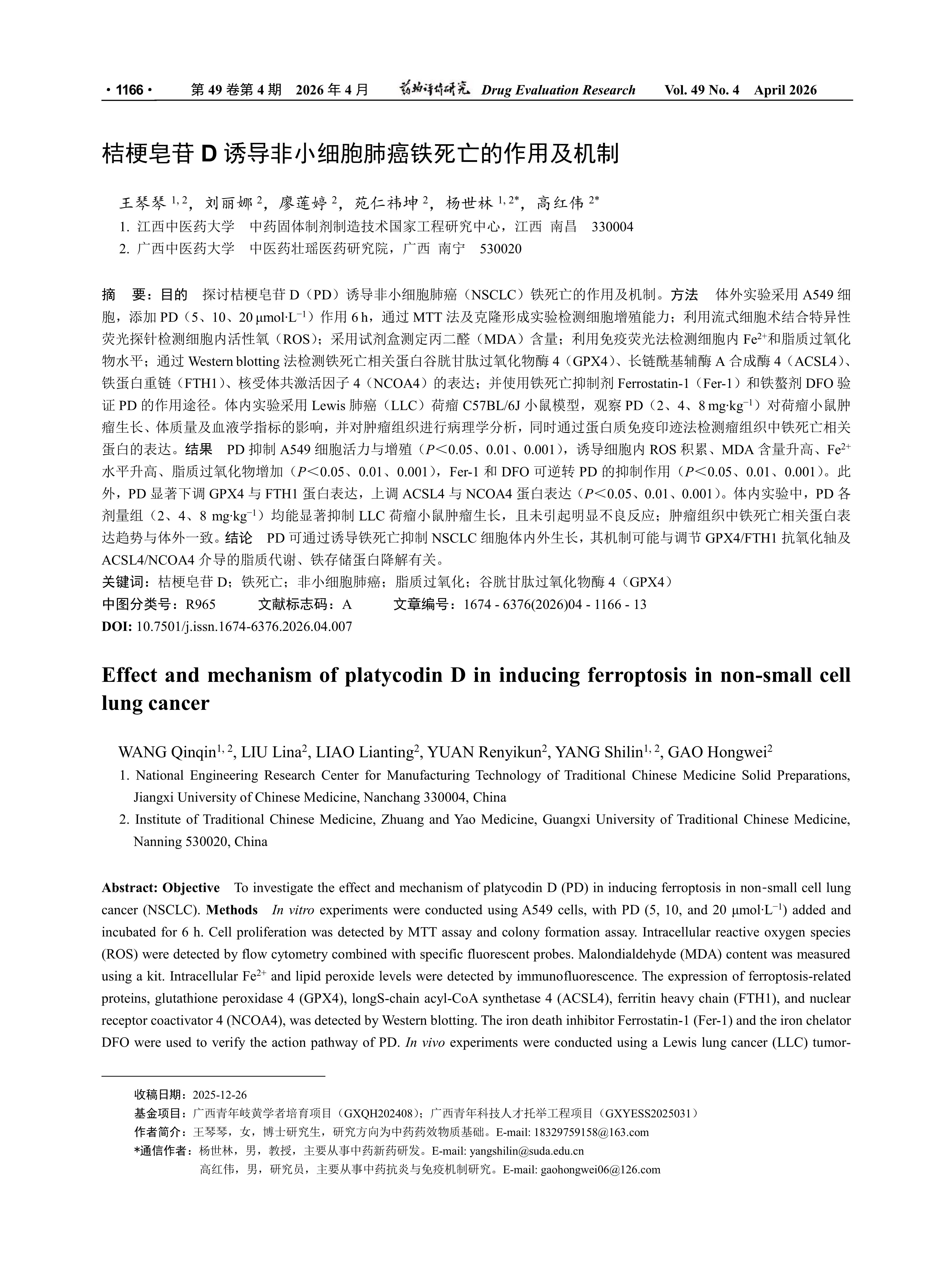 目的 探讨桔梗皂苷D(PD)诱导非小细胞肺癌(NSCLC)铁死亡的作用及机制。方法 体外实验采用A549细胞,添加PD(5、10、20 μmol·L-1)作用6 h,通过MTT法及克隆形成实验检测细胞增殖能力;利用流式细胞术结合特异性荧光探针检测细胞内活性氧(ROS);采用试剂盒测定丙二醛(MDA)含量;利用免疫荧光法检测细胞内Fe2+和脂质过氧化物水平;通过Western blotting法检测铁死亡相关蛋白谷胱甘肽过氧化物酶4(GPX4)、长链酰基辅酶A合成酶4(ACSL4)、铁蛋白重链(FTH1)、核受体共激活因子4(NCOA4)的表达;并使用铁死亡抑制剂Ferrostatin-1(Fer-1)和铁螯剂DFO验证PD的作用途径。体内实验采用Lewis肺癌(LLC)荷瘤C57BL/6J小鼠模型,观察PD(2、4、8 mg·kg-1)对荷瘤小鼠肿瘤生长、体质量及血液学指标的影响,并对肿瘤组织进行病理学分析,同时通过蛋白质免疫印迹法检测瘤组织中铁死亡相关蛋白的表达。结果 PD抑制A549细胞活力与增殖(P<0.05、0.01、0.001),诱导细胞内ROS积累、MDA含量升高、Fe2+水平升高、脂质过氧化物增加(P<0.05、0.01、0.001),Fer-1和DFO可逆转PD的抑制作用(P<0.05、0.01、0.001)。此外,PD显著下调GPX4与FTH1蛋白表达,上调ACSL4与NCOA4蛋白表达(P<0.05、0.01、0.001)。体内实验中,PD各剂量组(2、4、8 mg·kg-1)均能显著抑制LLC荷瘤小鼠肿瘤生长,且未引起明显不良反应;肿瘤组织中铁死亡相关蛋白表达趋势与体外一致。结论 PD可通过诱导铁死亡抑制NSCLC细胞体内外生长,其机制可能与调节GPX4/FTH1抗氧化轴及ACSL4/NCOA4介导的脂质代谢、铁存储蛋白降解有关。