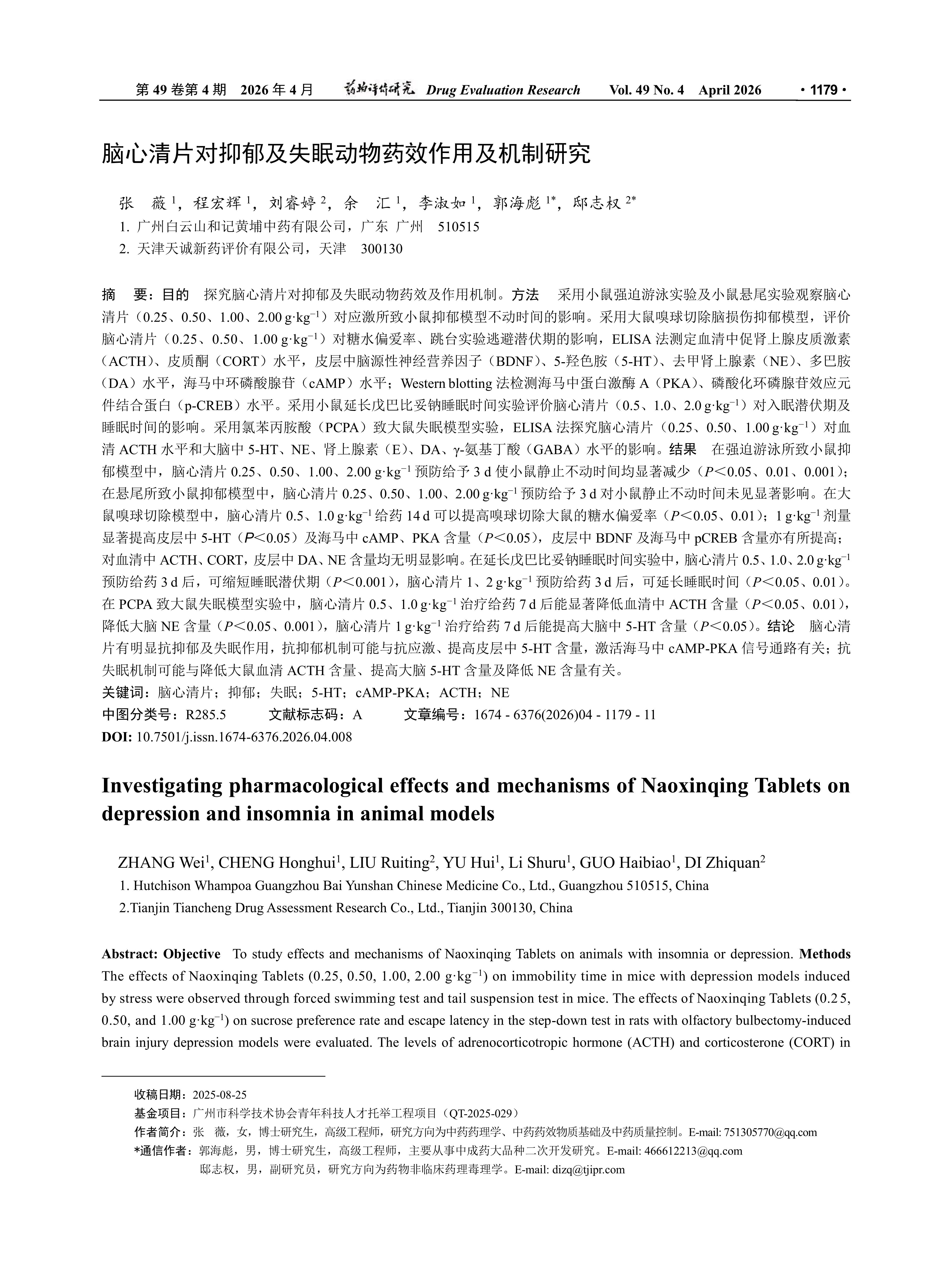目的 探究脑心清片对抑郁及失眠动物药效及作用机制。方法 采用小鼠强迫游泳实验及小鼠悬尾实验观察脑心清片(0.25、0.50、1.00、2.00 g·kg-1)对应激所致小鼠抑郁模型不动时间的影响。采用大鼠嗅球切除脑损伤抑郁模型,评价脑心清片(0.25、0.50、1.00 g·kg-1)对糖水偏爱率、跳台实验逃避潜伏期的影响,ELISA法测定血清中促肾上腺皮质激素(ACTH)、皮质酮(CORT)水平,皮层中脑源性神经营养因子(BDNF)、5-羟色胺(5-HT)、去甲肾上腺素(NE)、多巴胺(DA)水平,海马中环磷酸腺苷(cAMP)水平; Western blotting法检测海马中蛋白激酶A(PKA)、磷酸化环磷腺苷效应元件结合蛋白(p-CREB)水平。采用小鼠延长戊巴比妥钠睡眠时间实验评价脑心清片(0.5、1.0、2.0 g·kg-1)对入眠潜伏期及睡眠时间的影响。采用氯苯丙胺酸(PCPA)致大鼠失眠模型实验,ELISA法探究脑心清片(0.25、0.50、1.00 g·kg-1)对血清ACTH水平和大脑中5-HT、NE、肾上腺素(E)、DA、γ-氨基丁酸(GABA)水平的影响。结果 在强迫游泳所致小鼠抑郁模型中,脑心清片0.25、0.50、1.00、2.00 g·kg-1预防给予3 d使小鼠静止不动时间均显著减少(P<0.05、0.01、0.001);在悬尾所致小鼠抑郁模型中,脑心清片0.25、0.50、1.00、2.00 g·kg-1预防给予3 d对小鼠静止不动时间未见显著影响。在大鼠嗅球切除模型中,脑心清片0.5、1.0 g·kg-1给药14 d可以提高嗅球切除大鼠的糖水偏爱率(P<0.05、0.01); 1 g·kg-1剂量显著提高皮层中5-HT(P<0.05)及海马中cAMP、PKA含量(P<0.05),皮层中BDNF及海马中pCREB含量亦有所提高;对血清中ACTH、CORT,皮层中DA、NE含量均无明显影响。在延长戊巴比妥钠睡眠时间实验中,脑心清片0.5、1.0、2.0 g·kg-1预防给药3 d后,可缩短睡眠潜伏期(P<0.001),脑心清片1、2 g·kg-1预防给药3 d后,可延长睡眠时间(P<0.05、0.01)。在PCPA致大鼠失眠模型实验中,脑心清片0.5、1.0 g·kg-1治疗给药7 d后能显著降低血清中ACTH含量(P<0.05、0.01),降低大脑NE含量(P<0.05、0.001),脑心清片1 g·kg-1治疗给药7 d后能提高大脑中5-HT含量(P<0.05)。结论 脑心清片有明显抗抑郁及失眠作用,抗抑郁机制可能与抗应激、提高皮层中5-HT含量,激活海马中cAMP-PKA信号通路有关;抗失眠机制可能与降低大鼠血清ACTH含量、提高大脑5-HT含量及降低NE含量有关。