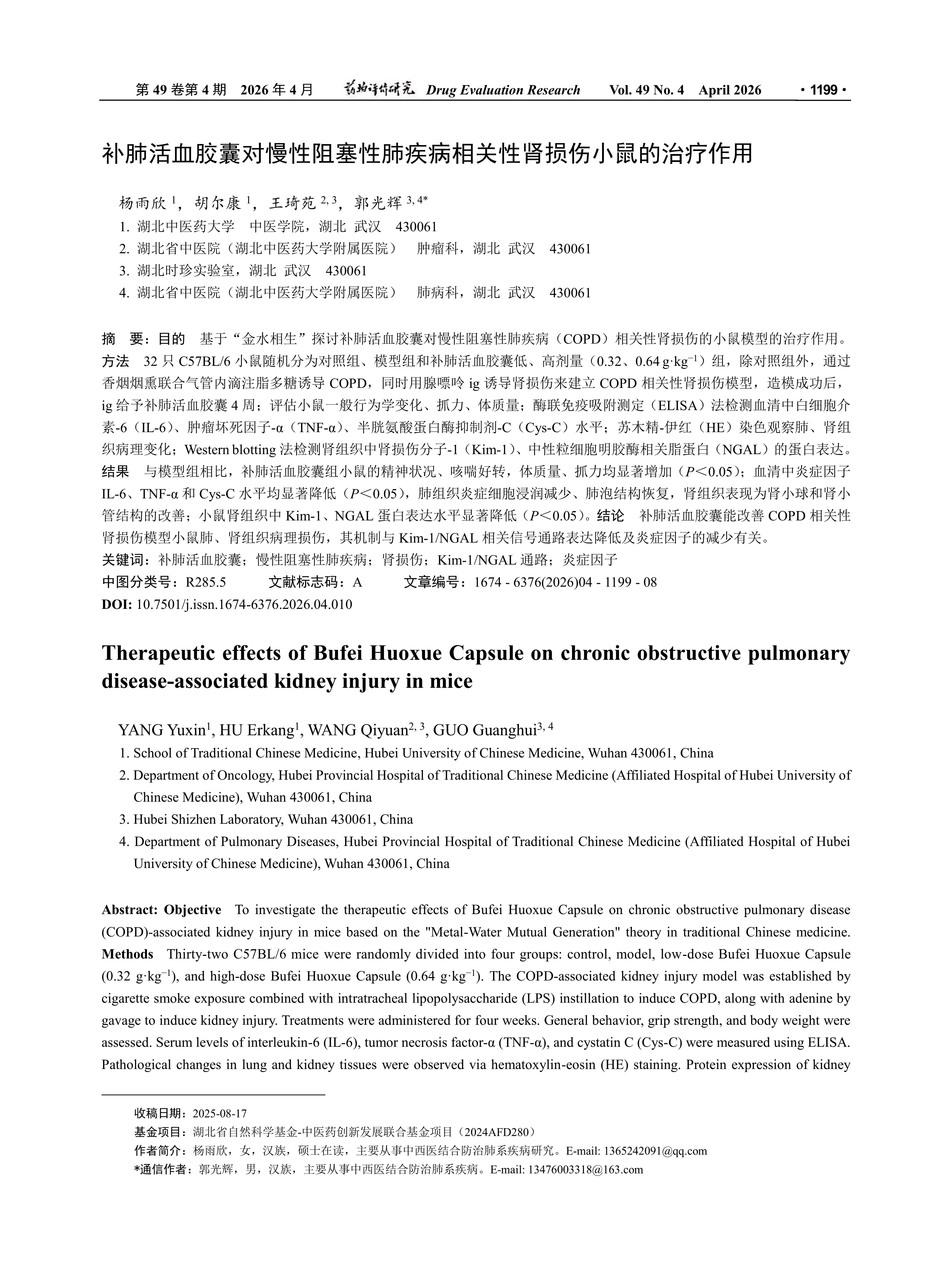 目的 基于“金水相生”探讨补肺活血胶囊对慢性阻塞性肺疾病(COPD)相关性肾损伤的小鼠模型的治疗作用。方法 32只C57BL/6小鼠随机分为对照组、模型组和补肺活血胶囊低、高剂量(0.32、0.64 g·kg-1)组,除对照组外,通过香烟烟熏联合气管内滴注脂多糖诱导COPD,同时用腺嘌呤ig诱导肾损伤来建立COPD相关性肾损伤模型,造模成功后,ig给予补肺活血胶囊4周;评估小鼠一般行为学变化、抓力、体质量;酶联免疫吸附测定(ELISA)法检测血清中白细胞介素-6(IL-6)、肿瘤坏死因子-α(TNF-α)、半胱氨酸蛋白酶抑制剂-C(Cys-C)水平;苏木精-伊红(HE)染色观察肺、肾组织病理变化; Western blotting法检测肾组织中肾损伤分子-1(Kim-1)、中性粒细胞明胶酶相关脂蛋白(NGAL)的蛋白表达。结果 与模型组相比,补肺活血胶囊组小鼠的精神状况、咳喘好转,体质量、抓力均显著增加(P<0.05);血清中炎症因子IL-6、TNF-α和Cys-C水平均显著降低(P<0.05),肺组织炎症细胞浸润减少、肺泡结构恢复,肾组织表现为肾小球和肾小管结构的改善;小鼠肾组织中Kim-1、NGAL蛋白表达水平显著降低(P<0.05)。结论 补肺活血胶囊能改善COPD相关性肾损伤模型小鼠肺、肾组织病理损伤,其机制与Kim-1/NGAL相关信号通路表达降低及炎症因子的减少有关。