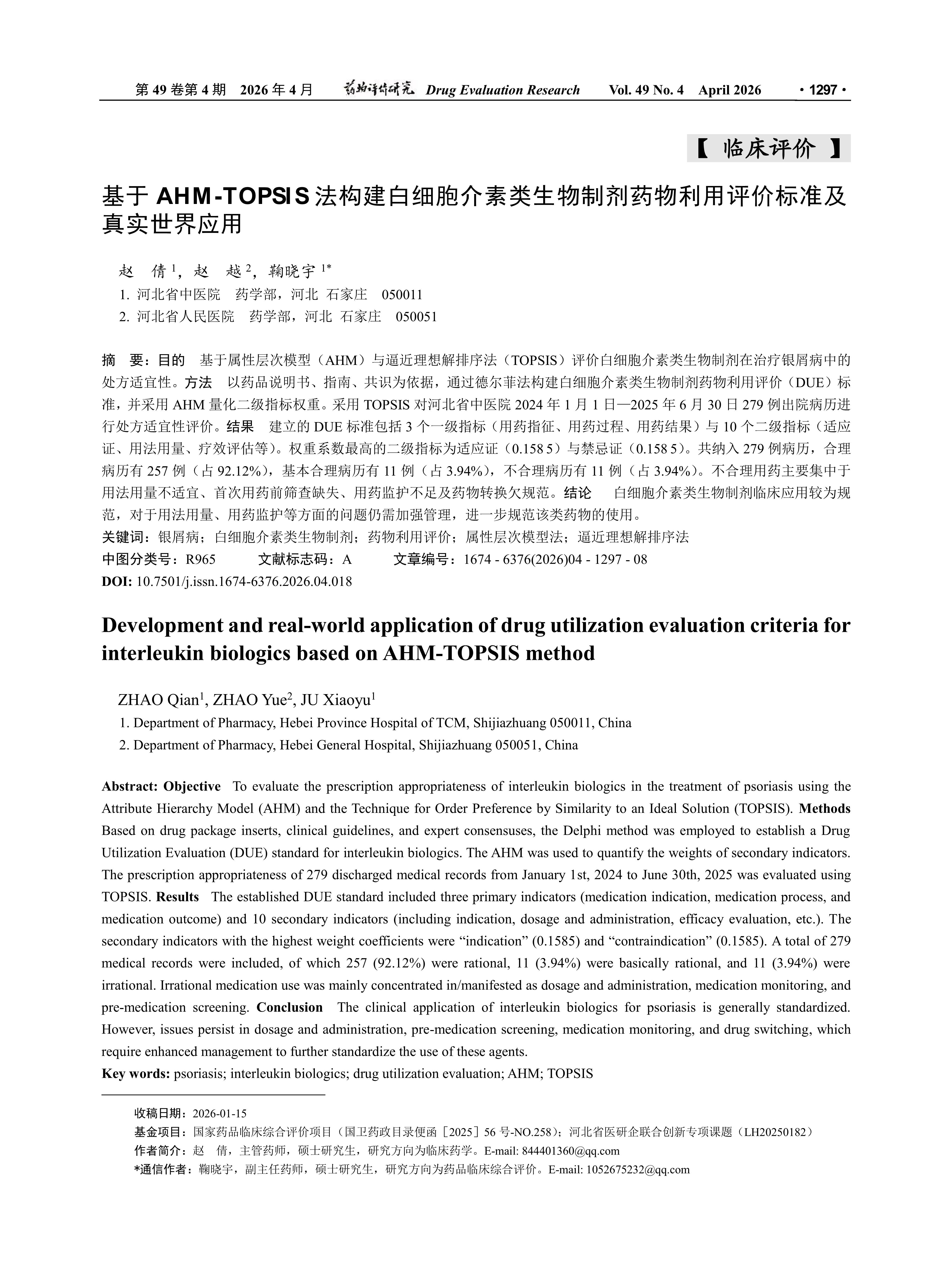 Objective To evaluate the prescription appropriateness of interleukin biologics in the treatment of psoriasis using the Attribute Hierarchy Model (AHM) and the Technique for Order Preference by Similarity to an Ideal Solution (TOPSIS). Methods Based on drug package inserts, clinical guidelines, and expert consensuses, the Delphi method was employed to establish a Drug Utilization Evaluation (DUE) standard for interleukin biologics. The AHM was used to quantify the weights of secondary indicators. The prescription appropriateness of 279 discharged medical records from January 1st, 2024 to June 30th, 2025 was evaluated using TOPSIS. Results The established DUE standard included three primary indicators (medication indication, medication process, and medication outcome) and 10 secondary indicators (including indication, dosage and administration, efficacy evaluation, etc.). The secondary indicators with the highest weight coefficients were “indication” (0.1585) and “contraindication” (0.1585). A total of 279 medical records were included, of which 257 (92.12%) were rational, 11 (3.94%) were basically rational, and 11 (3.94%) were irrational. Irrational medication use was mainly concentrated in/manifested as dosage and administration, medication monitoring, and pre-medication screening. Conclusion The clinical application of interleukin biologics for psoriasis is generally standardized. However, issues persist in dosage and administration, pre-medication screening, medication monitoring, and drug switching, which require enhanced management to further standardize the use of these agents.