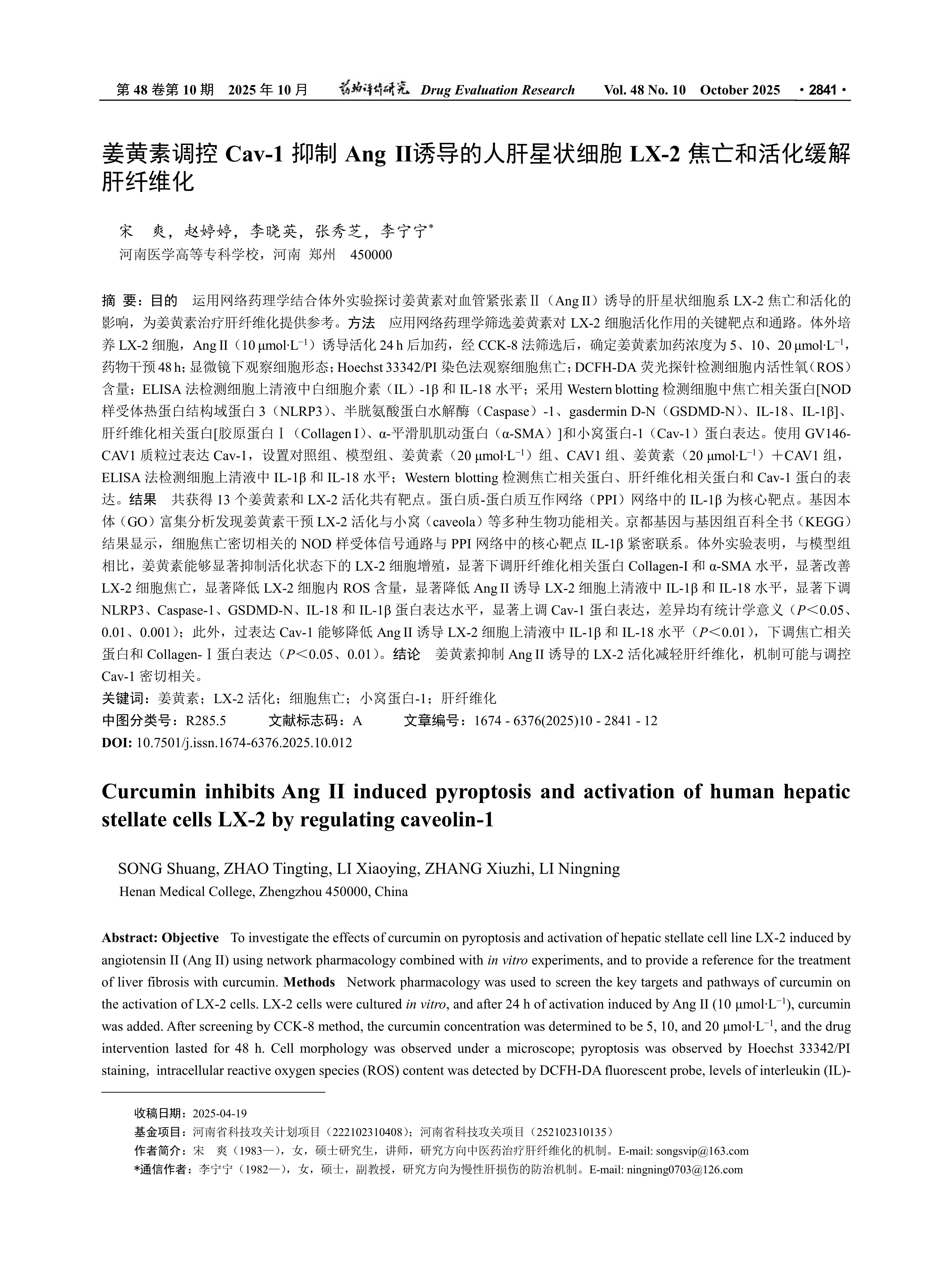 Objective To investigate the effects of curcumin on pyroptosis and activation of hepatic stellate cell line LX-2 induced by angiotensin II (Ang II) using network pharmacology combined with in vitro experiments, and to provide a reference for the treatment of liver fibrosis with curcumin. Methods Network pharmacology was used to screen the key targets and pathways of curcumin on the activation of LX-2 cells. LX-2 cells were cultured in vitro, and after 24 h of activation induced by Ang II (10 μmol?L-1), curcumin was added. After screening by CCK-8 method, the curcumin concentration was determined to be 5, 10, and 20 μmol?L-1, and the drug intervention lasted for 48 h. Cell morphology was observed under a microscope; pyroptosis was observed by Hoechst 33342/PI staining, intracellular reactive oxygen species (ROS) content was detected by DCFH-DA fluorescent probe, levels of interleukin (IL)-1β and IL-18 in the cell supernatant were detected by ELISA, expressions of pyroptosis-related proteins [NOD-like receptor pyrin domain-containing protein 3 (NLRP3), caspase-1, gasdermin D-N (GSDMD-N), IL-18, IL-1β], liver fibrosis-related proteins [collagen type I (Collagen-Ⅰ), α-smooth muscle actin (α-SMA)], and caveolin-1 (Cav-1) were detected by Western blotting. The GV146-CAV1 plasmid was used to overexpress Cav-1, and the control group, model group, curcumin (20 μmol?L-1) group, CAV1 group, and curcumin (20 μmol?L-1) + CAV1 group were set up. Levels of IL-1β and IL-18 in the cell supernatant were detected by ELISA, expressions of pyroptosis-related proteins, liver fibrosis-related proteins, and Cav-1 were detected by Western blotting. Results A total of 13 common targets of curcumin and LX-2 activation were obtained. IL-1β was the core target in the protein-protein interaction (PPI) network. Gene Ontology (GO) enrichment analysis revealed that curcumin intervention on LX-2 activation was related to multiple biological functions such as caveola. Kyoto Encyclopedia of Genes and Genomes (KEGG) results showed that the NOD-like receptor signaling pathway closely related to cell pyroptosis was closely linked to the core target IL-1β in the PPI network. In vitro experiments showed that compared with the model group, curcumin could significantly inhibit the proliferation of activated LX-2 cells, significantly downregulate the levels of liver fibrosis-related proteins Collagen-I and α-SMA, significantly improve LX-2 cell pyroptosis, significantly reduce intracellular ROS content, significantly reduce the levels of IL-1β and IL-18 in the LX-2 cell supernatant induced by Ang II, significantly down-regulate the expression levels of NLRP3, caspase-1, GSDMD-N, IL-18, and IL-1β proteins, and significantly upregulate the expression of Cav-1 protein, and the differences were statistically significant (P<0.05, 0.01, 0.001); In addition, overexpression of Cav-1 could reduce the levels of IL-1β and IL-18 in the LX-2 cell supernatant induced by Ang II (P<0.05, 0.01), and down-regulate the expressions of pyroptosis and liver fibrosis-related proteins (P<0.05, 0.01). Conclusion Curcumin inhibits Ang II-induced LX-2 activation and alleviates liver fibrosis, likely through the regulation of Cav-1, although the specific mechanisms require further investigation.