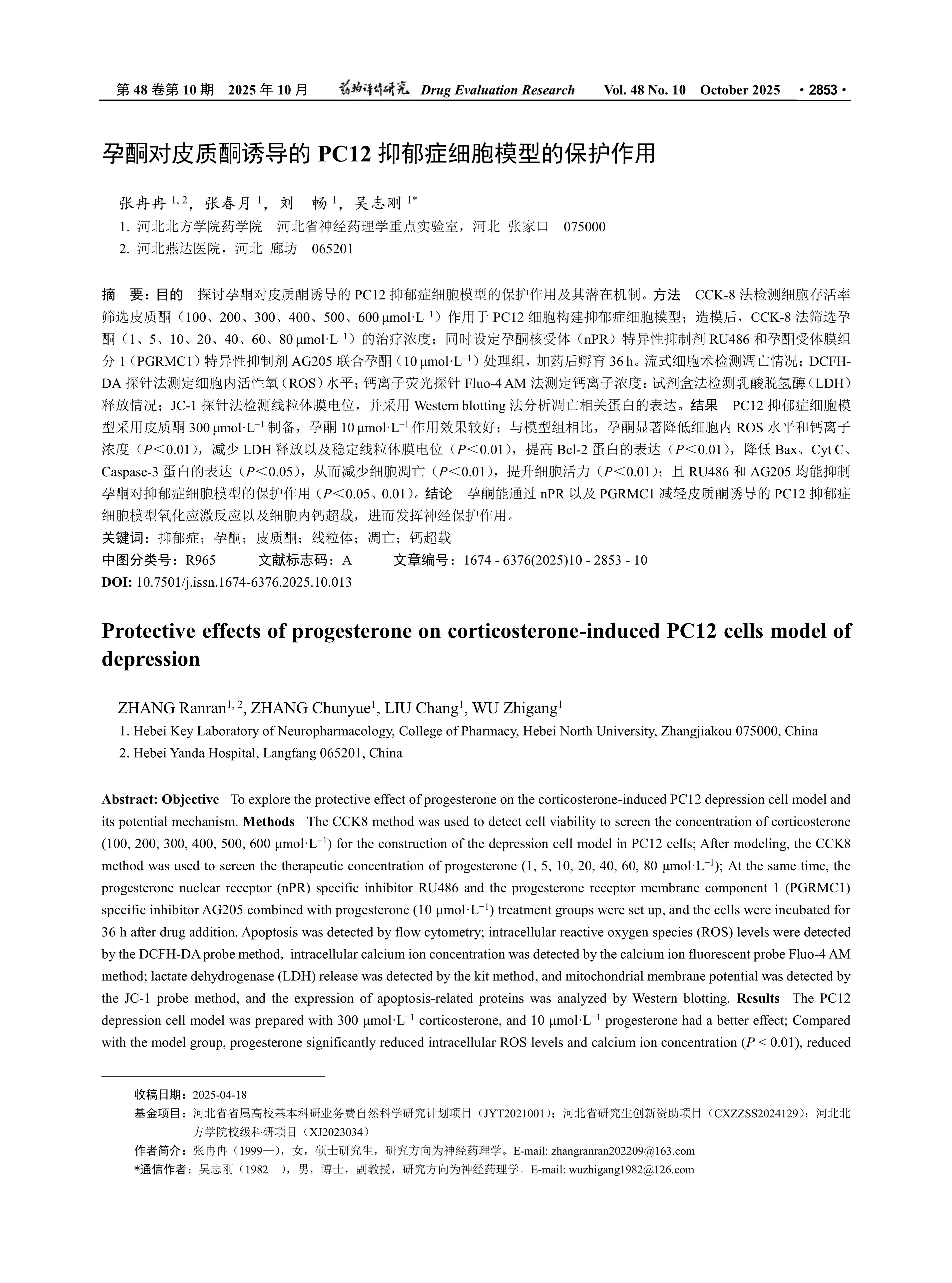 Objective To explore the protective effect of progesterone on the corticosterone-induced PC12 depression cell model and its potential mechanism. Methods The CCK8 method was used to detect cell viability to screen the concentration of corticosterone(100, 200, 300, 400, 500, 600 μmol·L-1) for the construction of the depression cell model in PC12 cells; After modeling, the CCK8 method was used to screen the therapeutic concentration of progesterone(1, 5, 10, 20, 40, 60, 80 μmol·L-1); At the same time, the progesterone nuclear receptor(nPR) specific inhibitor RU486 and the progesterone receptor membrane component 1(PGRMC1) specific inhibitor AG205 combined with progesterone(10 μmol·L-1) treatment groups were set up, and the cells were incubated for 36 h after drug addition. Apoptosis was detected by flow cytometry; intracellular reactive oxygen species(ROS) levels were detected by the DCFH-DA probe method, intracellular calcium ion concentration was detected by the calcium ion fluorescent probe Fluo-4 AM method; lactate dehydrogenase(LDH) release was detected by the kit method, and mitochondrial membrane potential was detected by the JC-1 probe method, and the expression of apoptosis-related proteins was analyzed by Western blotting. Results The PC12 depression cell model was prepared with 300 μmol·L-1 corticosterone, and 10 μmol·L-1 progesterone had a better effect; Compared with the model group, progesterone significantly reduced intracellular ROS levels and calcium ion concentration(P<0.01), reduced LDH release and stabilized mitochondrial membrane potential(P<0.01), increased the expression of Bcl-2 protein(P<0.01), decreased the expression of Bax, Cyt C, and Caspase-3 proteins(P<0.05), thereby reducing cell apoptosis(P<0.01) and enhancing cell viability(P<0.01); and both RU486 and AG205 could inhibit the protective effect of progesterone on the depression cell model(P<0.05, 0.01). Conclusion Progesterone exerts neuroprotective effects by alleviating CORT-induced oxidative stress and intracellular calcium overload in the PC12 depression cell model through nPR and PGRMC1 pathways.