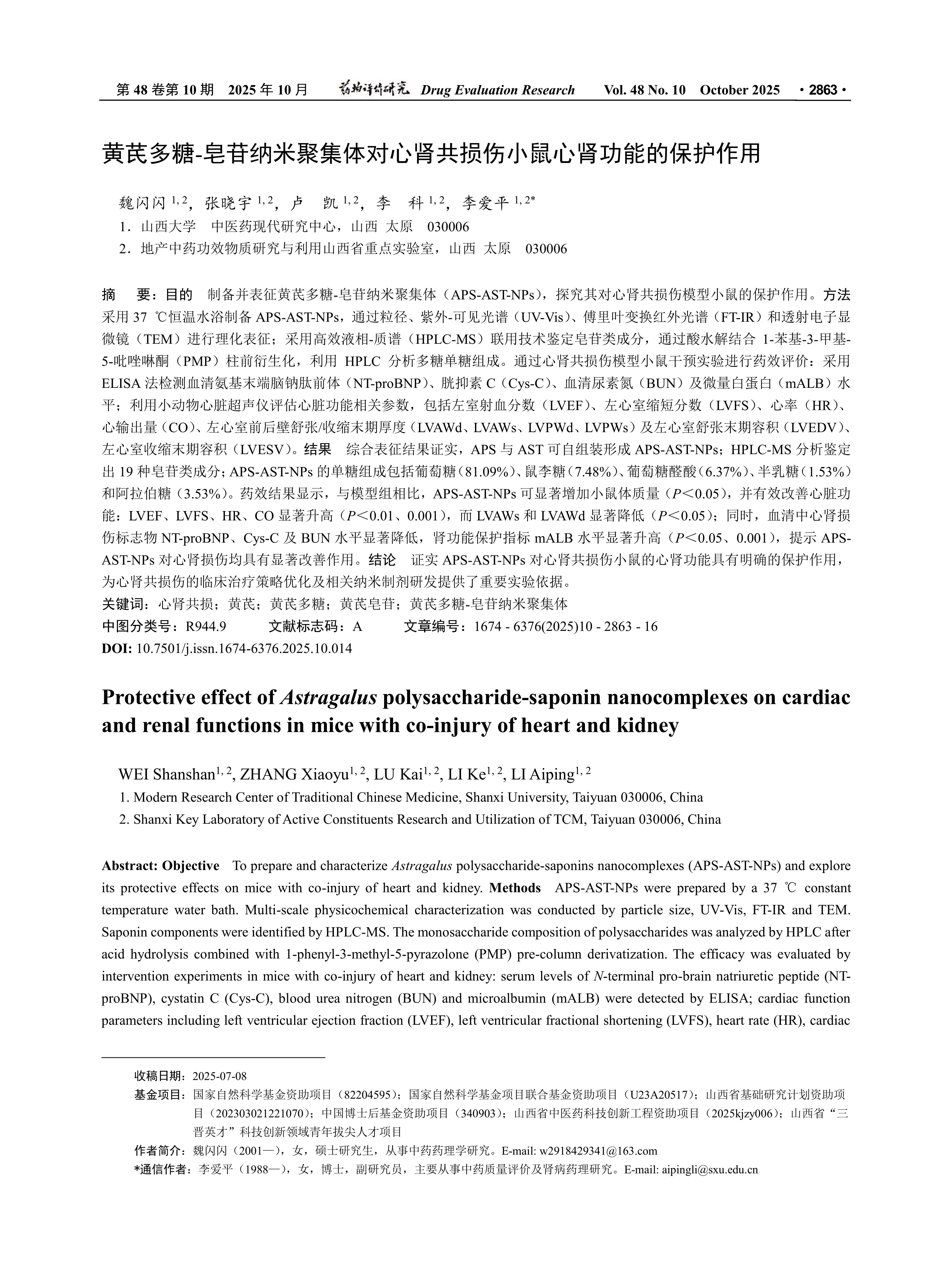 目的 制备并表征黄芪多糖-皂苷纳米聚集体(APS-AST-NPs),探究其对心肾共损伤模型小鼠的保护作用。方法 采用37℃恒温水浴制备APS-AST-NPs,通过粒径、紫外-可见光谱(UV-Vis)、傅里叶变换红外光谱(FT-IR)和透射电子显微镜(TEM)进行理化表征;采用高效液相-质谱(HPLC-MS)联用技术鉴定皂苷类成分,通过酸水解结合1-苯基-3-甲基-5-吡唑啉酮(PMP)柱前衍生化,利用HPLC分析多糖单糖组成。通过心肾共损伤模型小鼠干预实验进行药效评价:采用ELISA法检测血清氨基末端脑钠肽前体(NT-proBNP)、胱抑素C (Cys-C)、血清尿素氮(BUN)及微量白蛋白(m ALB)水平;利用小动物心脏超声仪评估心脏功能相关参数,包括左室射血分数(LVEF)、左心室缩短分数(LVFS)、心率(HR)、心输出量(CO)、左心室前后壁舒张/收缩末期厚度(LVAWd、LVAWs、LVPWd、LVPWs)及左心室舒张末期容积(LVEDV)、左心室收缩末期容积(LVESV)。结果 综合表征结果证实,APS与AST可自组装形成APS-AST-NPs;HPLC-MS分析鉴定出19种皂苷类成分;APS-AST-NPs的单糖组成包括葡萄糖(81.09%)、鼠李糖(7.48%)、葡萄糖醛酸(6.37%)、半乳糖(1.53%)和阿拉伯糖(3.53%)。药效结果显示,与模型组相比,APS-AST-NPs可显著增加小鼠体质量(P<0.05),并有效改善心脏功能:LVEF、LVFS、HR、CO显著升高(P<0.01、0.001),而LVAWs和LVAWd显著降低(P<0.05);同时,血清中心肾损伤标志物NT-proBNP、Cys-C及BUN水平显著降低,肾功能保护指标mALB水平显著升高(P<0.05、0.001),提示APSAST-NPs对心肾损伤均具有显著改善作用。结论 证实APS-AST-NPs对心肾共损伤小鼠的心肾功能具有明确的保护作用,为心肾共损伤的临床治疗策略优化及相关纳米制剂研发提供了重要实验依据。