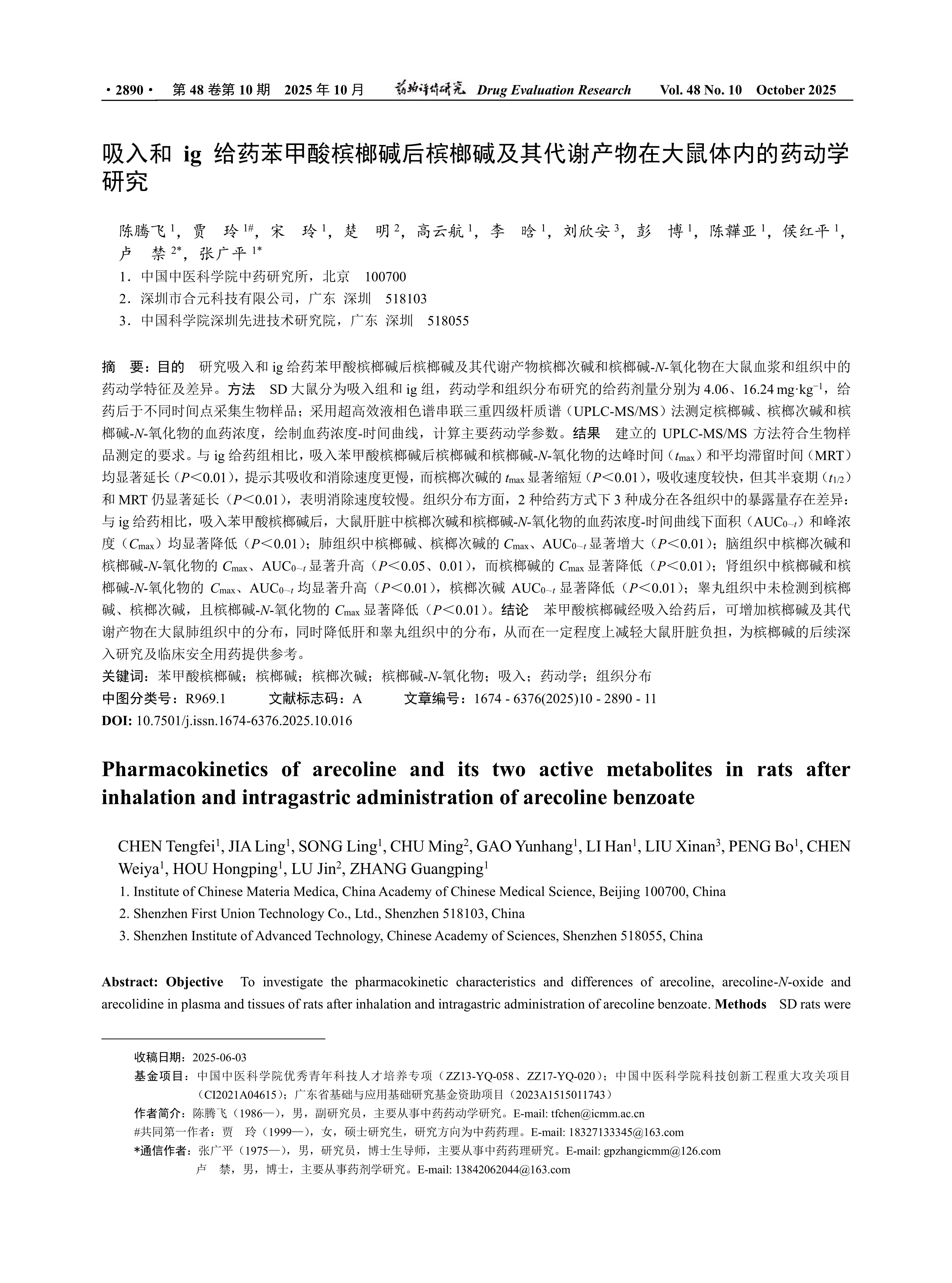Objective To investigate the pharmacokinetic characteristics and differences of arecoline, arecoline-N-oxide and arecolidine in plasma and tissues of rats after inhalation and intragastric administration of arecoline benzoate. Methods SD rats were divided into inhalation group and intragastric administration group. The doses for pharmacokinetic and tissue distribution studies were 4.06 and 16.24 mg·kg-1, respectively. Biological samples were collected at different time points after administration. The blood concentrations of arecoline, arecolidine and arecoline-N-oxide were determined by ultra-performance liquid chromatography-tandem triple quadrupole mass spectrometry(UPLC-MS/MS). The blood concentration-time curves were plotted and the main pharmacokinetic parameters were calculated. Results The established UPLC-MS/MS method met the requirements for the determination of biological samples. Compared with the intragastric administration group, the peak time(tmax) and mean residence time(MRT) of arecoline and arecoline-N-oxide after inhalation of arecoline benzoate were significantly prolonged(P<0.01), suggesting that their absorption and elimination rates were slower. However, the tmax of arecolidine was significantly shortened(P<0.01), indicating a faster absorption rate. However, its half-life(t1/2) and MRT were still significantly prolonged(P<0.01), suggesting a slower elimination rate. In terms of tissue distribution, there were differences in the exposure of the three components in various tissues between the two administration methods. Compared with intragastric administration, after inhalation of arecoline benzoate, the area under the blood concentrationtime curve(AUC0~t) and peak concentration(Cmax) of arecolidine and arecoline-N-oxide in the liver of rats were significantly decreased(P<0.01); the Cmax and AUC0~t of arecoline and arecolidine in the lung tissue were significantly increased(P<0.01); the Cmax and AUC0~t of arecolidine and arecoline-N-oxide in the brain tissue were significantly increased(P<0.05, 0.01), while the Cmax of arecoline was significantly decreased(P<0.01); the Cmax and AUC0~t of arecoline and arecoline-N-oxide in the kidney tissue were significantly increased(P<0.01), while the AUC0~t of arecolidine was significantly decreased(P<0.01); arecoline and arecolidine were not detected in the testis tissue, and the Cmax of arecoline-N-oxide was significantly decreased(P<0.01). Conclusion Inhalation administration of arecoline benzoate can increase the distribution of arecoline and its metabolites in the lung tissue of rats, while reducing their distribution in the liver and testis tissues, thereby reducing the burden on the liver to a certain extent, providing a reference for the subsequent in-depth research and clinical safe use of arecoline.