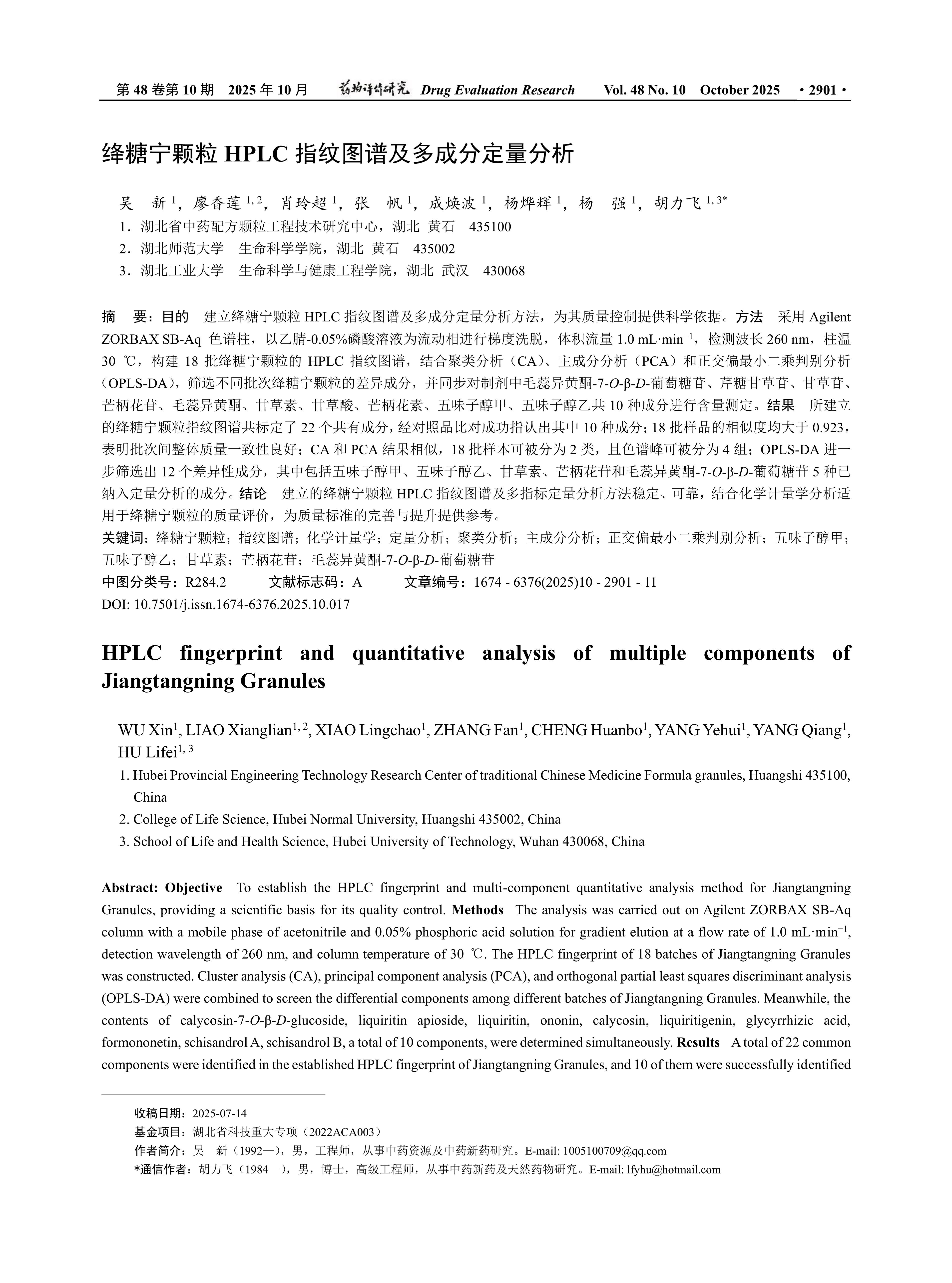 目的 建立绛糖宁颗粒HPLC指纹图谱及多成分定量分析方法,为其质量控制提供科学依据。方法 采用Agilent ZORBAX SB-Aq色谱柱,以乙腈-0.05%磷酸溶液为流动相进行梯度洗脱,体积流量1.0 mL·min-1,检测波长260 nm,柱温30℃,构建18批绛糖宁颗粒的HPLC指纹图谱,结合聚类分析(CA)、主成分分析(PCA)和正交偏最小二乘判别分析(OPLS-DA),筛选不同批次绛糖宁颗粒的差异成分,并同步对制剂中毛蕊异黄酮-7-O-β-D-葡萄糖苷、芹糖甘草苷、甘草苷、芒柄花苷、毛蕊异黄酮、甘草素、甘草酸、芒柄花素、五味子醇甲、五味子醇乙共10种成分进行含量测定。结果 所建立的绛糖宁颗粒指纹图谱共标定了22个共有成分,经对照品比对成功指认出其中10种成分;18批样品的相似度均大于0.923,表明批次间整体质量一致性良好;CA和PCA结果相似,18批样本可被分为2类,且色谱峰可被分为4组;OPLS-DA进一步筛选出12个差异性成分,其中包括五味子醇甲、五味子醇乙、甘草素、芒柄花苷和毛蕊异黄酮-7-O-β-D-葡萄糖苷5种已纳入定量分析的成分。结论 建立的绛糖宁颗粒HPLC指纹图谱及多指标定量分析方法稳定、可靠,结合化学计量学分析适用于绛糖宁颗粒的质量评价,为质量标准的完善与提升提供参考。
