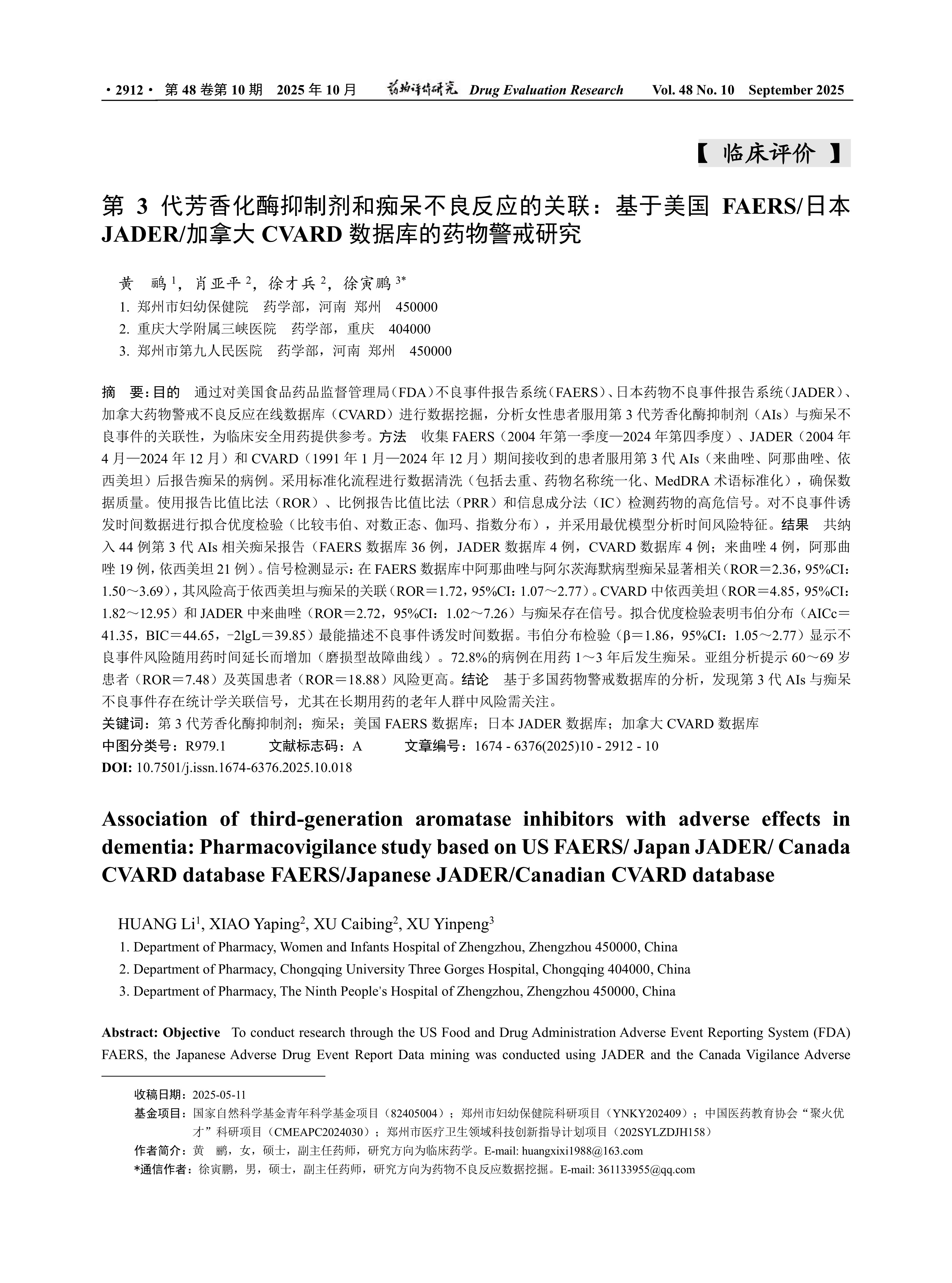 Objective To conduct research through the US Food and Drug Administration Adverse Event Reporting System(FDA) FAERS, the Japanese Adverse Drug Event Report Data mining was conducted using JADER and the Canada Vigilance Adverse Reaction Online Database(CVARD) to analyze the association between the use of third-generation aromatase inhibitors(AIs) in female patients and adverse events of dementia. Provide a reference for the safe use of drugs in clinical practice. Methods Cases of reported dementia in patients who were admitted during FAERS(Q1 2004—Q4 2024), JADER(April 2004—December 2024), and CVARD(January 1991—December 2024) after being induced with third-generation aromatase inhibitors(letrozole, anastrozole, exemestane) were collected. Standardized processes were adopted for data cleaning(including deduplication, unification of drug names, and standardization of MedDRA terms) to ensure data quality. The high-risk signals of drugs were detected using the Reporting Odds Ratio(ROR), Proportional Reporting Ratio(PRR), and Information Component(IC) methods. The goodness of fit test was conducted on the data of the induction time of adverse events(comparing Weber, lognormal, gamma, and exponential distribution), and the optimal model was used to analyze the temporal risk characteristics. Results A total of 44 reports of dementia related to third-generation AIs were included(36 cases in the FAERS database, 4 cases in the JADER database, and 4 cases in the CVARD database; There were 4 cases of letrozole, 19 cases of anastrozole and 21 cases of exemestane. Signal detection showed that in the FAERS database, anastrozole was significantly associated with Alzheimer’s dementia(ROR = 2.36, 95%CI: 1.5—3.69), and its risk was higher than the association between exemetam and dementia(ROR = 1.72, 95%CI: 1.07—2.77). In CVARD, exemestane(ROR = 4.85, 95%CI: 1.82—12.95) and in JADER, letrozole(ROR = 2.72, 95%CI: 1.02—7.26) had signals associated with dementia. The goodness of fit test indicated that the Weber distribution(AICc = 41.35, BIC = 44.65,-2LogL = 39.85) could best describe the data of the induction time of adverse events. The Weber distribution test(β = 1.86, 95%CI: 1.05—2.77) showed that the risk of adverse events increased with the prolongation of medication time(wear-type failure curve). 72.8% of the cases developed dementia 1 to 3 years after medication. Subgroup analysis suggested that patients aged 60—69(ROR = 7.48) and those in the UK(ROR = 18.88) had a higher risk. Conclusion Based on the analysis of the multi-national pharmacovigilance database, it was found that there are statistical association signals between the third-generation AIs and adverse events of dementia. Especially in the elderly population with long-term medication, the risk needs to be paid attention to.