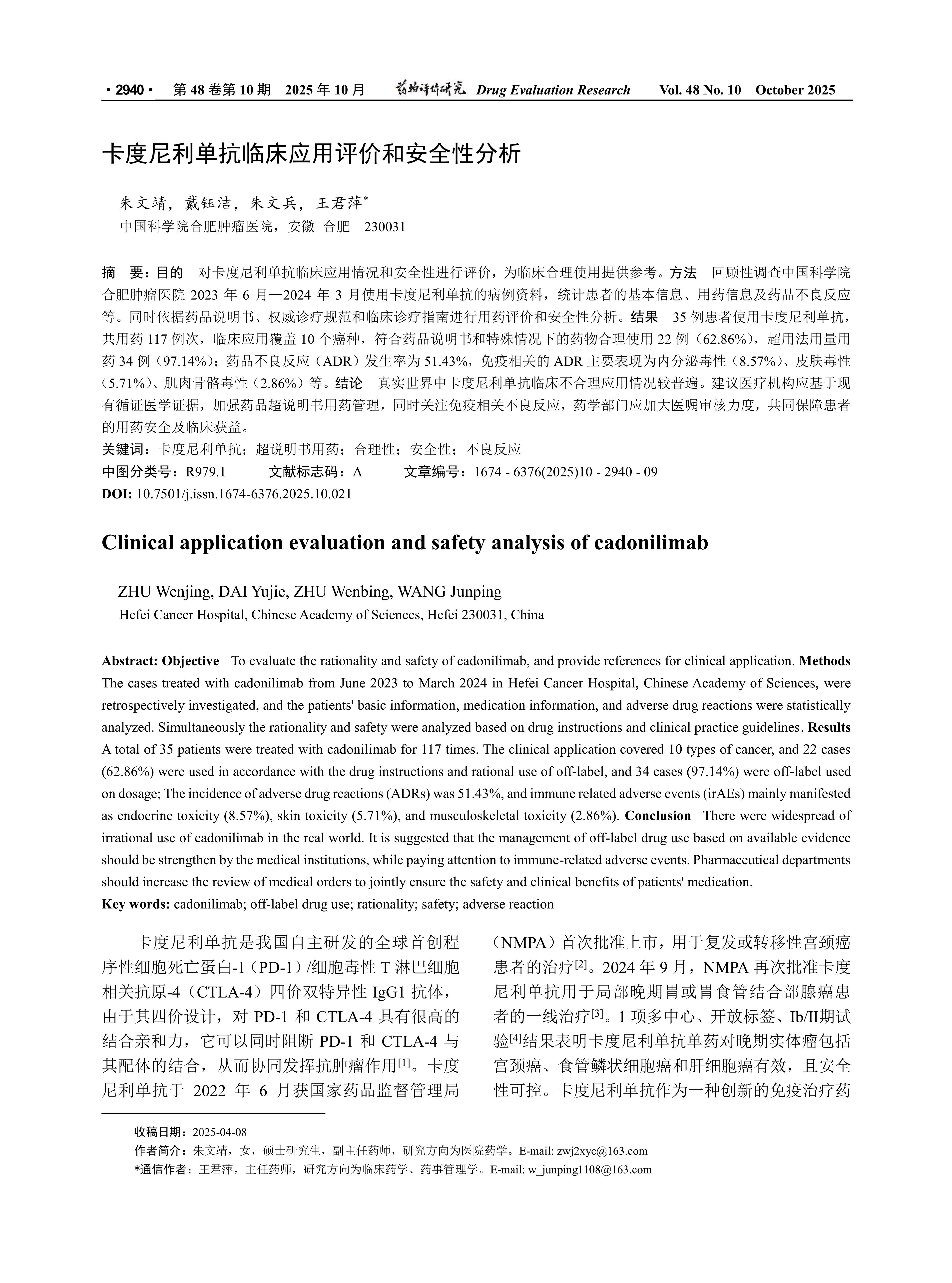 Objective To evaluate the rationality and safety of cadonilimab, and provide references for clinical application. Methods The cases treated with cadonilimab from June 2023 to March 2024 in Hefei Cancer Hospital, Chinese Academy of Sciences, were retrospectively investigated, and the patients’ basic information, medication information, and adverse drug reactions were statistically analyzed. Simultaneously the rationality and safety were analyzed based on drug instructions and clinical practice guidelines. Results A total of 35 patients were treated with cadonilimab for 117 times. The clinical application covered 10 types of cancer, and 22 cases(62.86%) were used in accordance with the drug instructions and rational use of off-label, and 34 cases(97.14%) were off-label used on dosage; The incidence of adverse drug reactions(ADRs) was 51.43%, and immune related adverse events(irAEs) mainly manifested as endocrine toxicity(8.57%), skin toxicity(5.71%), and musculoskeletal toxicity(2.86%). Conclusion There were widespread of irrational use of cadonilimab in the real world. It is suggested that the management of off-label drug use based on available evidence should be strengthen by the medical institutions, while paying attention to immune-related adverse events. Pharmaceutical departments should increase the review of medical orders to jointly ensure the safety and clinical benefits of patients’ medication.
