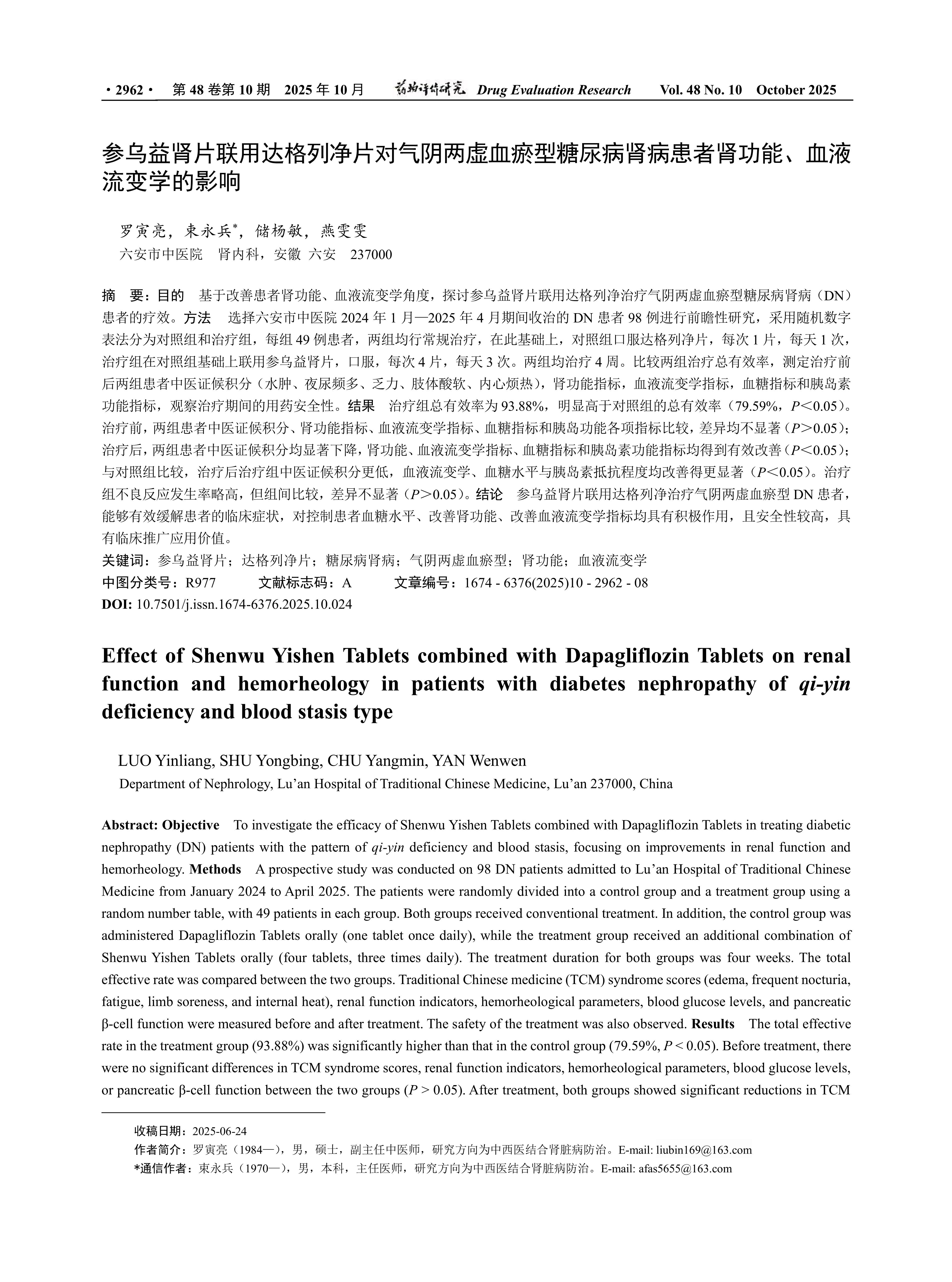 参乌益肾片联用达格列净片对气阴两虚血瘀型糖尿病肾病患者肾功能、血液流变学的影响
