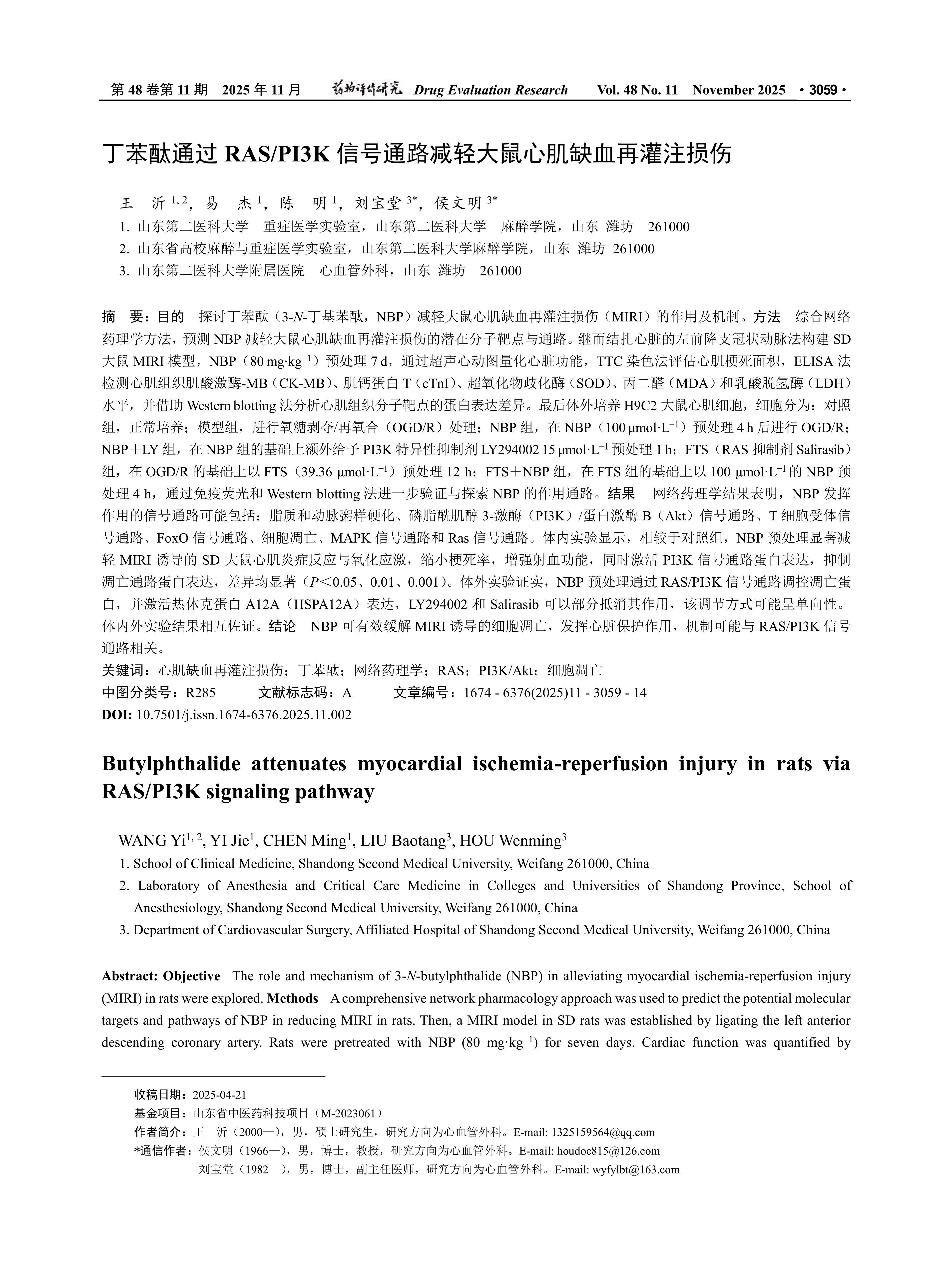 目的 探讨丁苯酞(3-N-丁基苯酞,NBP)减轻大鼠心肌缺血再灌注损伤(MIRI)的作用及机制。方法 综合网络药理学方法,预测NBP减轻大鼠心肌缺血再灌注损伤的潜在分子靶点与通路。继而结扎心脏的左前降支冠状动脉法构建SD大鼠MIRI模型,NBP(80 mg·kg-1)预处理7 d,通过超声心动图量化心脏功能,TTC染色法评估心肌梗死面积,ELISA法检测心肌组织肌酸激酶-MB(CK-MB)、肌钙蛋白T(cTnI)、超氧化物歧化酶(SOD)、丙二醛(MDA)和乳酸脱氢酶(LDH)水平,并借助Western blotting法分析心肌组织分子靶点的蛋白表达差异。最后体外培养H9C2大鼠心肌细胞,细胞分为:对照组,正常培养;模型组,进行氧糖剥夺/再氧合(OGD/R)处理; NBP组,在NBP(100 μmol·L-1)预处理4 h后进行OGD/R;NBP+LY组,在NBP组的基础上额外给予PI3K特异性抑制剂LY294002 15 μmol·L-1预处理1 h; FTS(RAS抑制剂Salirasib)组,在OGD/R的基础上以FTS(39.36 μmol·L-1)预处理12 h; FTS+NBP组,在FTS组的基础上以100 μmol·L-1的NBP预处理4 h,通过免疫荧光和Western blotting法进一步验证与探索NBP的作用通路。结果 网络药理学结果表明,NBP发挥作用的信号通路可能包括:脂质和动脉粥样硬化、磷脂酰肌醇3-激酶(PI3K)/蛋白激酶B(Akt)信号通路、T细胞受体信号通路、FoxO信号通路、细胞凋亡、MAPK信号通路和Ras信号通路。体内实验显示,相较于对照组,NBP预处理显著减轻MIRI诱导的SD大鼠心肌炎症反应与氧化应激,缩小梗死率,增强射血功能,同时激活PI3K信号通路蛋白表达,抑制凋亡通路蛋白表达,差异均显著(P<0.05、0.01、0.001)。体外实验证实,NBP预处理通过RAS/PI3K信号通路调控凋亡蛋白,并激活热休克蛋白A12A(HSPA12A)表达,LY294002和Salirasib可以部分抵消其作用,该调节方式可能呈单向性。体内外实验结果相互佐证。结论 NBP可有效缓解MIRI诱导的细胞凋亡,发挥心脏保护作用,机制可能与RAS/PI3K信号通路相关。