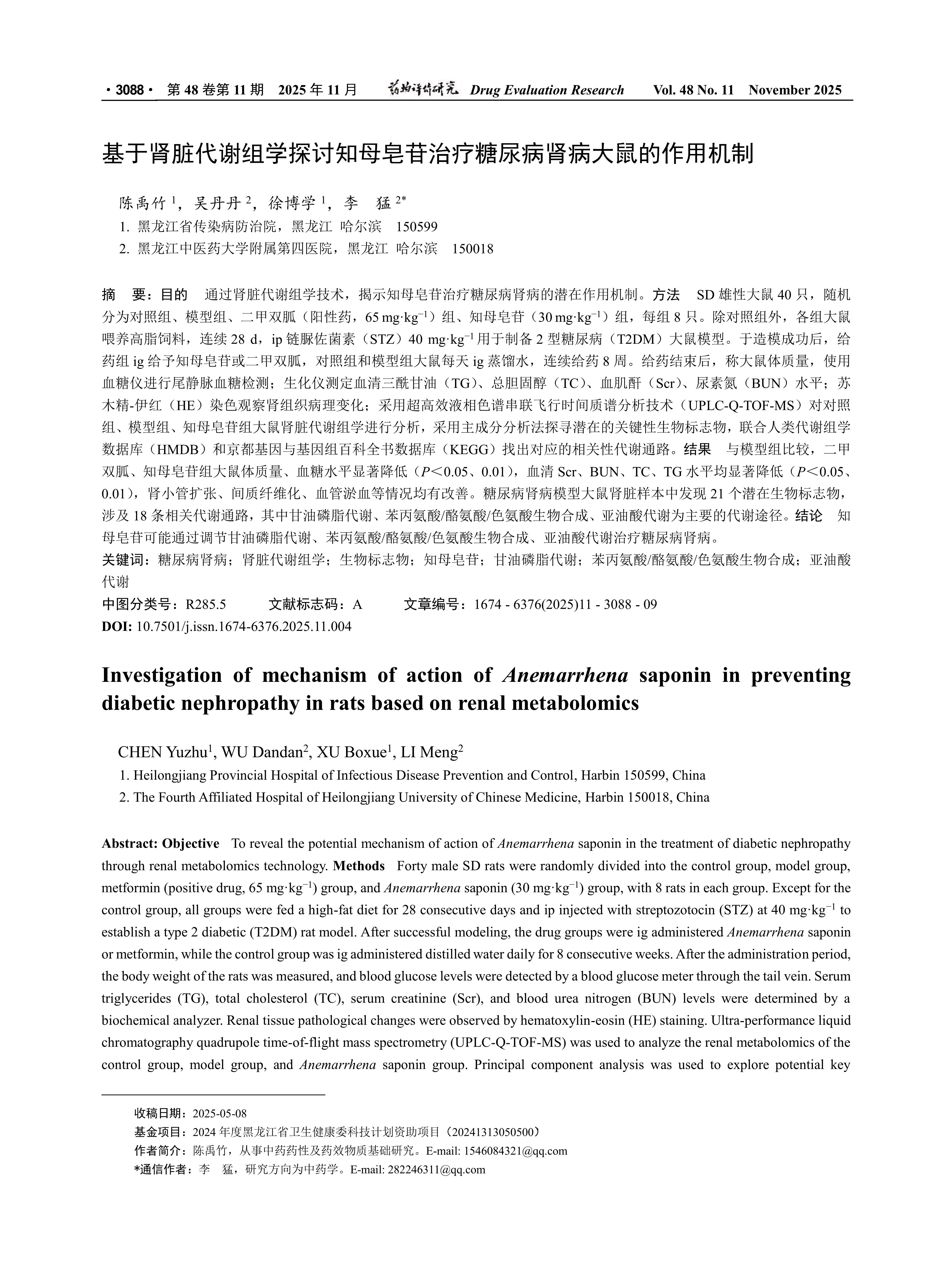目的 通过肾脏代谢组学技术,揭示知母皂苷治疗糖尿病肾病的潜在作用机制。方法 SD雄性大鼠40只,随机分为对照组、模型组、二甲双胍(阳性药,65 mg·kg-1)组、知母皂苷(30 mg·kg-1)组,每组8只。除对照组外,各组大鼠喂养高脂饲料,连续28 d,ip链脲佐菌素(STZ)40 mg·kg-1用于制备2型糖尿病(T2DM)大鼠模型。于造模成功后,给药组ig给予知母皂苷或二甲双胍,对照组和模型组大鼠每天ig蒸馏水,连续给药8周。给药结束后,称大鼠体质量,使用血糖仪进行尾静脉血糖检测;生化仪测定血清三酰甘油(TG)、总胆固醇(TC)、血肌酐(Scr)、尿素氮(BUN)水平;苏木精-伊红(HE)染色观察肾组织病理变化;采用超高效液相色谱串联飞行时间质谱分析技术(UPLC-Q-TOF-MS)对对照组、模型组、知母皂苷组大鼠肾脏代谢组学进行分析,采用主成分分析法探寻潜在的关键性生物标志物,联合人类代谢组学数据库(HMDB)和京都基因与基因组百科全书数据库(KEGG)找出对应的相关性代谢通路。结果 与模型组比较,二甲双胍、知母皂苷组大鼠体质量、血糖水平显著降低(P<0.05、0.01),血清Scr、BUN、TC、TG水平均显著降低(P<0.05、0.01),肾小管扩张、间质纤维化、血管淤血等情况均有改善。糖尿病肾病模型大鼠肾脏样本中发现21个潜在生物标志物,涉及18条相关代谢通路,其中甘油磷脂代谢、苯丙氨酸/酪氨酸/色氨酸生物合成、亚油酸代谢为主要的代谢途径。结论 知母皂苷可能通过调节甘油磷脂代谢、苯丙氨酸/酪氨酸/色氨酸生物合成、亚油酸代谢治疗糖尿病肾病。