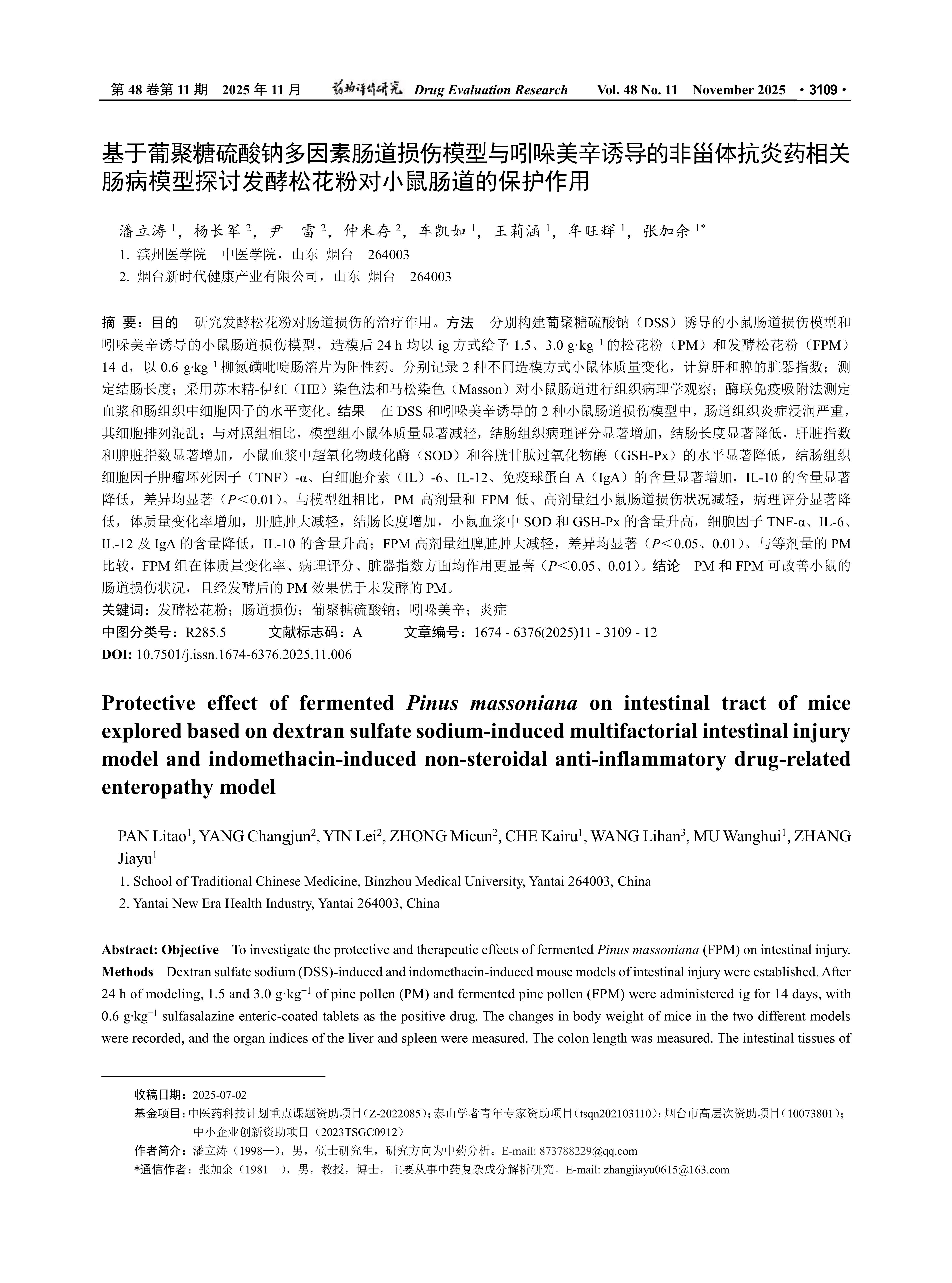 Objective To investigate the protective and therapeutic effects of fermented Pinus massoniana (FPM) on intestinal injury. Methods Dextran sulfate sodium (DSS)-induced and indomethacin-induced mouse models of intestinal injury were established. After 24 h of modeling, 1.5 and 3.0 g·kg-1 of pine pollen (PM) and fermented pine pollen (FPM) were administered ig for 14 days, with 0.6 g·kg-1 sulfasalazine enteric-coated tablets as the positive drug. The changes in body weight of mice in the two different models were recorded, and the organ indices of the liver and spleen were measured. The colon length was measured. The intestinal tissues of mice were observed histopathologically by hematoxylin-eosin staining (HE) and Masson staining. The levels of cytokines in plasma and intestinal tissues were determined by enzyme-linked immunosorbent assay. Results In the two mouse models of intestinal injury induced by DSS and indomethacin, the intestinal tissue showed severe inflammatory infiltration and disordered cell arrangement. Compared with the control group, the model group showed significant weight loss, significantly increased colonic histopathological scores, significantly reduced colon length, significantly increased liver and spleen coefficients, significantly decreased levels of superoxide dismutase (SOD) and glutathione peroxidase (GSH-Px) in plasma, and significantly increased levels of cytokines TNF-α, IL-6, IL-12, and IgA in colonic tissues, and significantly decreased levels of IL-10, with significant differences (P < 0.01). Compared with the model group, the high-dose PM and low- and high-dose FPM groups showed alleviated intestinal injury, significantly reduced histopathological scores, increased body weight change rates, reduced liver enlargement, increased colon length, increased levels of SOD and GSH-Px in plasma, decreased levels of cytokines TNF-α, IL-6, IL-12, and IgA, and increased levels of IL-10; the highdose FPM group showed reduced spleen enlargement, with significant differences (P < 0.05, 0.01). Compared with the same dose of PM, the FPM group showed more significant effects in body weight change rate, histopathological score, and organ coefficie nt (P < 0.05, 0.01). Conclusion PM and FPM can improve intestinal injury in mice with colitis, and FPM exhibits better efficacy than unfermented PM.