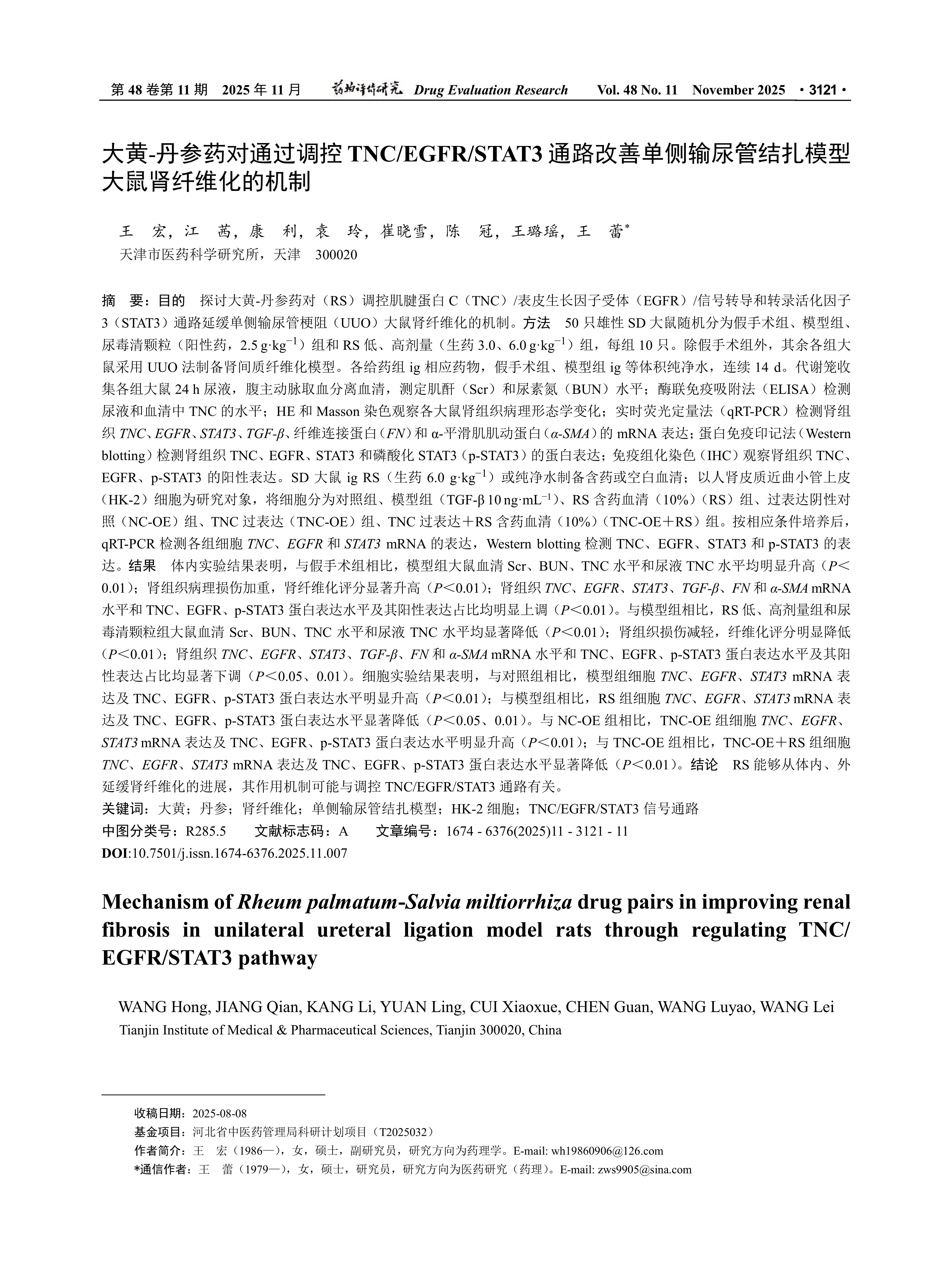 目的 探讨大黄-丹参药对(RS)调控肌腱蛋白C(TNC)/表皮生长因子受体(EGFR)/信号转导和转录活化因子3(STAT3)通路延缓单侧输尿管梗阻(UUO)大鼠肾纤维化的机制。方法 50只雄性SD大鼠随机分为假手术组、模型组、尿毒清颗粒(阳性药,2.5 g·kg-1)组和RS低、高剂量(生药3.0、6.0 g·kg-1)组,每组10只。除假手术组外,其余各组大鼠采用UUO法制备肾间质纤维化模型。各给药组ig相应药物,假手术组、模型组ig等体积纯净水,连续14 d。代谢笼收集各组大鼠24 h尿液,腹主动脉取血分离血清,测定肌酐(Scr)和尿素氮(BUN)水平;酶联免疫吸附法(ELISA)检测尿液和血清中TNC的水平;HE和Masson染色观察各大鼠肾组织病理形态学变化;实时荧光定量法(qRT-PCR)检测肾组织TNC、EGFR、STAT3、TGF-β、纤维连接蛋白(FN)和α-平滑肌肌动蛋白(α-SMA)的m RNA表达;蛋白免疫印记法(Western blotting)检测肾组织TNC、EGFR、STAT3和磷酸化STAT3(p-STAT3)的蛋白表达;免疫组化染色(IHC)观察肾组织TNC、EGFR、p-STAT3的阳性表达。SD大鼠ig RS (生药6.0 g·kg-1)或纯净水制备含药或空白血清;以人肾皮质近曲小管上皮(HK-2)细胞为研究对象,将细胞分为对照组、模型组(TGF-β 10 ng·mL-1)、RS含药血清(10%)(RS)组、过表达阴性对照(NC-OE)组、TNC过表达(TNC-OE)组、TNC过表达+RS含药血清(10%)(TNC-OE+RS)组。按相应条件培养后,qRT-PCR检测各组细胞TNC、EGFR和STAT3 mRNA的表达,Western blotting检测TNC、EGFR、STAT3和p-STAT3的表达。结果 体内实验结果表明,与假手术组相比,模型组大鼠血清Scr、BUN、TNC水平和尿液TNC水平均明显升高(P<0.01);肾组织病理损伤加重,肾纤维化评分显著升高(P<0.01);肾组织TNC、EGFR、STAT3、TGF-β、FN和α-SMA m RNA水平和TNC、EGFR、p-STAT3蛋白表达水平及其阳性表达占比均明显上调(P<0.01)。与模型组相比,RS低、高剂量组和尿毒清颗粒组大鼠血清Scr、BUN、TNC水平和尿液TNC水平均显著降低(P<0.01);肾组织损伤减轻,纤维化评分明显降低(P<0.01);肾组织TNC、EGFR、STAT3、TGF-β、FN和α-SMA m RNA水平和TNC、EGFR、p-STAT3蛋白表达水平及其阳性表达占比均显著下调(P<0.05、0.01)。细胞实验结果表明,与对照组相比,模型组细胞TNC、EGFR、STAT3 m RNA表达及TNC、EGFR、p-STAT3蛋白表达水平明显升高(P<0.01);与模型组相比,RS组细胞TNC、EGFR、STAT3 m RNA表达及TNC、EGFR、p-STAT3蛋白表达水平显著降低(P<0.05、0.01)。与NC-OE组相比,TNC-OE组细胞TNC、EGFR、STAT3 m RNA表达及TNC、EGFR、p-STAT3蛋白表达水平明显升高(P<0.01);与TNC-OE组相比,TNC-OE+RS组细胞TNC、EGFR、STAT3 mRNA表达及TNC、EGFR、p-STAT3蛋白表达水平显著降低(P<0.01)。结论 RS能够从体内、外延缓肾纤维化的进展,其作用机制可能与调控TNC/EGFR/STAT3通路有关。
