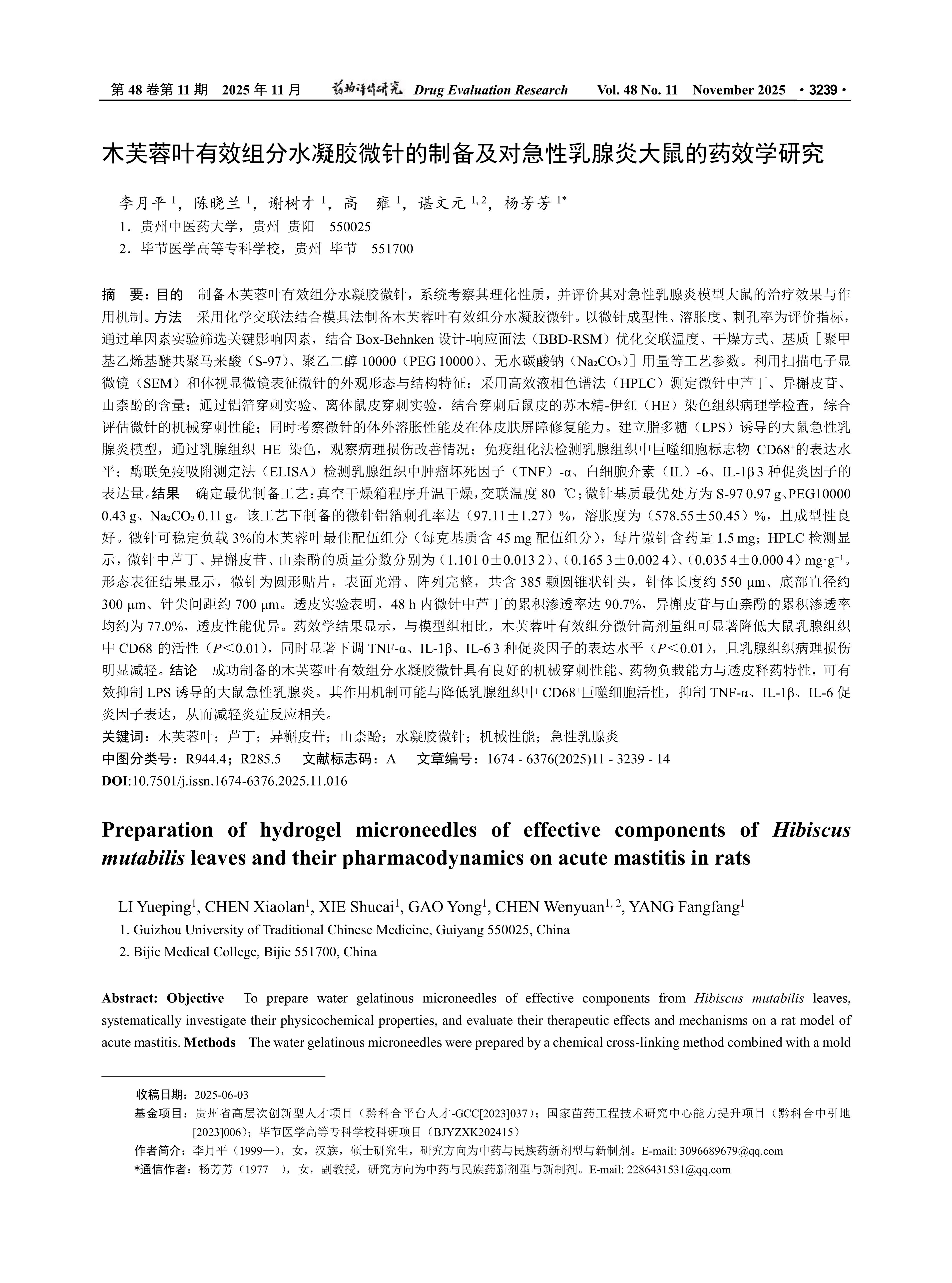 目的 制备木芙蓉叶有效组分水凝胶微针,系统考察其理化性质,并评价其对急性乳腺炎模型大鼠的治疗效果与作用机制。方法 采用化学交联法结合模具法制备木芙蓉叶有效组分水凝胶微针。以微针成型性、溶胀度、刺孔率为评价指标,通过单因素实验筛选关键影响因素,结合Box-Behnken设计-响应面法(BBD-RSM)优化交联温度、干燥方式、基质[聚甲基乙烯基醚共聚马来酸(S-97)、聚乙二醇10000(PEG 10000)、无水碳酸钠(Na2CO3)]用量等工艺参数。利用扫描电子显微镜(SEM)和体视显微镜表征微针的外观形态与结构特征;采用高效液相色谱法(HPLC)测定微针中芦丁、异槲皮苷、山柰酚的含量;通过铝箔穿刺实验、离体鼠皮穿刺实验,结合穿刺后鼠皮的苏木精-伊红(HE)染色组织病理学检查,综合评估微针的机械穿刺性能;同时考察微针的体外溶胀性能及在体皮肤屏障修复能力。建立脂多糖(LPS)诱导的大鼠急性乳腺炎模型,通过乳腺组织HE染色,观察病理损伤改善情况;免疫组化法检测乳腺组织中巨噬细胞标志物CD68+的表达水平;酶联免疫吸附测定法(ELISA)检测乳腺组织中肿瘤坏死因子(TNF)-α、白细胞介素(IL)-6、IL-1β 3种促炎因子的表达量。结果 确定最优制备工艺:真空干燥箱程序升温干燥,交联温度80℃;微针基质最优处方为S-97 0.97 g、PEG100000.43 g、Na2CO3 0.11 g。该工艺下制备的微针铝箔刺孔率达(97.11±1.27)%,溶胀度为(578.55±50.45)%,且成型性良好。微针可稳定负载3%的木芙蓉叶最佳配伍组分(每克基质含45 mg配伍组分),每片微针含药量1.5 mg; HPLC检测显示,微针中芦丁、异槲皮苷、山柰酚的质量分数分别为(1.101 0±0.013 2)、(0.165 3±0.002 4)、(0.035 4±0.000 4) mg·g-1。形态表征结果显示,微针为圆形贴片,表面光滑、阵列完整,共含385颗圆锥状针头,针体长度约550 μm、底部直径约300 μm、针尖间距约700 μm。透皮实验表明,48 h内微针中芦丁的累积渗透率达90.7%,异槲皮苷与山柰酚的累积渗透率均约为77.0%,透皮性能优异。药效学结果显示,与模型组相比,木芙蓉叶有效组分微针高剂量组可显著降低大鼠乳腺组织中CD68+的活性(P<0.01),同时显著下调TNF-α、IL-1β、IL-6 3种促炎因子的表达水平(P<0.01),且乳腺组织病理损伤明显减轻。结论 成功制备的木芙蓉叶有效组分水凝胶微针具有良好的机械穿刺性能、药物负载能力与透皮释药特性,可有效抑制LPS诱导的大鼠急性乳腺炎。其作用机制可能与降低乳腺组织中CD68+巨噬细胞活性,抑制TNF-α、IL-1β、IL-6促炎因子表达,从而减轻炎症反应相关。