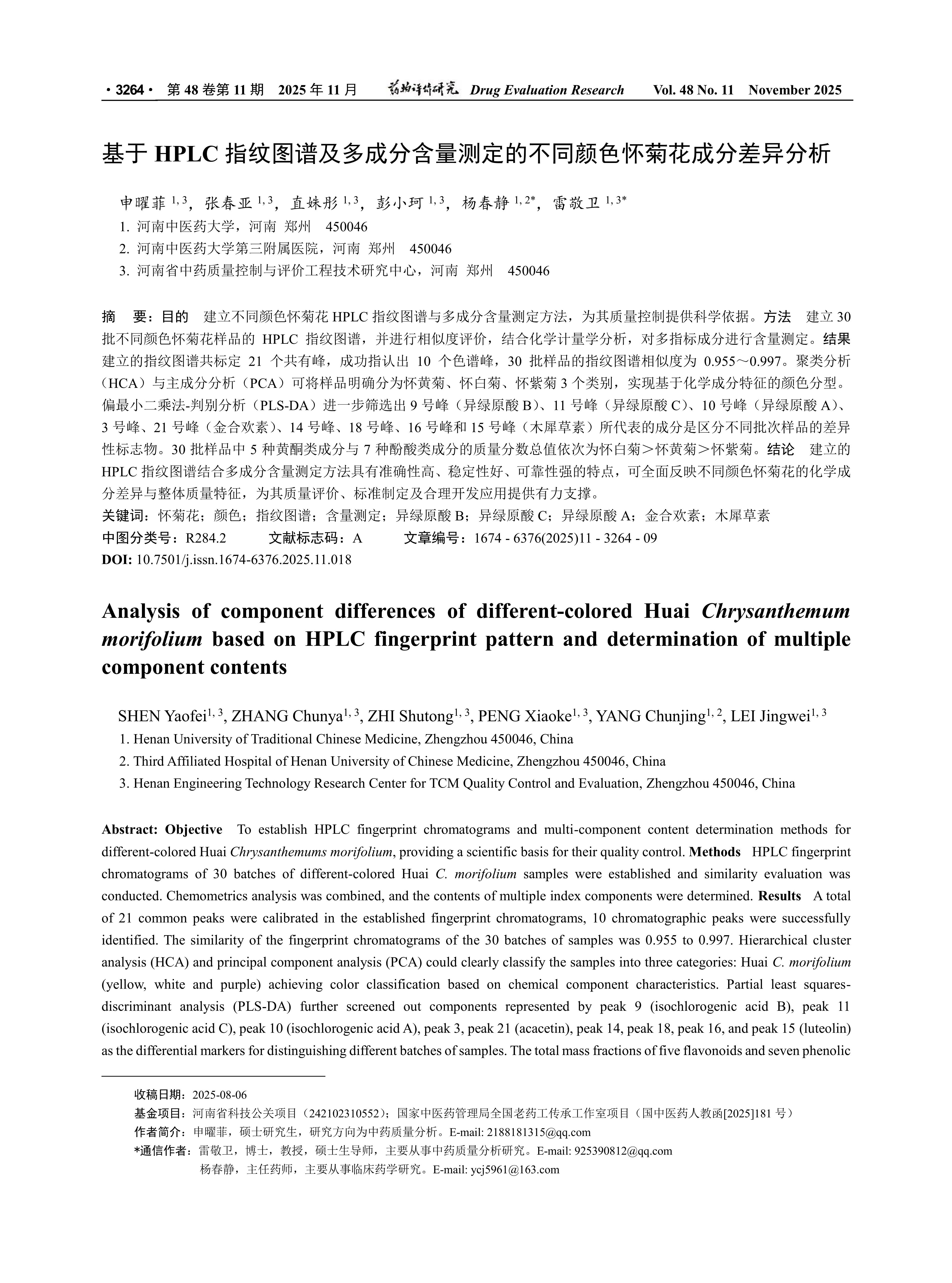 Objective To establish HPLC fingerprint chromatograms and multi-component content determination methods for different-colored Huai Chrysanthemums morifolium, providing a scientific basis for their quality control. Methods HPLC fingerprint chromatograms of 30 batches of different-colored Huai C. morifolium samples were established and similarity evaluation was conducted. Chemometrics analysis was combined, and the contents of multiple index components were determined. Results A total of 21 common peaks were calibrated in the established fingerprint chromatograms, 10 chromatographic peaks were successfully identified. The similarity of the fingerprint chromatograms of the 30 batches of samples was 0.955 to 0.997. Hierarchical cluster analysis (HCA) and principal component analysis (PCA) could clearly classify the samples into three categories: Huai C. morifolium (yellow, white and purple) achieving color classification based on chemical component characteristics. Partial least squaresdiscriminant analysis (PLS-DA) further screened out components represented by peak 9 (isochlorogenic acid B), peak 11 (isochlorogenic acid C), peak 10 (isochlorogenic acid A), peak 3, peak 21 (acacetin), peak 14, peak 18, peak 16, and peak 15 (luteolin) as the differential markers for distinguishing different batches of samples. The total mass fractions of five flavonoids and seven phenolic acids in the 30 batches of samples were in the order of Huai white C. morifolium > Huai yellow C. morifolium > Huai purple C. morifolium. Conclusion The HPLC fingerprint chromatogram combined with multi-component content determination method established in this study has the characteristics of high accuracy, good stability, and strong reliability. It can comprehensively reflect the chemical component differences and overall quality characteristics of different-colored Huai C. morifolium, providing strong support for their quality evaluation, standard formulation, and rational development and application.