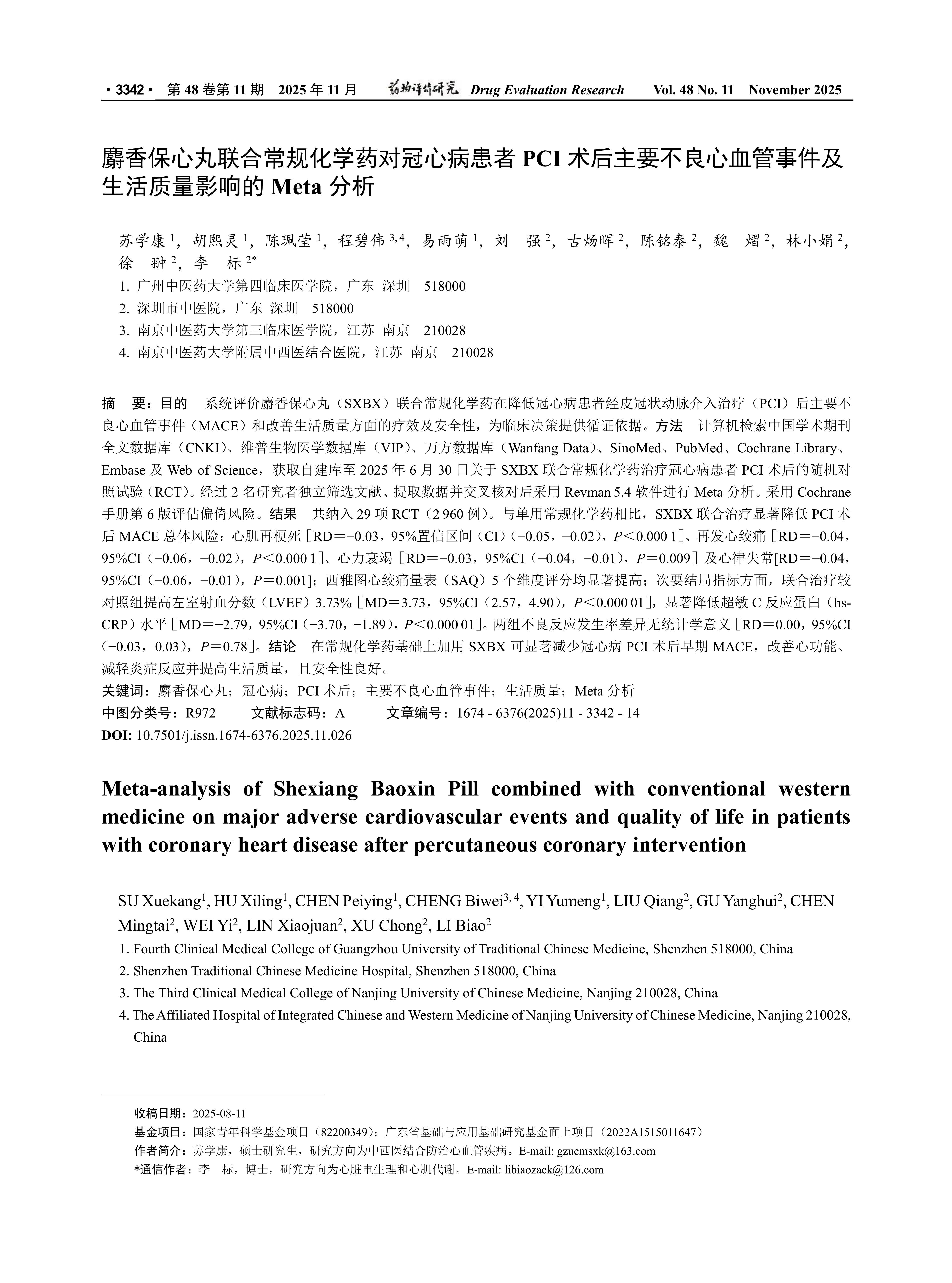 目的 系统评价麝香保心丸(SXBX)联合常规化学药在降低冠心病患者经皮冠状动脉介入治疗(PCI)后主要不良心血管事件(MACE)和改善生活质量方面的疗效及安全性,为临床决策提供循证依据。方法 计算机检索中国学术期刊全文数据库(CNKI)、维普生物医学数据库(VIP)、万方数据库(Wanfang Data)、SinoMed、PubMed、Cochrane Library、Embase及Web of Science,获取自建库至2025年6月30日关于SXBX联合常规化学药治疗冠心病患者PCI术后的随机对照试验(RCT)。经过2名研究者独立筛选文献、提取数据并交叉核对后采用Revman 5.4软件进行Meta分析。采用Cochrane手册第6版评估偏倚风险。结果 共纳入29项RCT(2 960例)。与单用常规化学药相比,SXBX联合治疗显著降低PCI术后MACE总体风险:心肌再梗死[RD=-0.03,95%置信区间(CI)(-0.05,-0.02),P<0.000 1]、再发心绞痛[RD=-0.04,95% CI(-0.06,-0.02),P<0.000 1]、心力衰竭[RD=-0.03,95% CI(-0.04,-0.01),P=0.009]及心律失常[RD=-0.04,95% CI(-0.06,-0.01),P=0.001];西雅图心绞痛量表(SAQ) 5个维度评分均显著提高;次要结局指标方面,联合治疗较对照组提高左室射血分数(LVEF) 3.73%[MD=3.73,95% CI(2.57,4.90),P<0.000 01],显著降低超敏C反应蛋白(hsCRP)水平[MD=-2.79,95% CI(-3.70,-1.89),P<0.000 01]。两组不良反应发生率差异无统计学意义[RD=0.00,95% CI(-0.03,0.03),P=0.78]。结论 在常规化学药基础上加用SXBX可显著减少冠心病PCI术后早期MACE,改善心功能、减轻炎症反应并提高生活质量,且安全性良好。