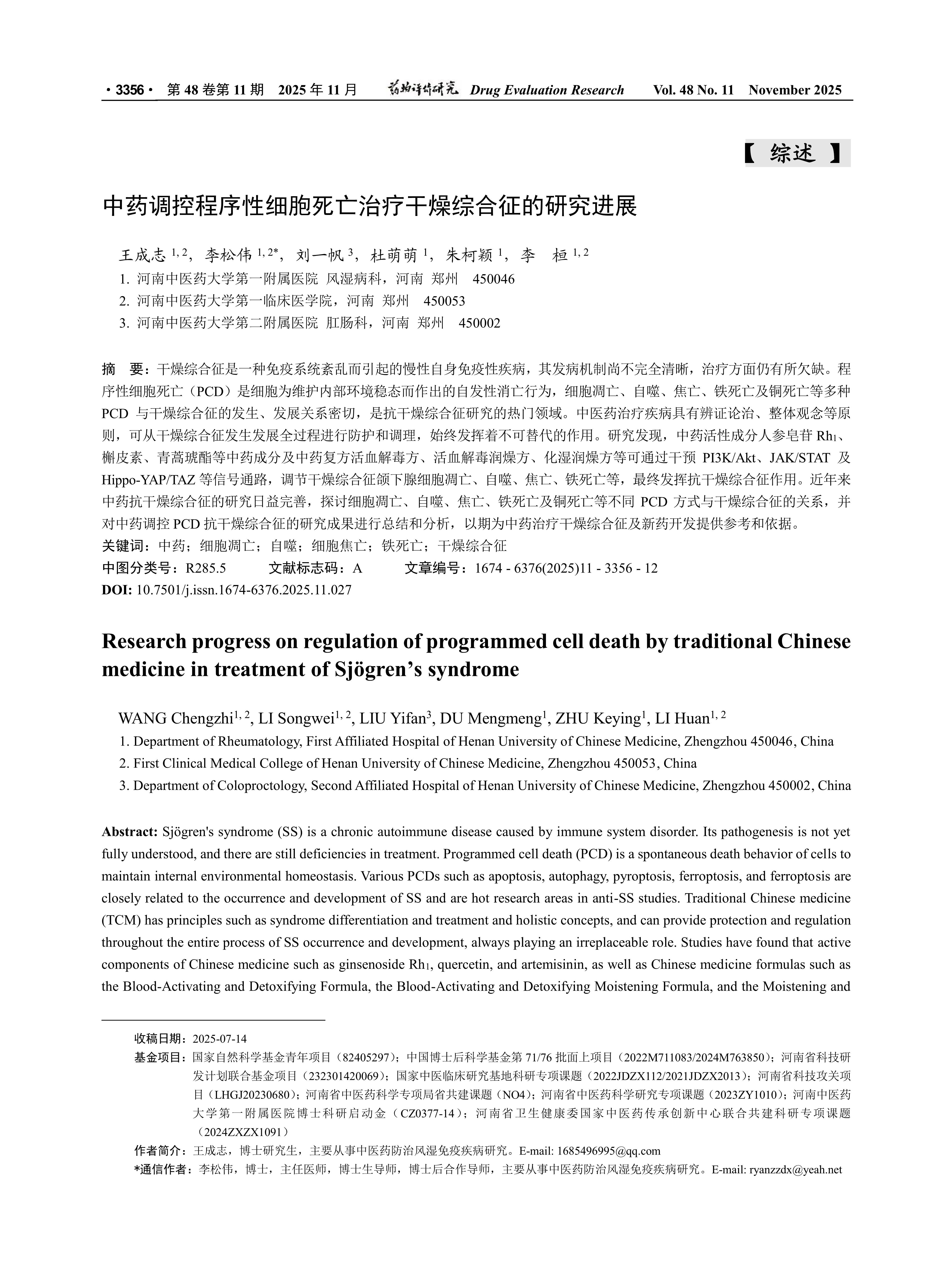 国家自然科学基金青年项目(82405297);中国博士后科学基金第71/76批面上项目(2022M711083/2024M763850);河南省科技研发计划联合基金项目(232301420069);国家中医临床研究基地科研专项课题(2022JDZX112/2021JDZX2013);河南省科技攻关项目(LHGJ20230680);河南省中医药科学专项局省共建课题(NO4);河南省中医药科学研究专项课题(2023ZY1010);河南中医药大学第一附属医院博士科研启动金(CZ0377-14);河南省卫生健康委国家中医药传承创新中心联合共建科研专项课题(2024ZXZX1091)