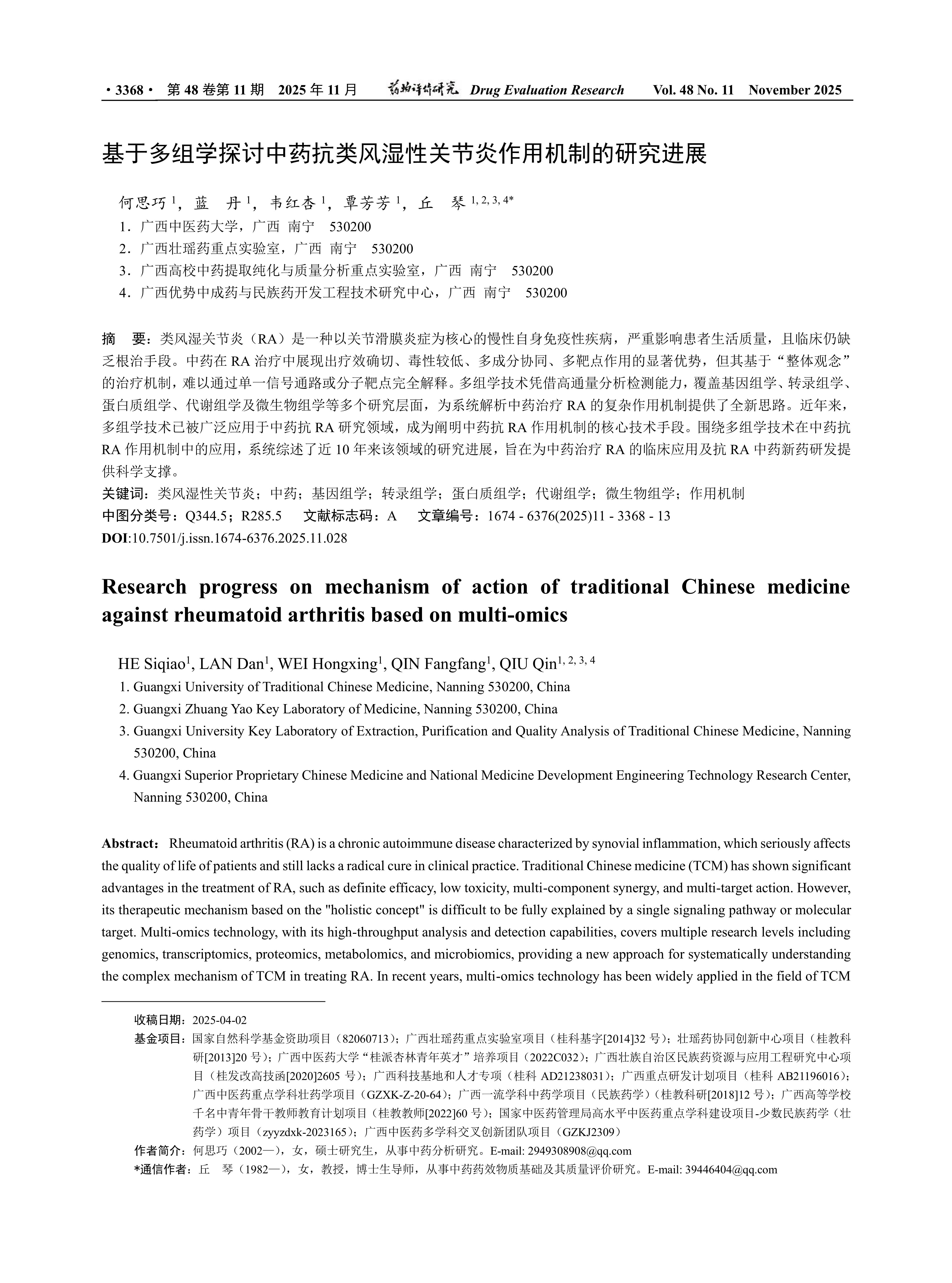 类风湿关节炎(RA)是一种以关节滑膜炎症为核心的慢性自身免疫性疾病,严重影响患者生活质量,且临床仍缺乏根治手段。中药在RA治疗中展现出疗效确切、毒性较低、多成分协同、多靶点作用的显著优势,但其基于“整体观念”的治疗机制,难以通过单一信号通路或分子靶点完全解释。多组学技术凭借高通量分析检测能力,覆盖基因组学、转录组学、蛋白质组学、代谢组学及微生物组学等多个研究层面,为系统解析中药治疗RA的复杂作用机制提供了全新思路。近年来,多组学技术已被广泛应用于中药抗RA研究领域,成为阐明中药抗RA作用机制的核心技术手段。围绕多组学技术在中药抗RA作用机制中的应用,系统综述了近10年来该领域的研究进展,旨在为中药治疗RA的临床应用及抗RA中药新药研发提供科学支撑。