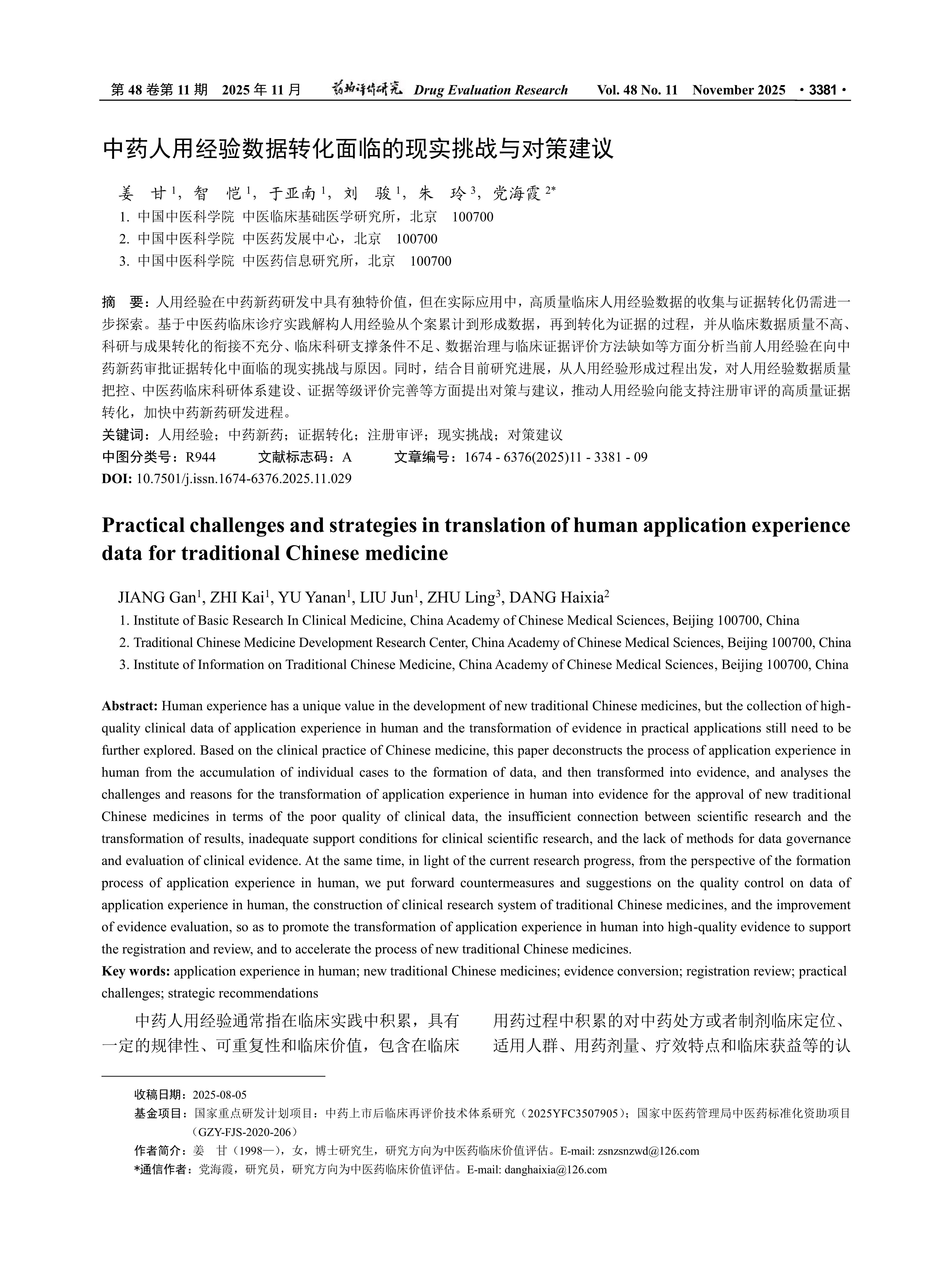Human experience has a unique value in the development of new traditional Chinese medicines, but the collection of highquality clinical data of application experience in human and the transformation of evidence in practical applications still need to be further explored. Based on the clinical practice of Chinese medicine, this paper deconstructs the process of application experience in human from the accumulation of individual cases to the formation of data, and then transformed into evidence, and analyses the challenges and reasons for the transformation of application experience in human into evidence for the approval of new traditional Chinese medicines in terms of the poor quality of clinical data, the insufficient connection between scientific research and the transformation of results, inadequate support conditions for clinical scientific research, and the lack of methods for data governance and evaluation of clinical evidence. At the same time, in light of the current research progress, from the perspective of the formation process of application experience in human, we put forward countermeasures and suggestions on the quality control on data of application experience in human, the construction of clinical research system of traditional Chinese medicines, and the improvement of evidence evaluation, so as to promote the transformation of application experience in human into high-quality evidence to support the registration and review, and to accelerate the process of new traditional Chinese medicines.