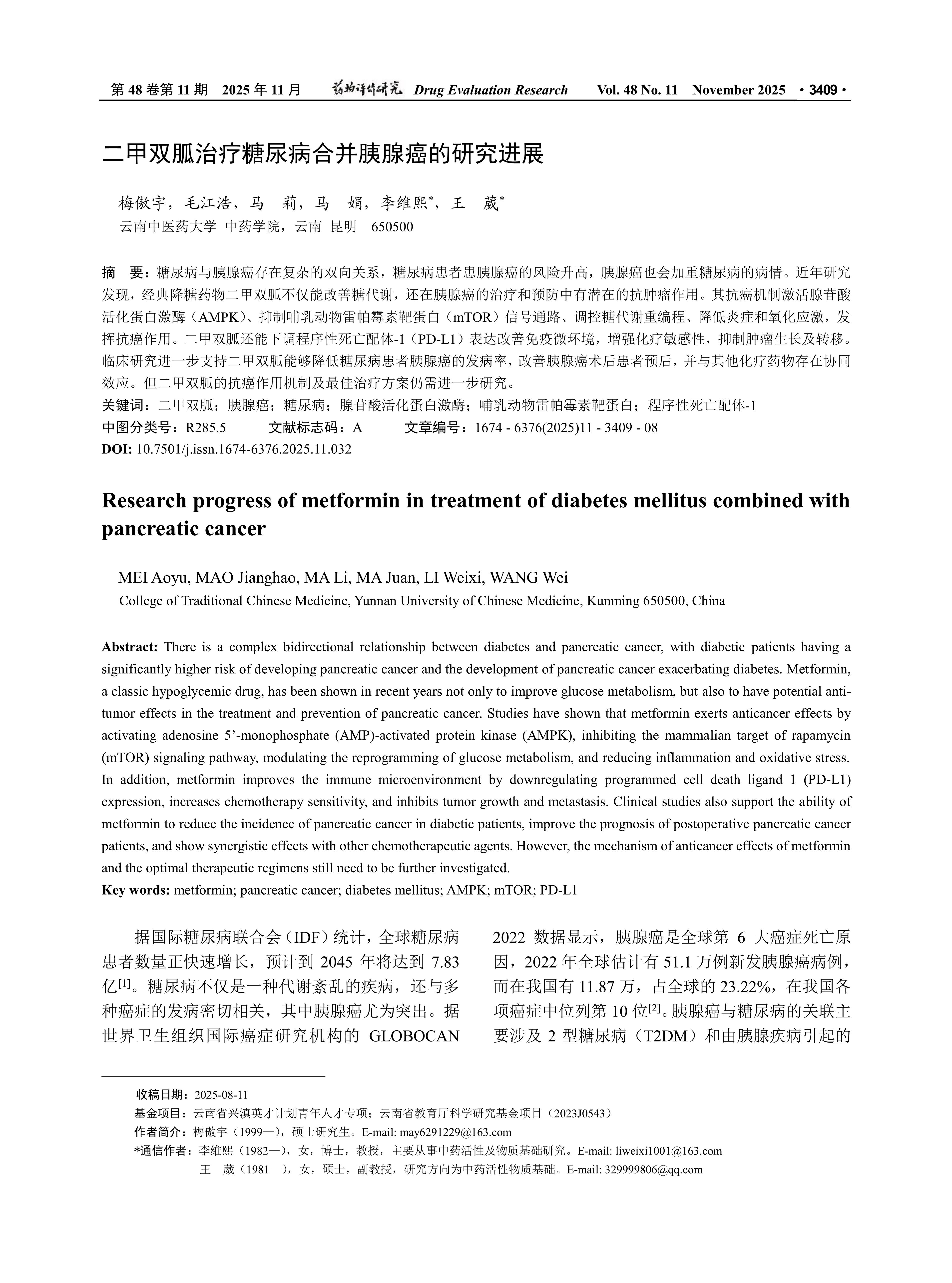糖尿病与胰腺癌存在复杂的双向关系,糖尿病患者患胰腺癌的风险升高,胰腺癌也会加重糖尿病的病情。近年研究发现,经典降糖药物二甲双胍不仅能改善糖代谢,还在胰腺癌的治疗和预防中有潜在的抗肿瘤作用。其抗癌机制激活腺苷酸活化蛋白激酶(AMPK)、抑制哺乳动物雷帕霉素靶蛋白(mTOR)信号通路、调控糖代谢重编程、降低炎症和氧化应激,发挥抗癌作用。二甲双胍还能下调程序性死亡配体-1(PD-L1)表达改善免疫微环境,增强化疗敏感性,抑制肿瘤生长及转移。临床研究进一步支持二甲双胍能够降低糖尿病患者胰腺癌的发病率,改善胰腺癌术后患者预后,并与其他化疗药物存在协同效应。但二甲双胍的抗癌作用机制及最佳治疗方案仍需进一步研究。