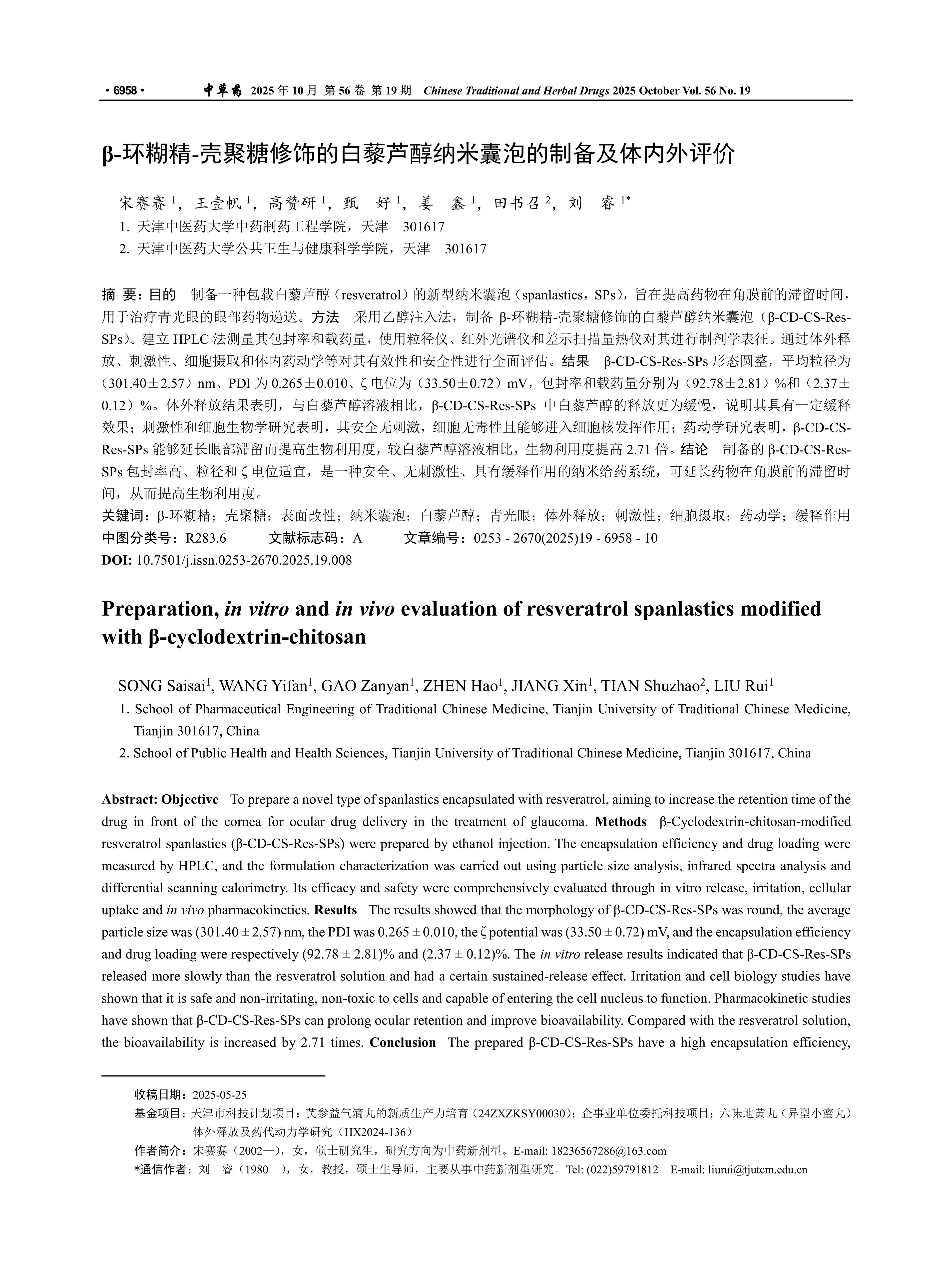 Objective To prepare a novel type of spanlastics encapsulated with resveratrol, aiming to increase the retention time of the drug in front of the cornea for ocular drug delivery in the treatment of glaucoma. Methods β-Cyclodextrin-chitosan-modified resveratrol spanlastics (β-CD-CS-Res-SPs) were prepared by ethanol injection. The encapsulation efficiency and drug loading were measured by HPLC, and the formulation characterization was carried out using particle size analysis, infrared spectra analysis and differential scanning calorimetry. Its efficacy and safety were comprehensively evaluated through in vitro release, irritation, cellular uptake and in vivo pharmacokinetics. Results The results showed that the morphology of β-CD-CS-Res-SPs was round, the average particle size was (301.40 ± 2.57) nm, the PDI was 0.265 ± 0.010, the ζ potential was (33.50 ± 0.72) mV, and the encapsulation efficiency and drug loading were respectively (92.78 ± 2.81)% and (2.37 ± 0.12)%. The in vitro release results indicated that β-CD-CS-Res-SPs released more slowly than the resveratrol solution and had a certain sustained-release effect. Irritation and cell biology studies have shown that it is safe and non-irritating, non-toxic to cells and capable of entering the cell nucleus to function. Pharmacokinetic studies have shown that β-CD-CS-Res-SPs can prolong ocular retention and improve bioavailability. Compared with the resveratrol solution, the bioavailability is increased by 2.71 times. Conclusion The prepared β-CD-CS-Res-SPs have a high encapsulation efficiency, appropriate particle size and ζ potential. It is a safe, non-irritating and sustained-release nano-drug delivery system, which can prolong the retention time of drugs in front of the cornea and thus improve bioavailability.