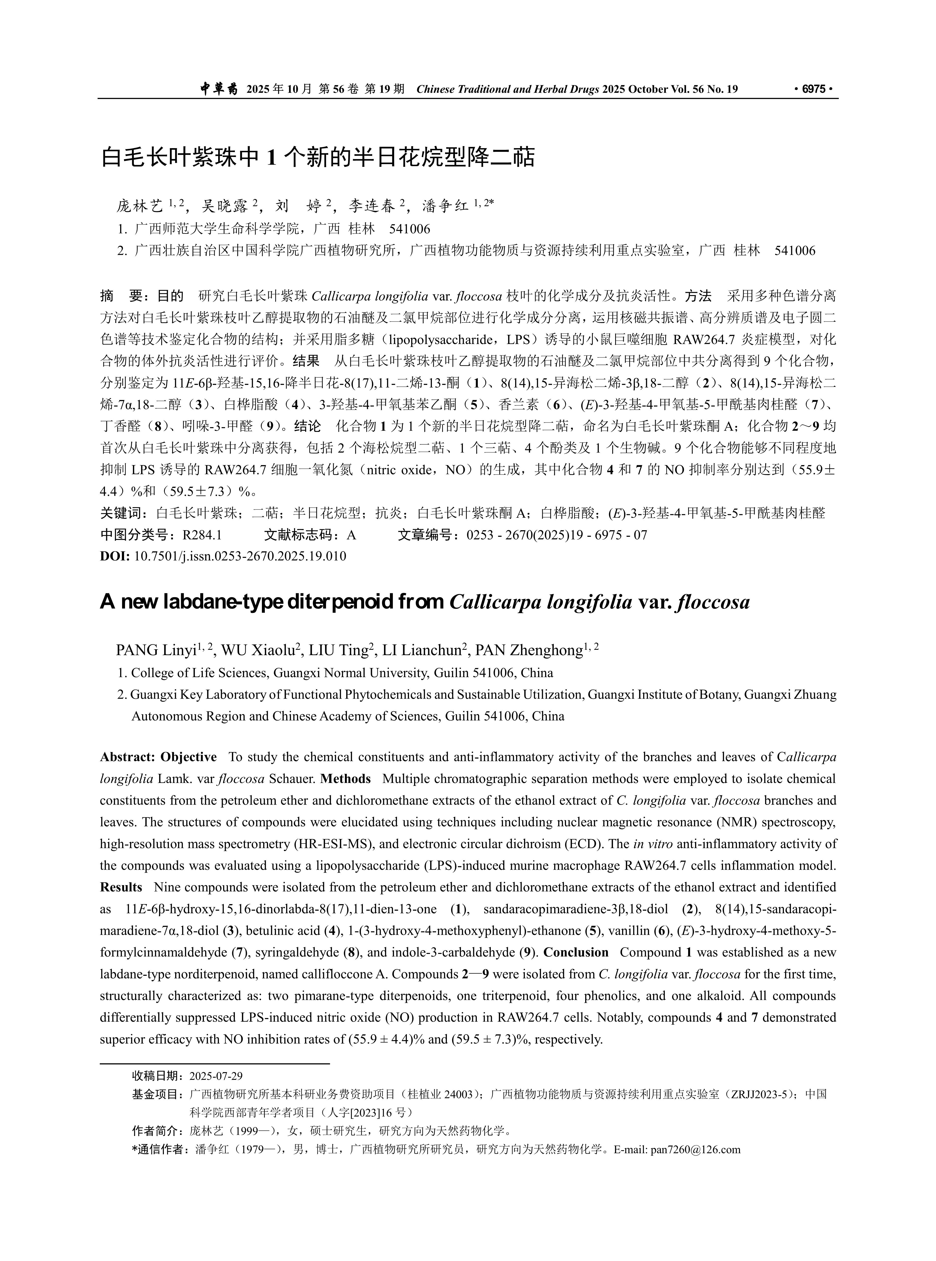 Objective To study the chemical constituents and anti-inflammatory activity of the branches and leaves of Callicarpa longifolia Lamk. var floccosa Schauer. Methods Multiple chromatographic separation methods were employed to isolate chemical constituents from the petroleum ether and dichloromethane extracts of the ethanol extract of C. longifolia var. floccosa branches and leaves. The structures of compounds were elucidated using techniques including nuclear magnetic resonance (NMR) spectroscopy, high-resolution mass spectrometry (HR-ESI-MS), and electronic circular dichroism (ECD). The in vitro anti-inflammatory activity of the compounds was evaluated using a lipopolysaccharide (LPS)-induced murine macrophage RAW264.7 cells inflammation model. Results Nine compounds were isolated from the petroleum ether and dichloromethane extracts of the ethanol extract and identified as 11E-6β-hydroxy-15,16-dinorlabda-8(17),11-dien-13-one (1), sandaracopimaradiene-3β,18-diol (2), 8(14),15-sandaracopi- maradiene-7α,18-diol (3), betulinic acid (4), 1-(3-hydroxy-4-methoxyphenyl)-ethanone (5), vanillin (6), (E)-3-hydroxy-4-methoxy-5-formylcinnamaldehyde (7), syringaldehyde (8), and indole-3-carbaldehyde (9). Conclusion Compound 1 was established as a new labdane-type norditerpenoid, named callifloccone A. Compounds 2—9 were isolated from C. longifolia var. floccosa for the first time, structurally characterized as: two pimarane-type diterpenoids, one triterpenoid, four phenolics, and one alkaloid. All compounds differentially suppressed LPS-induced nitric oxide (NO) production in RAW264.7 cells. Notably, compounds 4 and 7 demonstrated superior efficacy with NO inhibition rates of (55.9 ± 4.4)% and (59.5 ± 7.3)%, respectively.