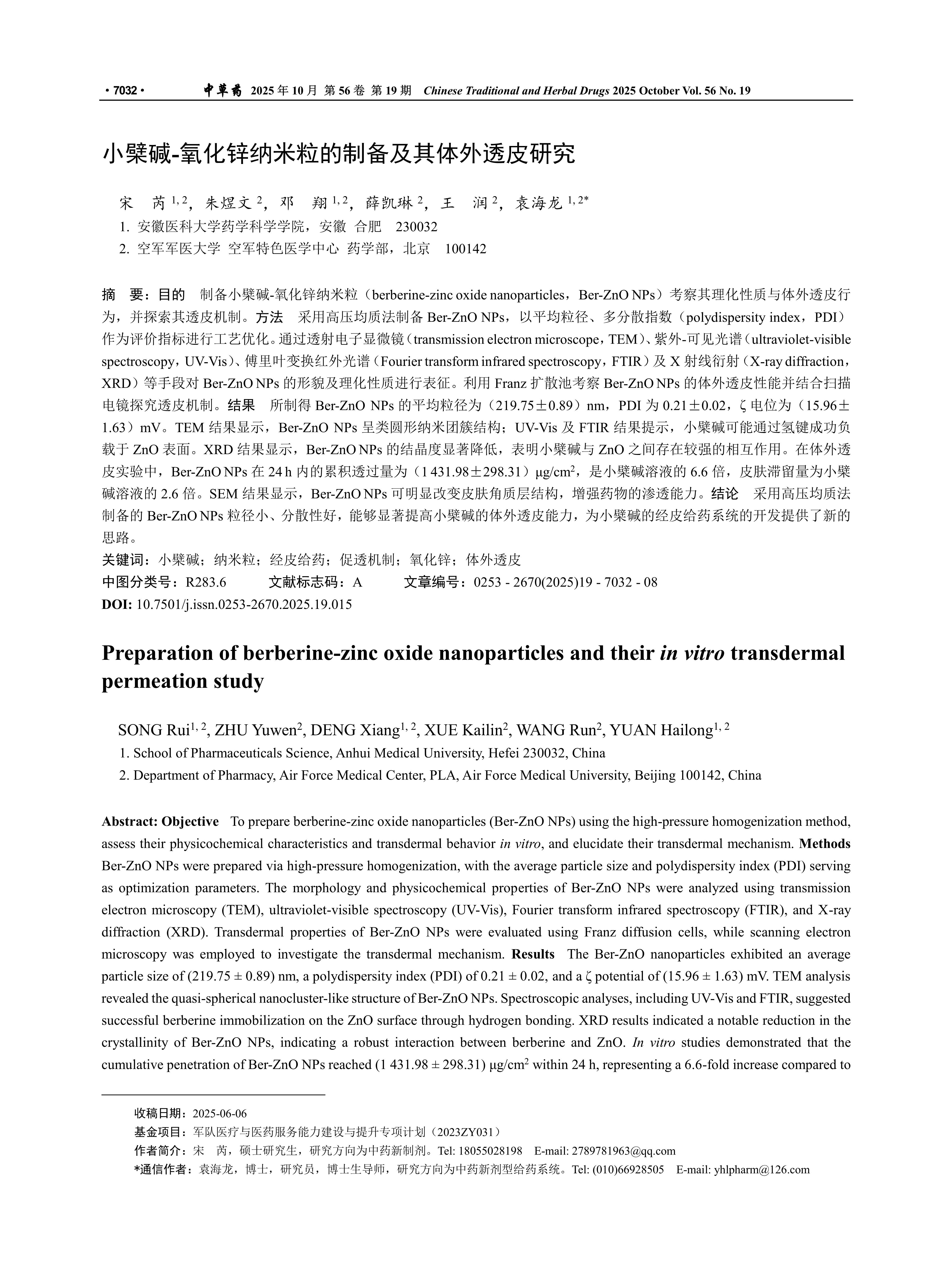 Objective To prepare berberine-zinc oxide nanoparticles (Ber-ZnO NPs) using the high-pressure homogenization method, assess their physicochemical characteristics and transdermal behavior in vitro, and elucidate their transdermal mechanism. Methods Ber-ZnO NPs were prepared via high-pressure homogenization, with the average particle size and polydispersity index (PDI) serving as optimization parameters. The morphology and physicochemical properties of Ber-ZnO NPs were analyzed using transmission electron microscopy (TEM), ultraviolet-visible spectroscopy (UV-Vis), Fourier transform infrared spectroscopy (FTIR), and X-ray diffraction (XRD). Transdermal properties of Ber-ZnO NPs were evaluated using Franz diffusion cells, while scanning electron microscopy was employed to investigate the transdermal mechanism. Results The Ber-ZnO nanoparticles exhibited an average particle size of (219.75 ± 0.89) nm, a polydispersity index (PDI) of 0.21 ± 0.02, and a ζ potential of (15.96 ± 1.63) mV. TEM analysis revealed the quasi-spherical nanocluster-like structure of Ber-ZnO NPs. Spectroscopic analyses, including UV-Vis and FTIR, suggested successful berberine immobilization on the ZnO surface through hydrogen bonding. XRD results indicated a notable reduction in the crystallinity of Ber-ZnO NPs, indicating a robust interaction between berberine and ZnO. In vitro studies demonstrated that the cumulative penetration of Ber-ZnO NPs reached (1 431.98 ± 298.31) μg/cm2 within 24 h, representing a 6.6-fold increase compared to berberine solution, with skin retention being 2.6 times higher than that of berberine solution. Scanning electron microscopy (SEM) images illustrated the significant alteration of the stratum corneum structure by Ber-ZnO NPs, leading to enhanced drug penetration. Conclusion Ber-ZnO NPs, synthesized via high-pressure homogenization, exhibit small particle size and excellent dispersibility, significantly enhancing the transdermal delivery of berberine in vitro, thereby offering a novel approach for developing a berberine transdermal delivery system.