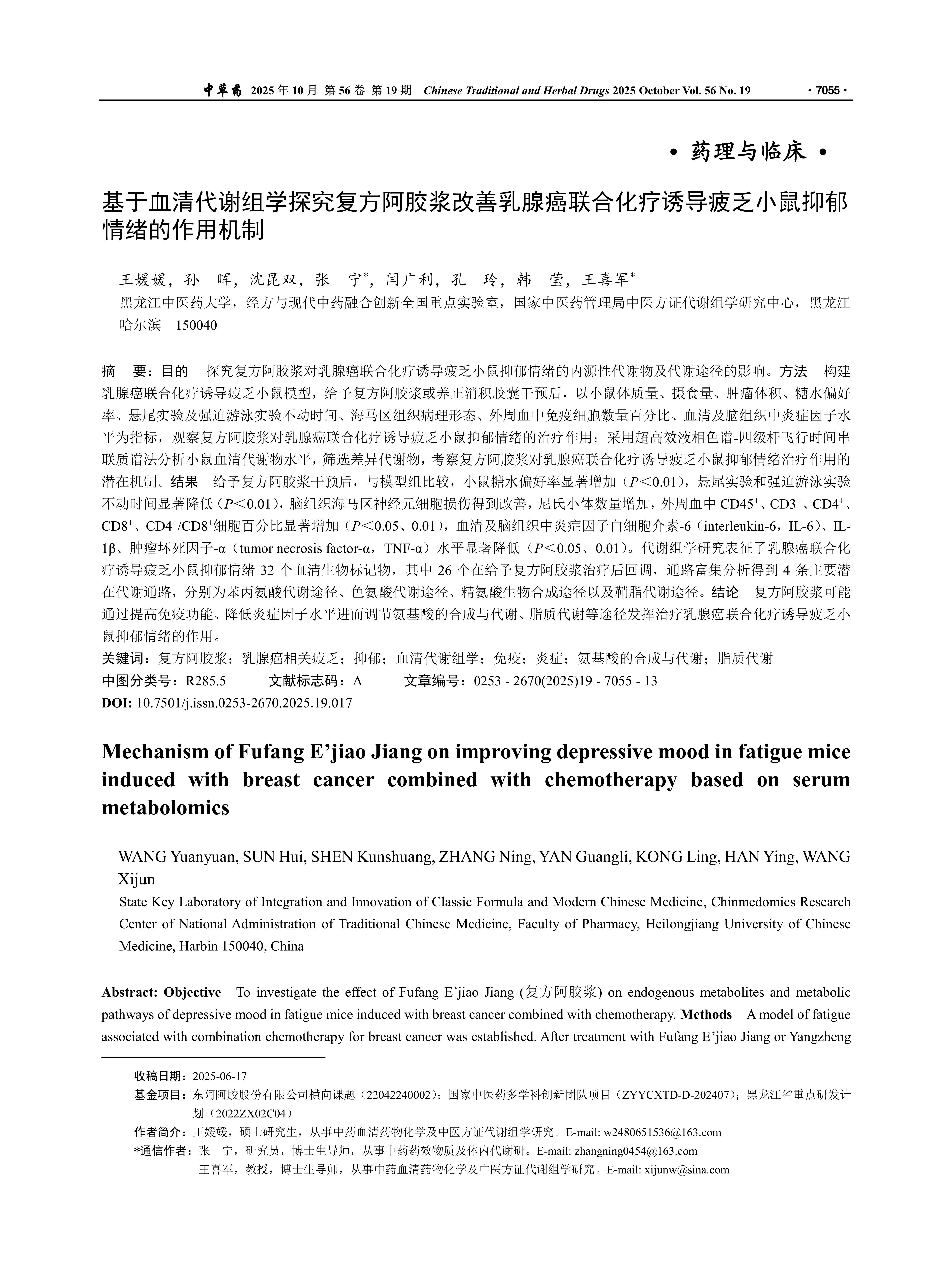 Objective To investigate the effect of Fufang E’jiao Jiang (复方阿胶浆) on endogenous metabolites and metabolic pathways of depressive mood in fatigue mice induced with breast cancer combined with chemotherapy. Methods A model of fatigue associated with combination chemotherapy for breast cancer was established. After treatment with Fufang E’jiao Jiang or Yangzheng Xiaoji Capsules (养正消积胶囊), the following indicators were used to observe the therapeutic effect of Fufang E’jiao Jiang on depressive mood in mice with breast cancer-related fatigue following combination chemotherapy: body weight, food intake, tumor volume, sugar water preference rate, immobility time in the tail suspension test and forced swim test, histopathological morphology of the hippocampus, percentage of immune cells in peripheral blood, and levels of inflammatory factors in serum and brain tissue. Ultra-high-performance liquid chromatography with quadrupole time-of-flight mass spectrometry was used to analyze metabolite levels in serum of mice, the differential metabolites were screened, and the potential mechanism of therapeutic effect of Fufang E’jiao Jiang on depressive mood in fatigue mice with breast cancer undergoing combination chemotherapy was investigated. Results After the administration of Fufang E’jiao Jiang intervention, compared with model group, the preference rate for sugar water in mice was significantly increased (P < 0.01), the immobility time in tail suspension and forced swimming experiments were significantly decreased (P < 0.01), neuronal cell damage in hippocampus of brain tissue was improved, and the number of Nissl bodies was increased, the percentage of CD45+, CD3+, CD4+, CD8+ and CD4+/CD8+ ratio in peripheral blood were significantly increased (P < 0.05, 0.01), the levels of inflammatory factors interleukin-6 (IL-6), IL-1β and tumor necrosis factor-α (TNF-α) in serum and brain tissue were significantly decreased (P < 0.05, 0.01). Metabolomics research characterized 32 serum biomarkers of depressive mood in mice induced by combined chemotherapy for breast cancer, of which 26 were reversed after treatment with Fufang E’jiao Jiang. Pathway enrichment analysis identified four major potential metabolic pathways, namely the phenylalanine metabolic pathway, tryptophan metabolic pathway, arginine biosynthesis pathway and sphingolipid metabolic pathway. Conclusion Fufang E’jiao Jiang may exert its therapeutic effects on depressive mood in fatigue mice with breast cancer combined with chemotherapy by enhancing immune function, reducing inflammatory factor levels, and regulating amino acid synthesis and metabolism, lipid metabolism and other pathways.
