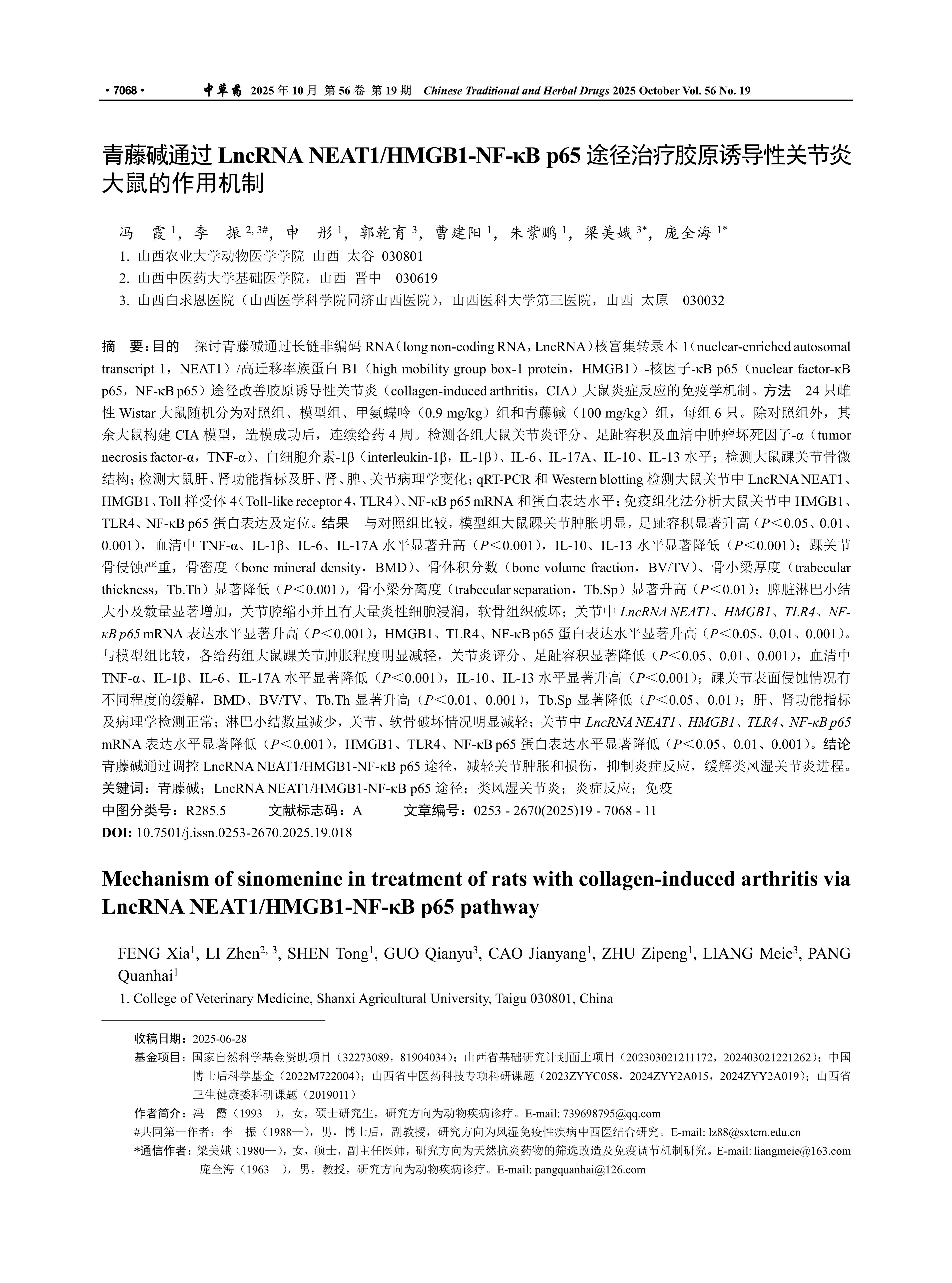 国家自然科学基金资助项目(32273089,81904034);山西省基础研究计划面上项目(202303021211172,202403021221262);中国博士后科学基金(2022M722004);山西省中医药科技专项科研课题(2023ZYYC058,2024ZYY2A015,2024ZYY2A019);山西省卫生健康委科研课题(2019011)