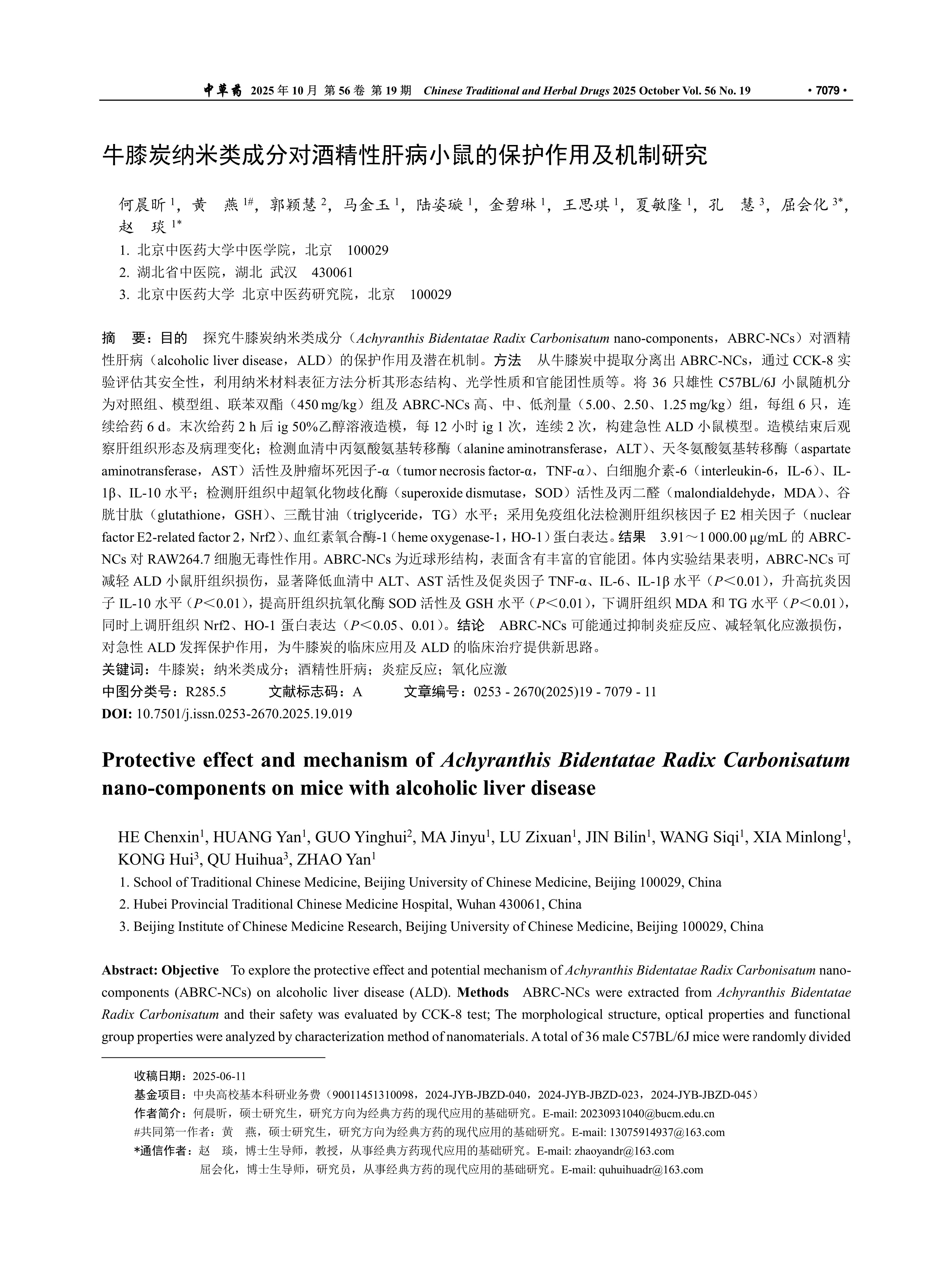 Objective To explore the protective effect and potential mechanism of Achyranthis Bidentatae Radix Carbonisatum nano-components (ABRC-NCs) on alcoholic liver disease (ALD). Methods ABRC-NCs were extracted from Achyranthis Bidentatae Radix Carbonisatum and their safety was evaluated by CCK-8 test; The morphological structure, optical properties and functional group properties were analyzed by characterization method of nanomaterials. A total of 36 male C57BL/6J mice were randomly divided into control group, model group, bifendate (450 mg/kg) group, ABRC-NCs high-, medium- and low-dose (5.00, 2.50, 1.25 mg/kg) groups, with six mice in each group, mice were administered with drugs for 6 d. An acute ALD mouse model was established by gavage of 50% ethanol solution 2 h after the last administration, with gavage every 12 h for 2 consecutive times. The morphology and pathological changes of liver tissue were observed after modeling. The activities of alanine aminotransferase (ALT) and aspartate aminotransferase (AST) as well as the levels of tumor necrosis factor-α (TNF-α), interleukin-6 (IL-6), IL-1β and IL-10 in serum were detected; The activity of superoxide dismutase (SOD) and the levels of malondialdehyde (MDA), glutathione (GSH), triglycerides (TG) in liver tissue were detected ; Immunohistochemistry was used to detect the protein expressions of nuclear factor E2 related factor 2 (Nrf2) and heme oxygenase-1 (HO-1) in liver tissue. Results ABRC-NCs at concentrations of 3.91—1 000.00 μg/mL had no toxic effect on RAW264.7 cells. ABRC-NCs had a nearly spherical structure with abundant functional groups on their surface. The in vivo experimental results showed that ABRC-NCs could alleviate liver tissue damage in ALD mice, significantly reduce activities of ALT, AST and levels of pro-inflammatory factors TNF-α, IL-6 and IL-1β in serum (P < 0.01), increase anti-inflammatory factor IL-10 level (P < 0.01), increase antioxidant enzyme SOD activity and GSH level in liver tissue (P < 0.01), down-regulate levels of MDA and TG in liver tissue (P < 0.01), and up-regulate Nrf2 and HO-1 protein expressions in liver tissue (P < 0.05, 0.01). Conclusion ABRC-NCs may exert a protective effect on acute ALD by inhibiting inflammatory response and reducing oxidative stress damage, providing new ideas for the clinical application of Achyranthis Bidentatae Radix Carbonisatum and the clinical treatment of ALD.